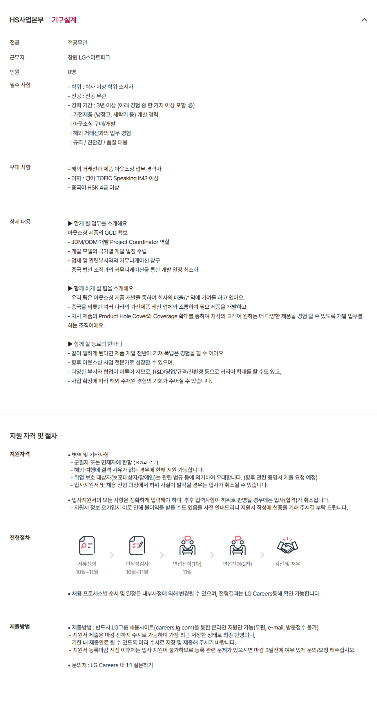 Àü°ø Àü°ø¹«°ü ±Ù¹«Áö â¿ø LG½º¸¶Æ®ÆÄÅ© Àοø 0¸í Çʼö »çÇ× - ÇÐÀ§ : Çлç ÀÌ»ó ÇÐÀ§ ¼ÒÁöÀÚ - Àü°ø : Àü°ø ¹«°ü - °æ·Â ±â°£ : 3³â ÀÌ»ó (¾Æ·¡ °æÇè Áß ÇÑ °¡Áö ÀÌ»ó Æ÷ÇÔ ù±) : °¡ÀüÁ¦Ç° (³ÃÀå°í, ¼¼Å¹±â µî) °³¹ß °æ·Â : ¾Æ¿ô¼Ò½Ì ±¸¸Å/°³¹ß : ÇØ¿Ü °Å·¡¼±°úÀÇ ¾÷¹« °æÇè : ±Ô°Ý / ģȯ°æ / ǰÁú ´ëÀÀ ¿ì´ë »çÇ× - ÇØ¿Ü °Å·¡¼±°ú Á¦Ç° ¾Æ¿ô¼Ò½Ì ¾÷¹« °æ·ÂÀÚ - ¾îÇÐ : ¿µ¾î TOEIC Speaking IM3 ÀÌ»ó - Áß±¹¾î HSK 4±Þ ÀÌ»ó