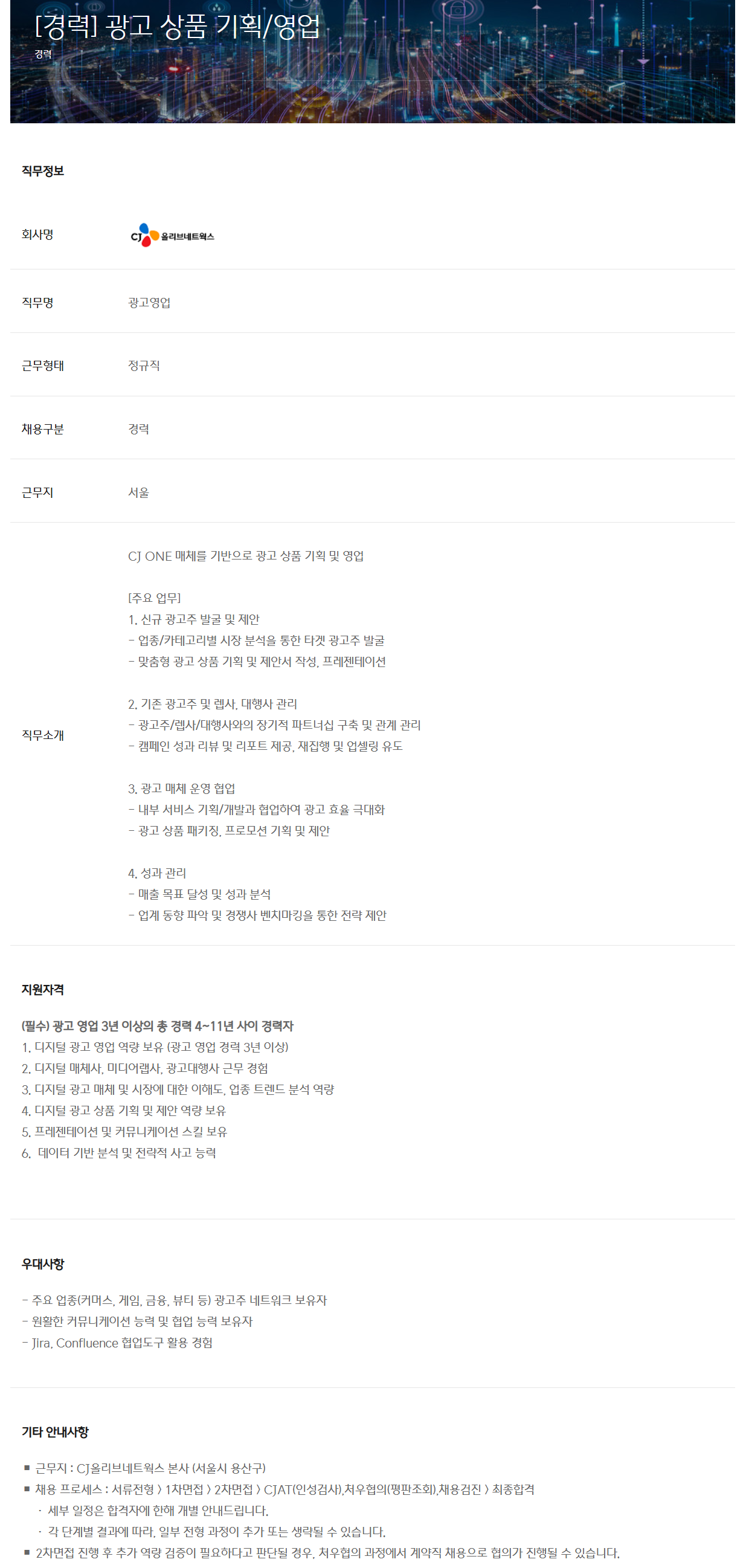 Á÷¹«¼Ò°³ CJ ONE ¸Åü¸¦ ±â¹ÝÀ¸·Î ±¤°í »óǰ ±âȹ ¹× ¿µ¾÷