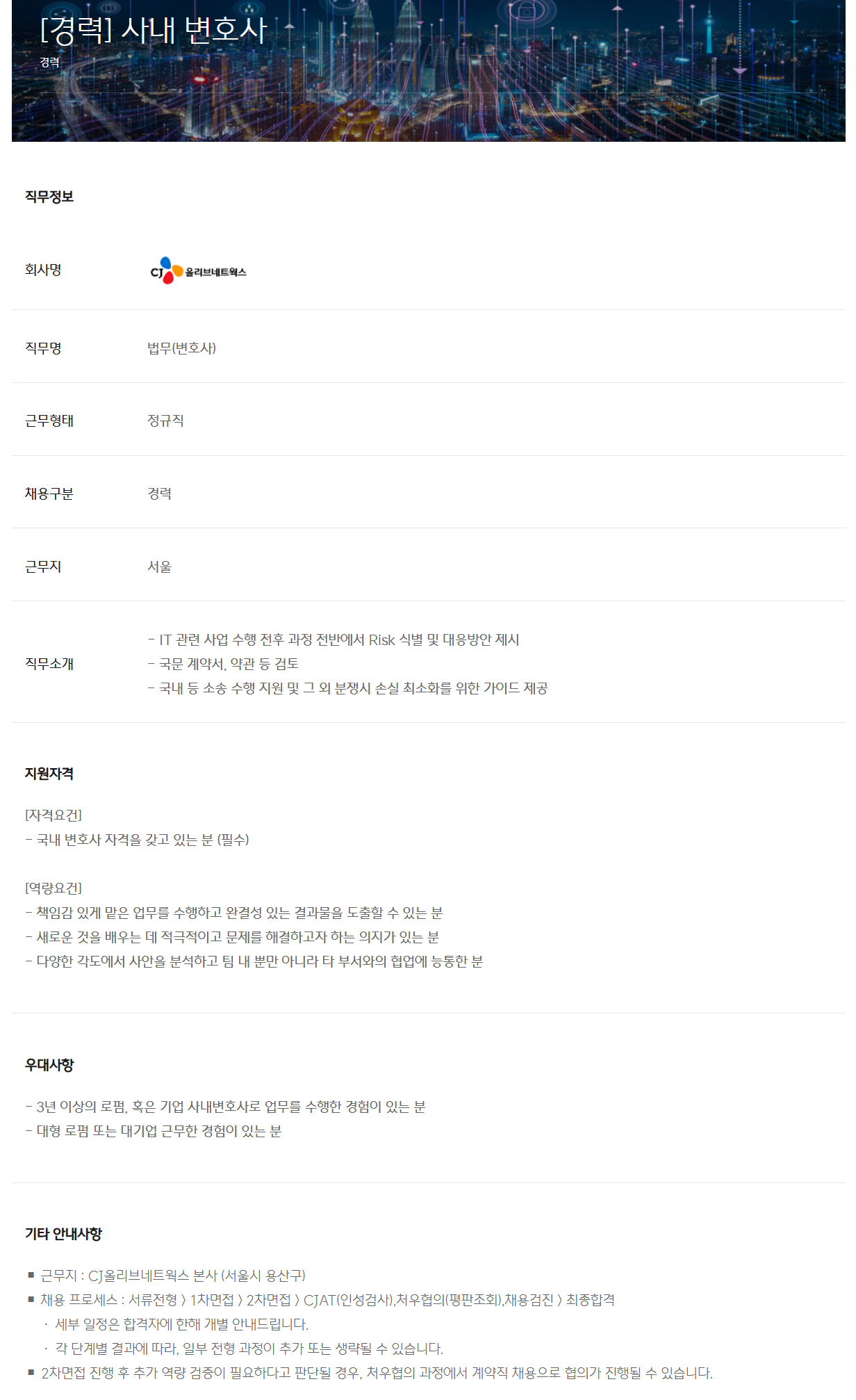 Á÷¹«¸í ¹ý¹«(º¯È£»ç) ±Ù¹«ÇüÅ Á¤±ÔÁ÷ ä¿ë±¸ºÐ °æ·Â ±Ù¹«Áö ¼­¿ï Á÷¹«¼Ò°³ - IT °ü·Ã »ç¾÷ ¼öÇà ÀüÈÄ °úÁ¤ Àü¹Ý¿¡¼­ Risk ½Äº° ¹× ´ëÀÀ¹æ¾È Á¦½Ã - ±¹¹® °è¾à¼­, ¾à°ü µî °ËÅä - ±¹³» µî ¼Ò¼Û ¼öÇà Áö¿ø ¹× ±× ¿Ü ºÐÀï½Ã ¼Õ½Ç ÃÖ¼ÒÈ­¸¦ À§ÇÑ °¡À̵å Á¦°ø Áö¿øÀÚ°Ý [ÀÚ°Ý¿ä°Ç] - ±¹³» º¯È£»ç ÀÚ°ÝÀ» °®°í ÀÖ´Â ºÐ (Çʼö) [¿ª·®¿ä°Ç] - Ã¥ÀÓ°¨ ÀÖ°Ô ¸ÃÀº ¾÷¹«¸¦ ¼öÇàÇÏ°í ¿Ï°á¼º ÀÖ´Â °á°ú¹°À» µµÃâÇÒ ¼ö ÀÖ´Â ºÐ - »õ·Î¿î °ÍÀ» ¹è¿ì´Â µ¥ Àû±ØÀûÀÌ°í ¹®Á¦¸¦ ÇØ°áÇϰíÀÚ ÇÏ´Â ÀÇÁö°¡ ÀÖ´Â ºÐ - ´Ù¾çÇÑ °¢µµ¿¡¼­ »ç¾ÈÀ» ºÐ¼®ÇÏ°í ÆÀ ³» »Ó¸¸ ¾Æ´Ï¶ó Ÿ ºÎ¼­¿ÍÀÇ Çù¾÷¿¡ ´ÉÅëÇÑ ºÐ ¿ì´ë»çÇ× - 3³â ÀÌ»óÀÇ ·ÎÆß, ȤÀº ±â¾÷ »ç³»º¯È£»ç·Î ¾÷¹«¸¦ ¼öÇàÇÑ °æÇèÀÌ ÀÖ´Â ºÐ - ´ëÇü ·ÎÆß ¶Ç´Â ´ë±â¾÷ ±Ù¹«ÇÑ °æÇèÀÌ ÀÖ´Â ºÐ ±âŸ ¾È³»»çÇ× ◼ ±Ù¹«Áö : CJ¿Ã¸®ºê³×Æ®¿÷½º º»»ç (¼­¿ï½Ã ¿ë»ê±¸) ◼ ä¿ë ÇÁ·Î¼¼½º : ¼­·ùÀüÇü > 1Â÷¸éÁ¢ > 2Â÷¸éÁ¢ > CJAT(Àμº°Ë»ç),ó¿ìÇùÀÇ(ÆòÆÇÁ¶È¸),ä¿ë°ËÁø > ÃÖÁ¾ÇÕ°Ý • ¼¼ºÎ ÀÏÁ¤Àº ÇÕ°ÝÀÚ¿¡ ÇÑÇØ °³º° ¾È³»µå¸³´Ï´Ù. • °¢ ´Ü°èº° °á°ú¿¡ µû¶ó, ÀϺΠÀüÇü °úÁ¤ÀÌ Ãß°¡ ¶Ç´Â »ý·«µÉ ¼ö ÀÖ½À´Ï´Ù. ◼ 2Â÷¸éÁ¢ ÁøÇà ÈÄ Ãß°¡ ¿ª·® °ËÁõÀÌ ÇÊ¿äÇÏ´Ù°í ÆÇ´ÜµÉ °æ¿ì, ó¿ìÇùÀÇ °úÁ¤¿¡¼­ °è¾àÁ÷ ä¿ëÀ¸·Î ÇùÀǰ¡ ÁøÇàµÉ ¼ö ÀÖ½À´Ï´Ù.