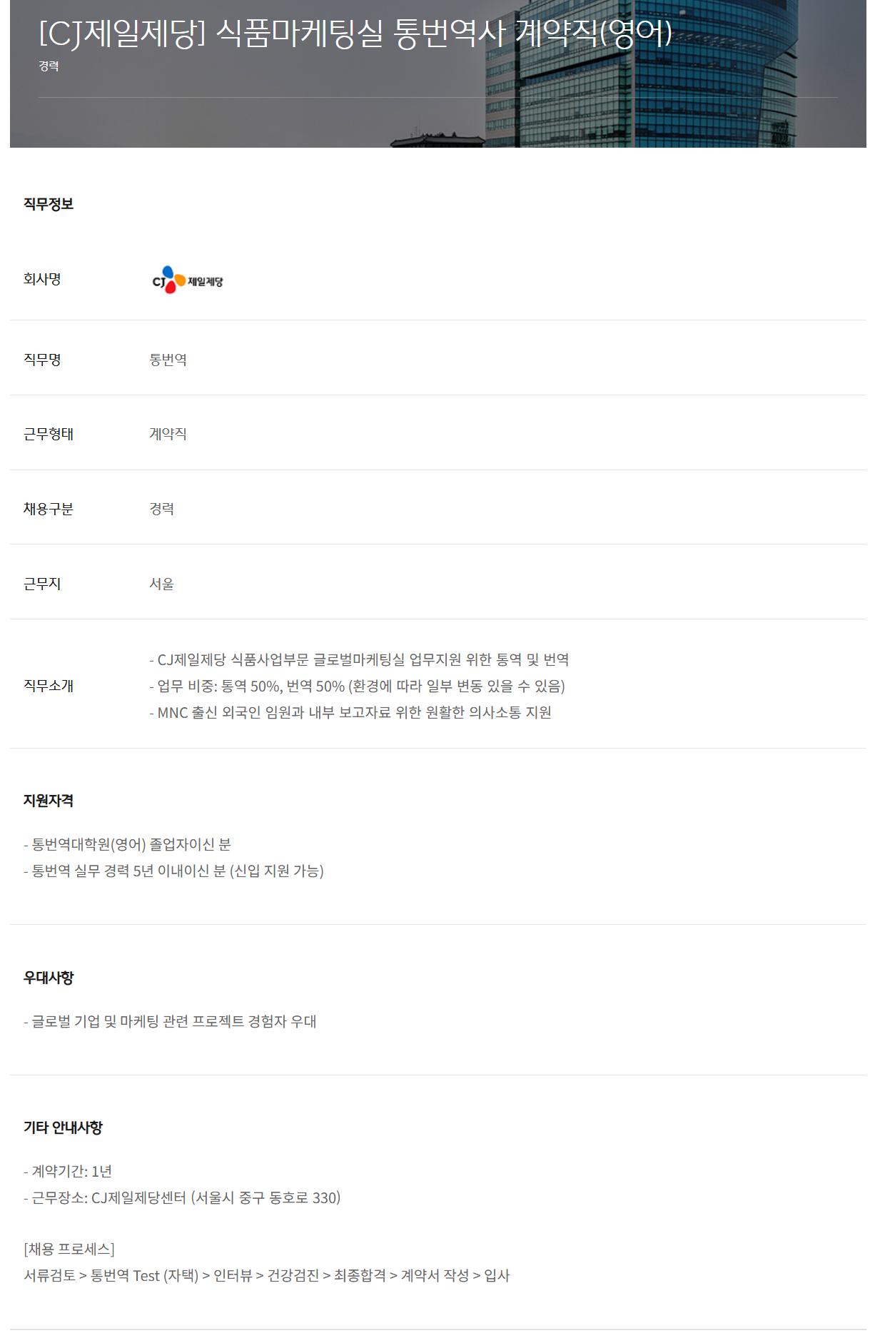 - ±Ù¹«Àå¼Ò: CJÁ¦ÀÏÁ¦´ç¼¾ÅÍ (¼¿ï½Ã Áß±¸ µ¿È£·Î 330)