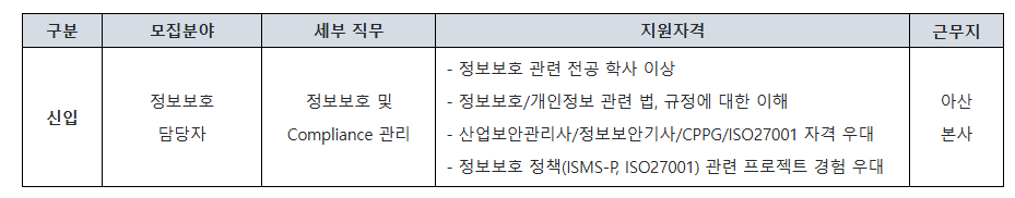 [½ÅÀÔ] Á¤º¸º¸È£ ´ã´çÀÚ ¸ðÁý ±¸ºÐ ¸ðÁýºÐ¾ß ¼¼ºÎ Á÷¹« Áö¿øÀÚ°Ý ±Ù¹«Áö ½ÅÀÔ Á¤º¸º¸È£ ´ã´çÀÚ Á¤º¸º¸È£ ¹× Compliance °ü¸® - Á¤º¸º¸È£ °ü·Ã Àü°ø Çлç ÀÌ»ó - Á¤º¸º¸È£/°³ÀÎÁ¤º¸ °ü·Ã ¹ý, ±ÔÁ¤¿¡ ´ëÇÑ ÀÌÇØ - »ê¾÷º¸¾È°ü¸®»ç/Á¤º¸º¸¾È±â»ç/CPPG/ISO27001 ÀÚ°Ý ¿ì´ë - Á¤º¸º¸È£ Á¤Ã¥(ISMS-P, ISO27001) °ü·Ã ÇÁ·ÎÁ§Æ® °æÇè ¿ì´ë ¾Æ»ê º»»ç