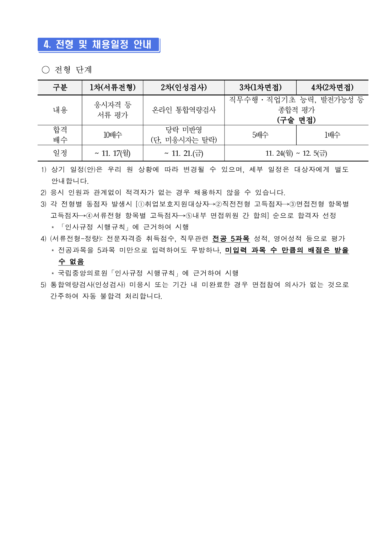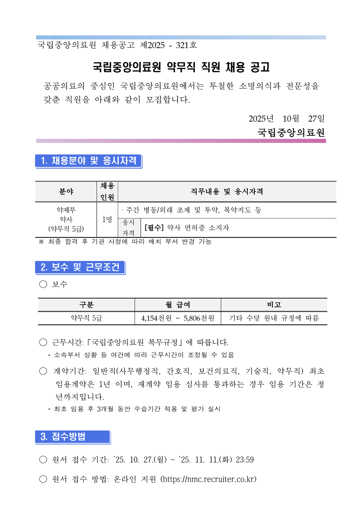 ±¹¸³Áß¾ÓÀÇ·á¿ø ä¿ë°ø°í Á¦2025 - 321È£ ±¹¸³Áß¾ÓÀÇ·á¿ø ¾à¹«Á÷ Á÷¿ø ä¿ë °ø°í °ø°øÀÇ·áÀÇ Áß½ÉÀÎ ±¹¸³Áß¾ÓÀÇ·á¿ø¿¡¼´Â ÅõöÇÑ ¼Ò¸íÀǽİú Àü¹®¼ºÀ»°®Ãá Á÷¿øÀ» ¾Æ·¡¿Í °°ÀÌ ¸ðÁýÇÕ´Ï´Ù. 2025³â 10¿ù 27Àϱ¹¸³Áß¾ÓÀÇ·á¿ø1. ä¿ëºÐ¾ß ¹× ÀÀ½ÃÀÚ°Ý ºÐ¾ß ä¿ë Àοø Á÷¹«³»¿ë ¹× ÀÀ½ÃÀÚ°Ý ¾àÁ¦ºÎ ¾à»ç (¾à¹«Á÷ 5±Þ) 1¸í ¤ýÁÖ°£ º´µ¿/¿Ü·¡ Á¶Á¦ ¹× Åõ¾à, º¹¾àÁöµµ µî ÀÀ½Ã ÀÚ°Ý [Çʼö] ¾à»ç ¸éÇãÁõ ¼ÒÁöÀÚ ¡Ø ÃÖÁ¾ ÇÕ°Ý ÈÄ ±â°ü »çÁ¤¿¡ µû¶ó ¹èÄ¡ ºÎ¼ º¯°æ °¡´É 2. º¸¼ö ¹× ±Ù¹«Á¶°Ç ¡Û º¸¼ö ±¸ºÐ ¿ù ±Þ¿© ºñ°í ¾à¹«Á÷ 5±Þ 4,154õ¿ø ~ 5,806õ¿ø ±âŸ ¼ö´ç ¿ø³» ±ÔÁ¤¿¡ µû¸§¡Û ±Ù¹«½Ã°£:¡¸±¹¸³Áß¾ÓÀÇ·á¿ø º¹¹«±ÔÁ¤¡¹¿¡ µû¸¨´Ï´Ù. * ¼Ò¼ÓºÎ¼ »óȲ µî ¿©°Ç¿¡ µû¶ó ±Ù¹«½Ã°£ÀÌ Á¶Á¤µÉ ¼ö ÀÖÀ½ ¡Û °è¾à±â°£: ÀϹÝÁ÷(»ç¹«ÇàÁ¤Á÷, °£È£Á÷, º¸°ÇÀÇ·áÁ÷, ±â¼úÁ÷, ¾à¹«Á÷) ÃÖÃÊ ÀÓ¿ë°è¾àÀº 1³â À̸ç, Àç°è¾à ÀÓ¿ë ½É»ç¸¦ Åë°úÇÏ´Â °æ¿ì ÀÓ¿ë ±â°£Àº Á¤³â±îÁöÀÔ´Ï´Ù. * ÃÖÃÊ ÀÓ¿ë ÈÄ 3°³¿ù µ¿¾È ¼ö½À±â°£ Àû¿ë ¹× Æò°¡ ½Ç½Ã 3. Á¢¼ö¹æ¹ý ¡Û ¿ø¼ Á¢¼ö ±â°£: ¡¯25. 10. 27.(¿ù) ~ ¡¯25. 11. 11.(È) 23:59 ¡Û ¿ø¼ Á¢¼ö ¹æ¹ý: ¿Â¶óÀÎ Áö¿ø (https://nmc.recruiter.co.kr)