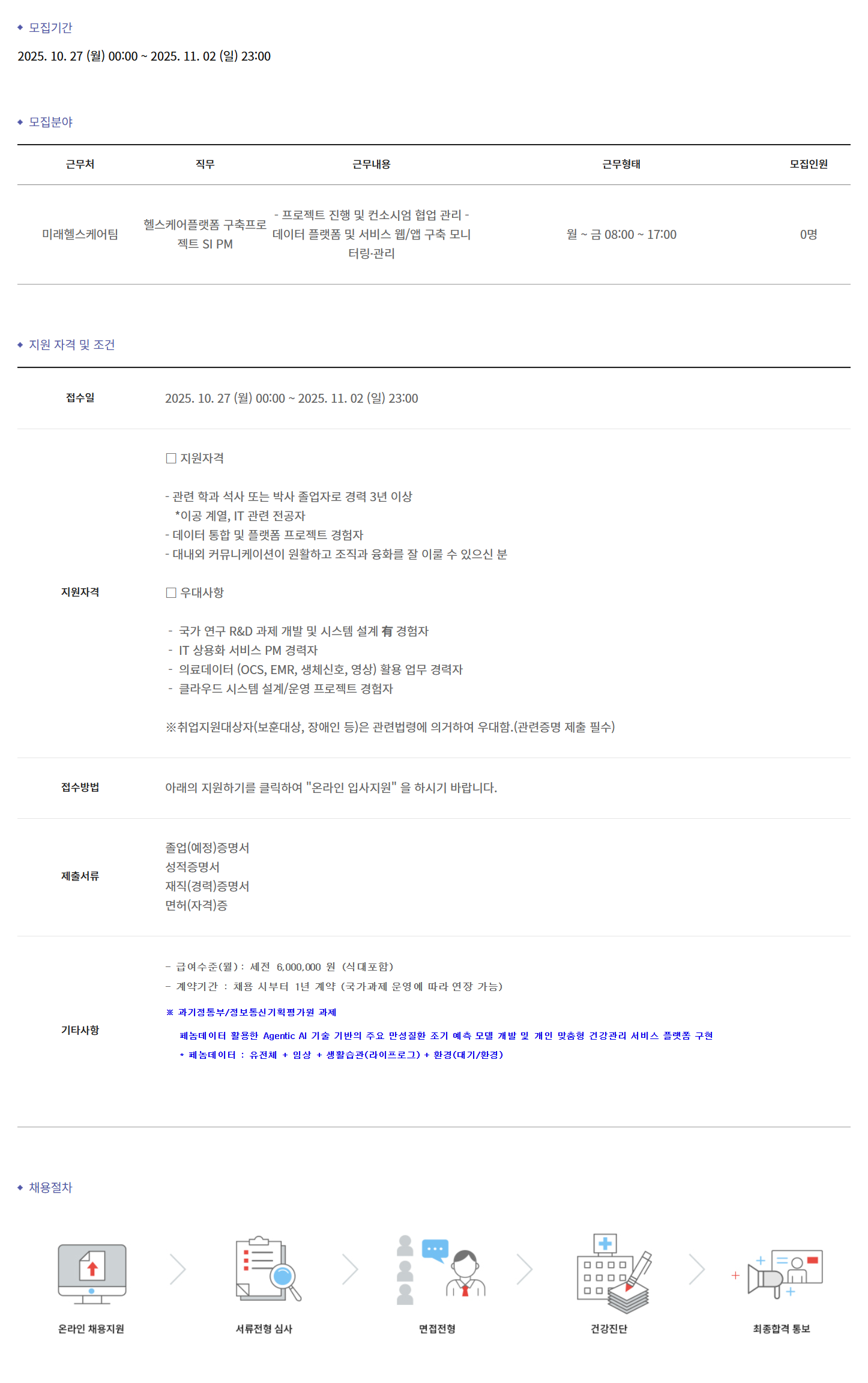 ±Ù¹«Ã³ Á÷¹« ±Ù¹«³»¿ë ±Ù¹«ÇüÅ ¸ðÁýÀοø ¹Ì·¡ÇコÄɾîÆÀ ÇコÄɾîÇ÷§Æû ±¸ÃàÇÁ·ÎÁ§Æ® SI PM - ÇÁ·ÎÁ§Æ® ÁøÇà ¹× ÄÁ¼Ò½Ã¾ö Çù¾÷ °ü¸® - µ¥ÀÌÅÍ Ç÷§Æû ¹× ¼ºñ½º À¥/¾Û ±¸Ãà ¸ð´ÏÅ͸µ∙°ü¸® ¿ù ~ ±Ý 08:00 ~ 17:00 0¸í
