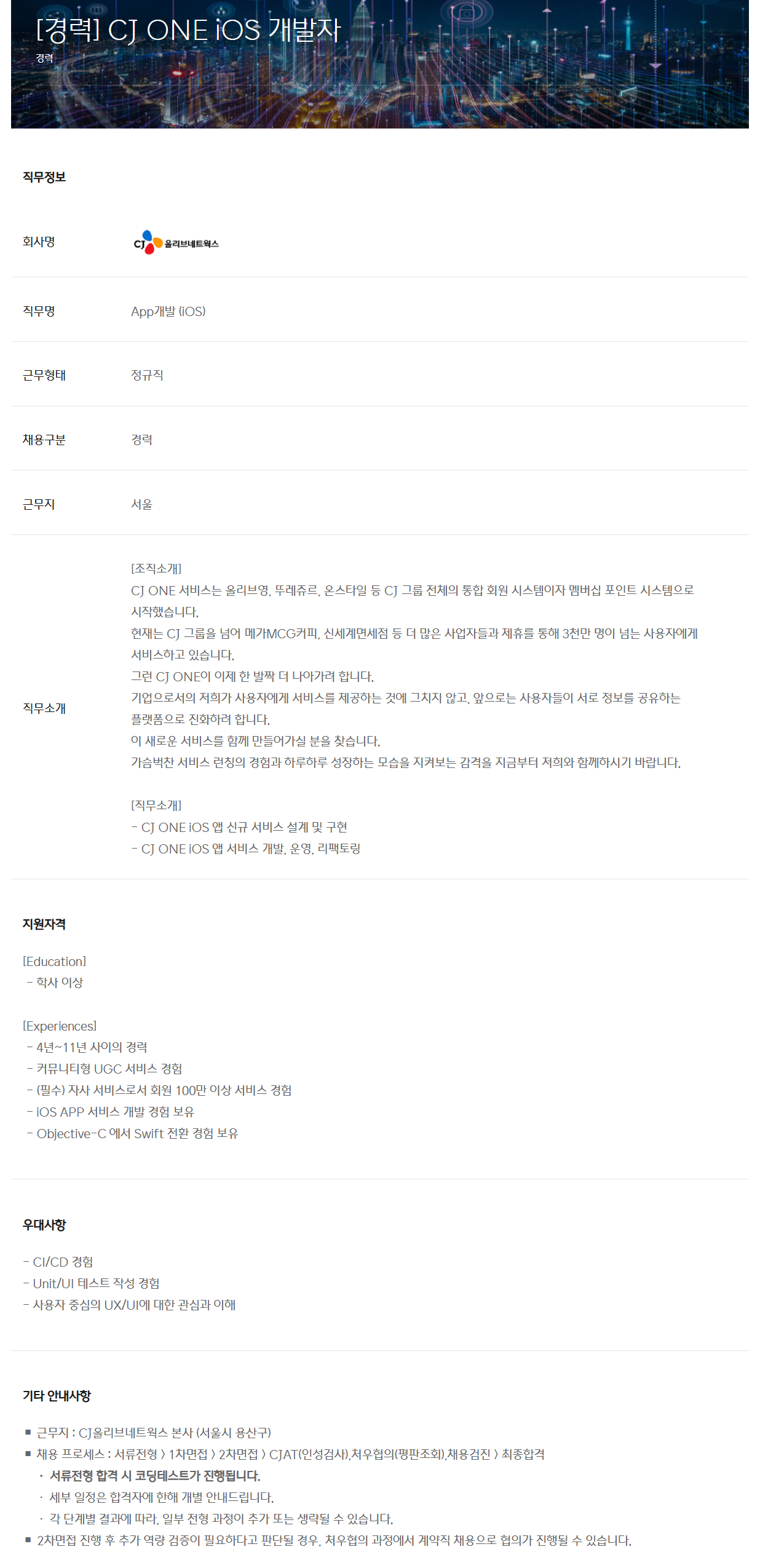 ◼ ±Ù¹«Áö : CJ¿Ã¸®ºê³×Æ®¿÷½º º»»ç (¼¿ï½Ã ¿ë»ê±¸)