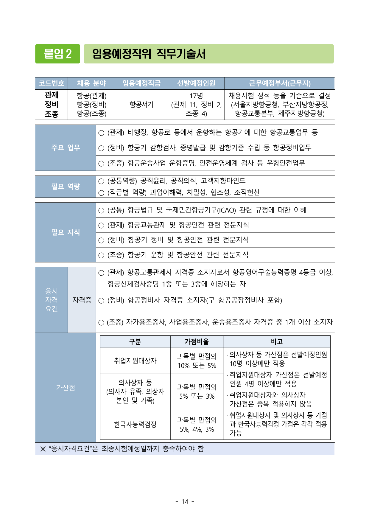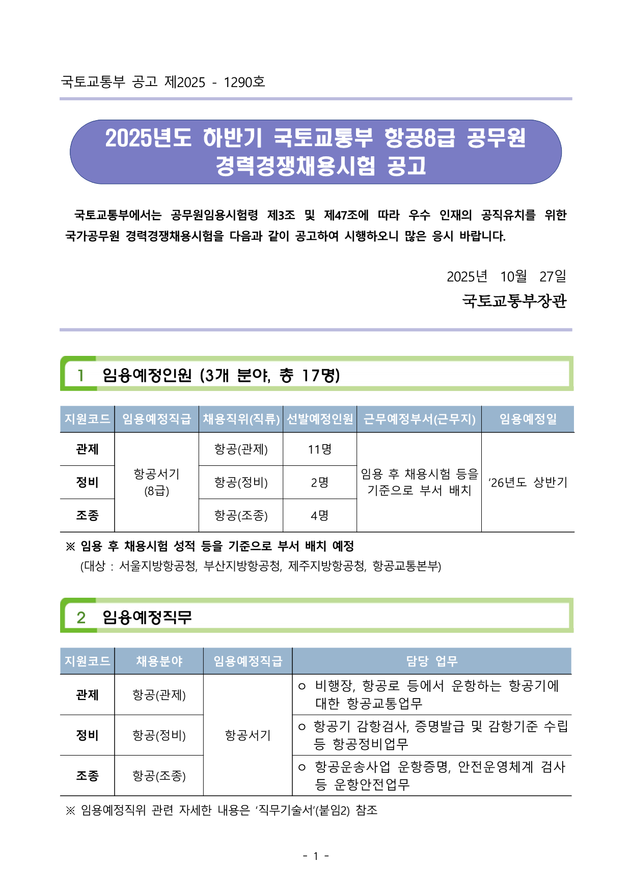 ±¹Åä±³ÅëºÎ °ø°í Á¦2025 - 1290È£ 2025³âµµ ÇϹݱ⠱¹Åä±³ÅëºÎ Ç×°ø8±Þ °ø¹«¿ø °æ·Â°æÀïä¿ë½ÃÇè °ø°í ±¹Åä±³ÅëºÎ¿¡¼´Â °ø¹«¿øÀÓ¿ë½ÃÇè·É Á¦3Á¶ ¹× Á¦47Á¶¿¡ µû¶ó ¿ì¼ö ÀÎÀçÀÇ °øÁ÷À¯Ä¡¸¦ À§ÇÑ ±¹°¡°ø¹«¿ø °æ·Â°æÀïä¿ë½ÃÇèÀ» ´ÙÀ½°ú °°ÀÌ °ø°íÇÏ¿© ½ÃÇàÇÏ¿À´Ï ¸¹Àº ÀÀ½Ã ¹Ù¶ø´Ï´Ù. 2025³â 10¿ù 27Àϱ¹Åä±³ÅëºÎÀå°ü1 Àӿ뿹Á¤Àοø (3°³ ºÐ¾ß, ÃÑ 17¸í) Áö¿øÄÚµå Àӿ뿹Á¤Á÷±Þ ä¿ëÁ÷À§(Á÷·ù) ¼±¹ß¿¹Á¤Àοø ±Ù¹«¿¹Á¤ºÎ¼(±Ù¹«Áö) Àӿ뿹Á¤ÀϰüÁ¦ Ç×°ø¼±â (8±Þ) Ç×°ø(°üÁ¦) 11¸í ÀÓ¿ë ÈÄ Ã¤¿ë½ÃÇè µîÀ» ±âÁØÀ¸·Î ºÎ¼ ¹èÄ¡ Á¤ºñ Ç×°ø(Á¤ºñ) 2¸í ¡®26³âµµ »ó¹Ý±âÁ¶Á¾ Ç×°ø(Á¶Á¾) 4¸í ¡Ø ÀÓ¿ë ÈÄ Ã¤¿ë½ÃÇè ¼ºÀû µîÀ» ±âÁØÀ¸·Î ºÎ¼ ¹èÄ¡ ¿¹Á¤ (´ë»ó : ¼¿ïÁö¹æÇ×°øÃ», ºÎ»êÁö¹æÇ×°øÃ», Á¦ÁÖÁö¹æÇ×°øÃ», Ç×°ø±³Å뺻ºÎ) 2 Àӿ뿹Á¤Á÷¹« Áö¿øÄÚµå ä¿ëºÐ¾ß Àӿ뿹Á¤Á÷±Þ ´ã´ç ¾÷¹« °üÁ¦ Ç×°ø(°üÁ¦) Ç×°ø¼±â ¤· ºñÇàÀå, Ç×°ø·Î µî¿¡¼ ¿îÇ×ÇÏ´Â Ç×°ø±â¿¡ ´ëÇÑ Ç×°ø±³Åë¾÷¹« Á¤ºñ Ç×°ø(Á¤ºñ) ¤· Ç×°ø±â °¨Ç×°Ë»ç, Áõ¸í¹ß±Þ ¹× °¨Ç×±âÁØ ¼ö¸³µî Ç×°øÁ¤ºñ¾÷¹« Á¶Á¾ Ç×°ø(Á¶Á¾) ¤· Ç×°ø¿î¼Û»ç¾÷ ¿îÇ×Áõ¸í, ¾ÈÀü¿î¿µÃ¼°è °Ë»çµî ¿îÇ×¾ÈÀü¾÷¹« ¡Ø Àӿ뿹Á¤Á÷À§ °ü·Ã ÀÚ¼¼ÇÑ ³»¿ëÀº ¡®Á÷¹«±â¼ú¼¡¯(ºÙÀÓ2) ÂüÁ¶