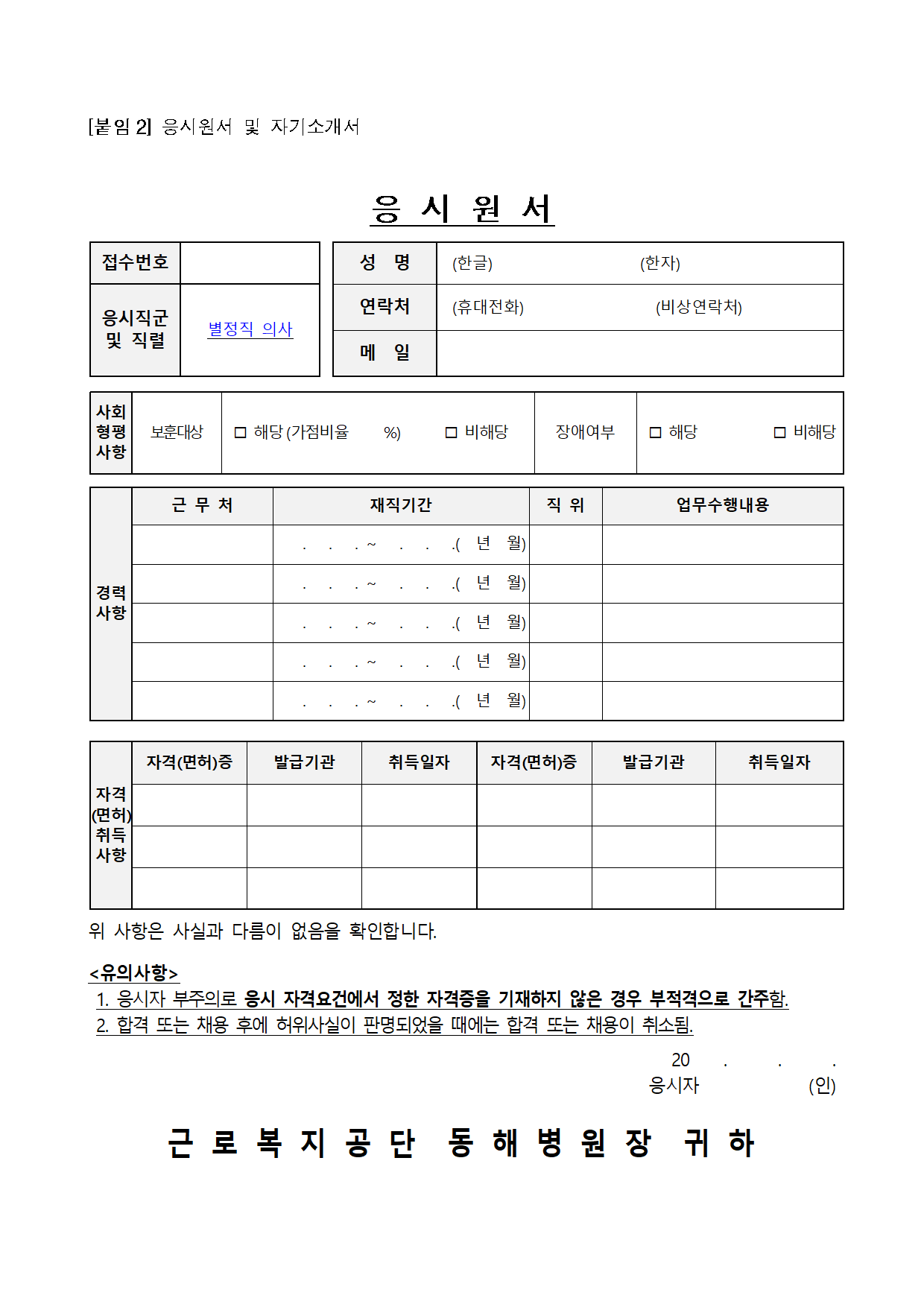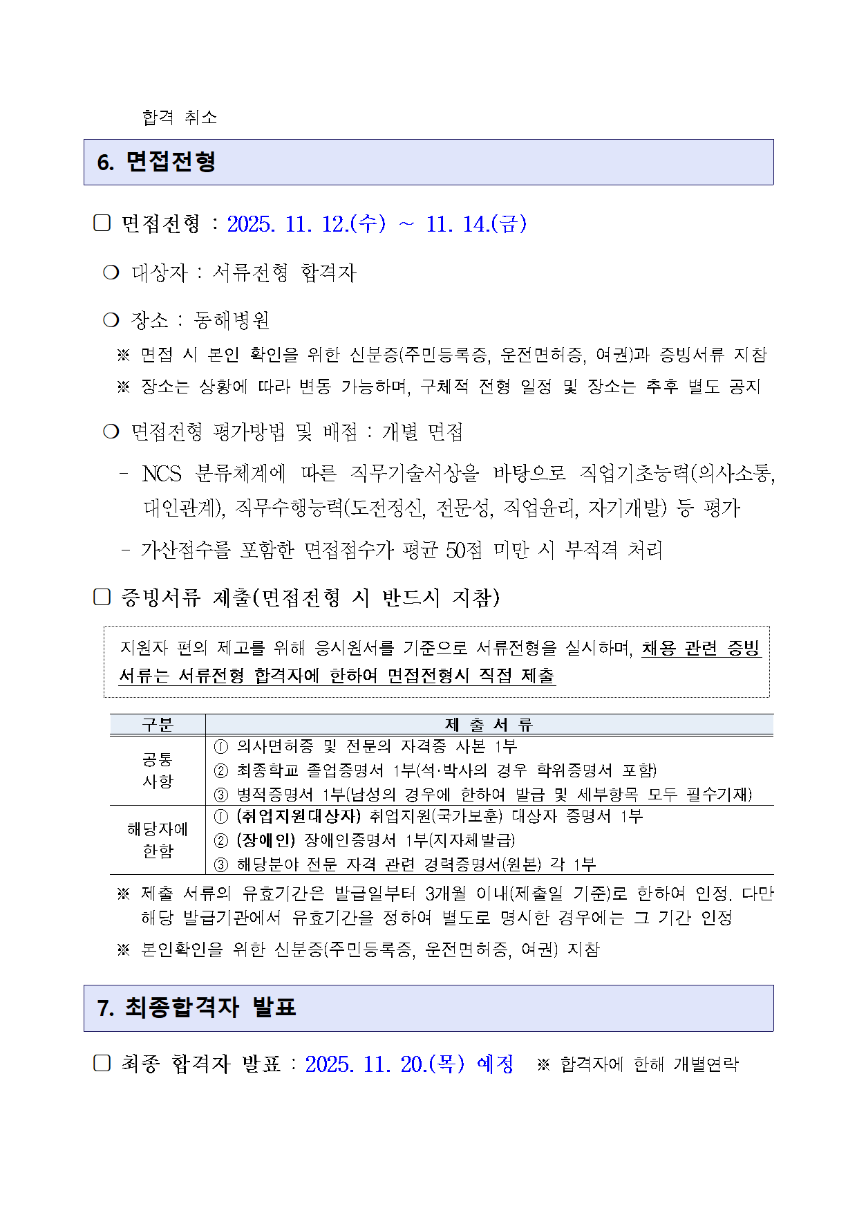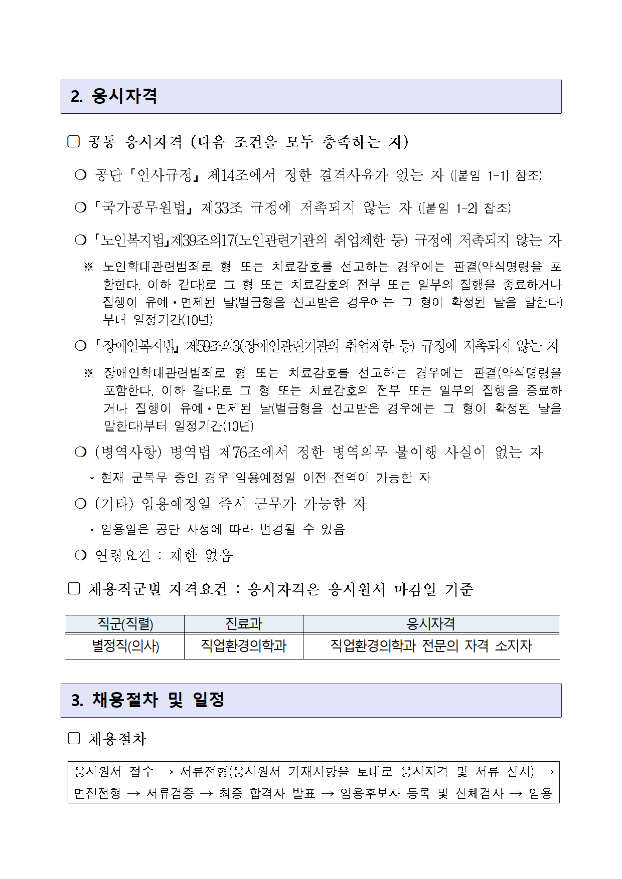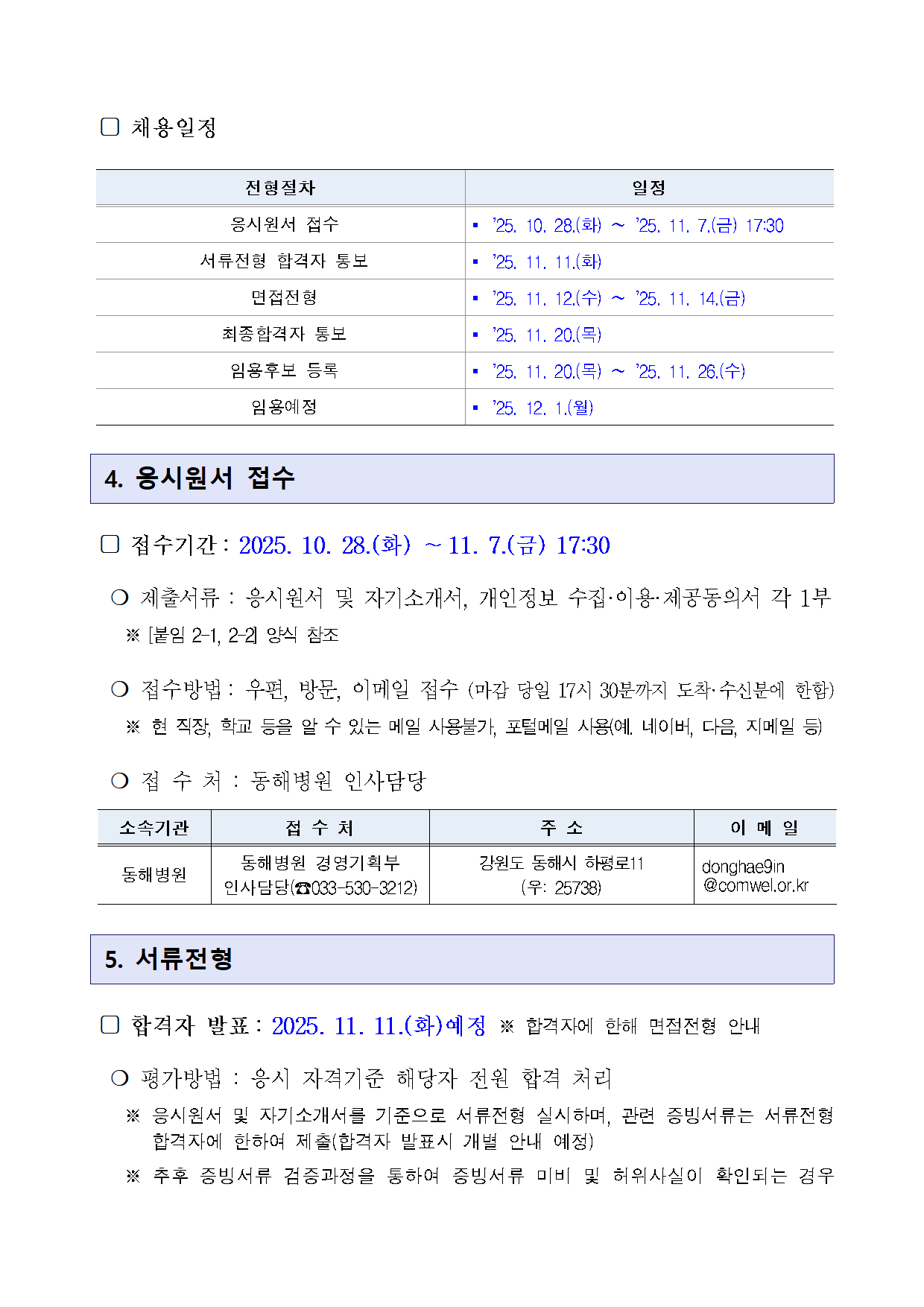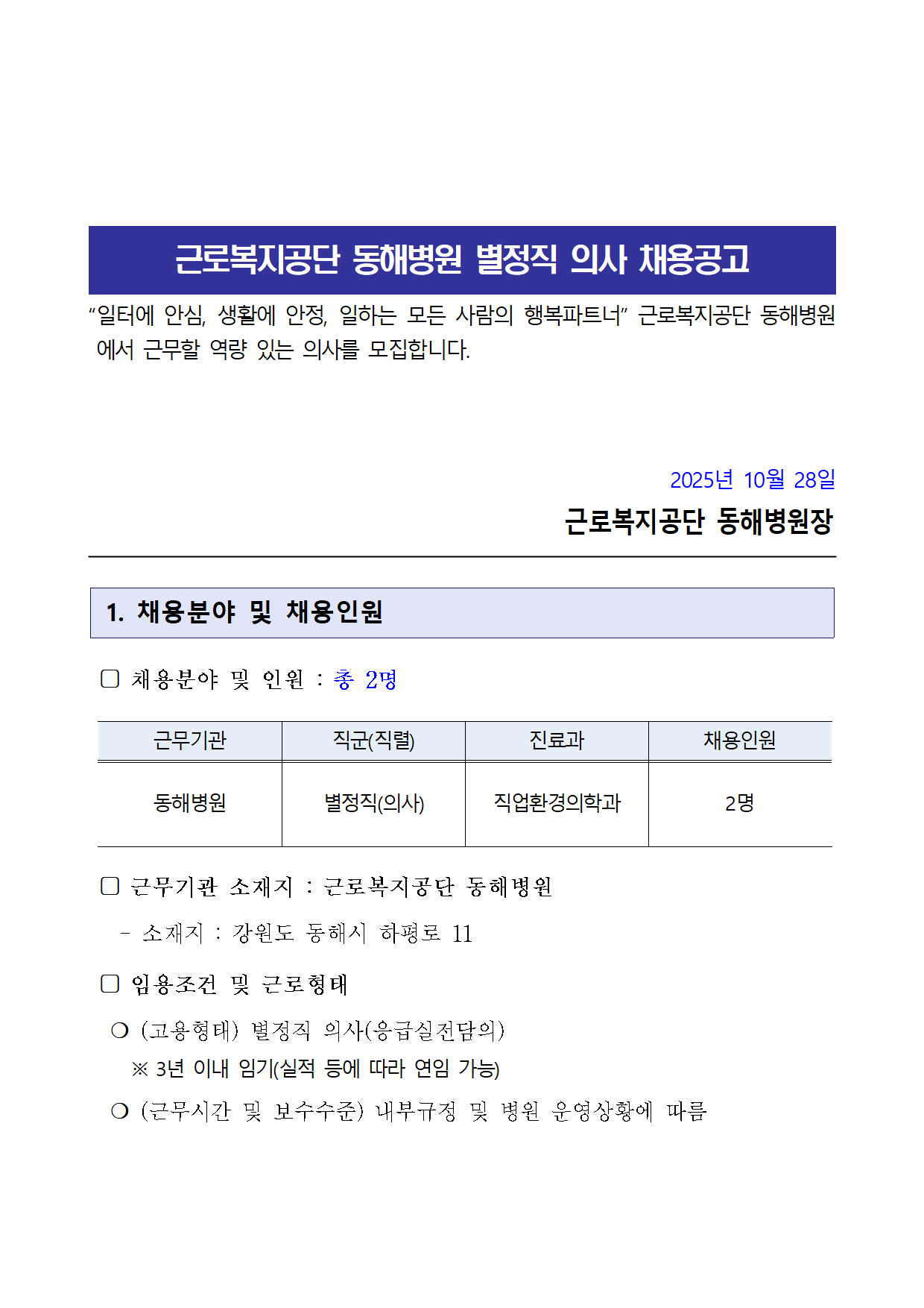 ±Ù·Îº¹Áö°ø´Ü µ¿Çغ´¿ø º°Á¤Á÷ ÀÇ»ç ä¿ë°ø°í ¡°ÀÏÅÍ¿¡ ¾È½É, »ýȰ¿¡ ¾ÈÁ¤, ÀÏÇÏ´Â ¸ðµç »ç¶÷ÀÇ ÇູÆÄÆ®³Ê¡± ±Ù·Îº¹Áö°ø´Ü µ¿Çغ´¿ø ¿¡¼ ±Ù¹«ÇÒ ¿ª·® ÀÖ´Â Àǻ縦 ¸ðÁýÇÕ´Ï´Ù. 2025³â 10¿ù 28ÀÏ ±Ù·Îº¹Áö°ø´Ü µ¿Çغ´¿øÀå 1. ä¿ëºÐ¾ß ¹× ä¿ëÀοø ▢ ä¿ëºÐ¾ß ¹× Àοø : ÃÑ 2¸í ±Ù¹«±â°ü Á÷±º(Á÷·Ä) Áø·á°ú ä¿ëÀοø µ¿Çغ´¿ø º°Á¤Á÷(ÀÇ»ç) Á÷¾÷ȯ°æÀÇÇаú 2¸í ▢ ±Ù¹«±â°ü ¼ÒÀçÁö : ±Ù·Îº¹Áö°ø´Ü µ¿Çغ´¿ø - ¼ÒÀçÁö : °¿øµµ µ¿Çؽà ÇÏÆò·Î 11 ▢ ÀÓ¿ëÁ¶°Ç ¹× ±Ù·ÎÇüÅ ❍ (°í¿ëÇüÅÂ) º°Á¤Á÷ ÀÇ»ç(ÀÀ±Þ½ÇÀü´ãÀÇ) ¡Ø 3³â À̳» ÀÓ±â(½ÇÀû µî¿¡ µû¶ó ¿¬ÀÓ °¡´É) ❍ (±Ù¹«½Ã°£ ¹× º¸¼ö¼öÁØ) ³»ºÎ±ÔÁ¤ ¹× º´¿ø ¿î¿µ»óȲ¿¡ µû¸§