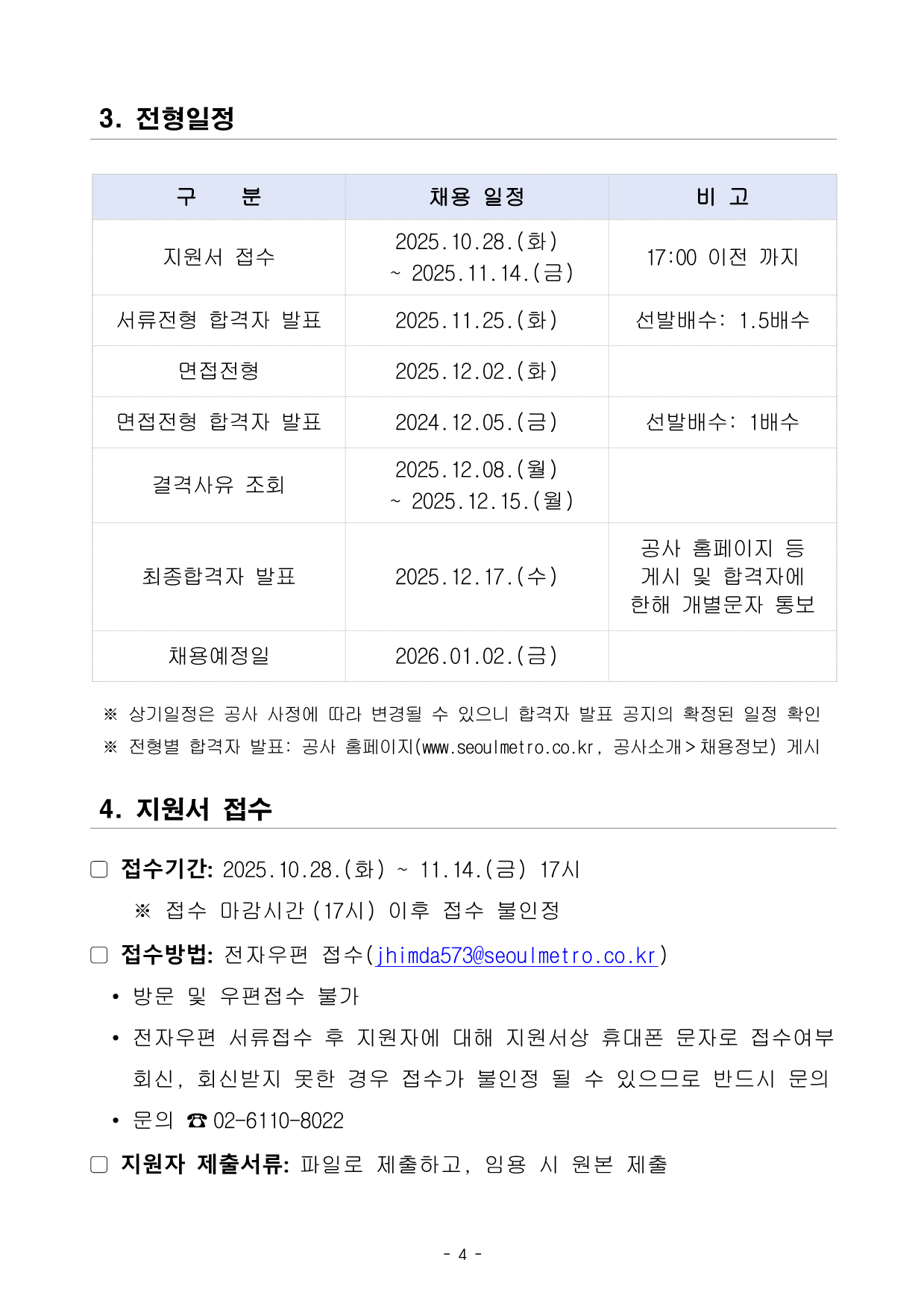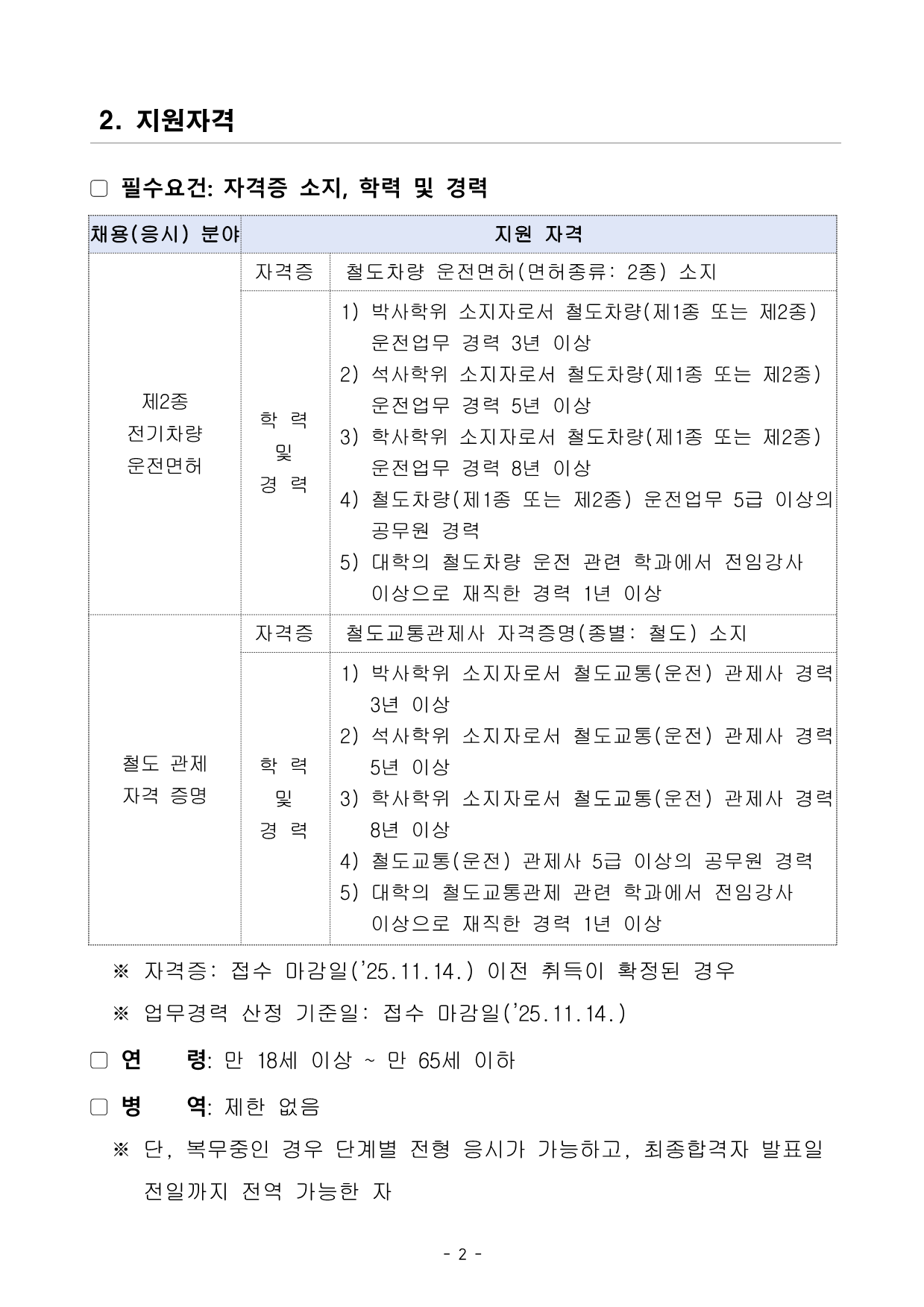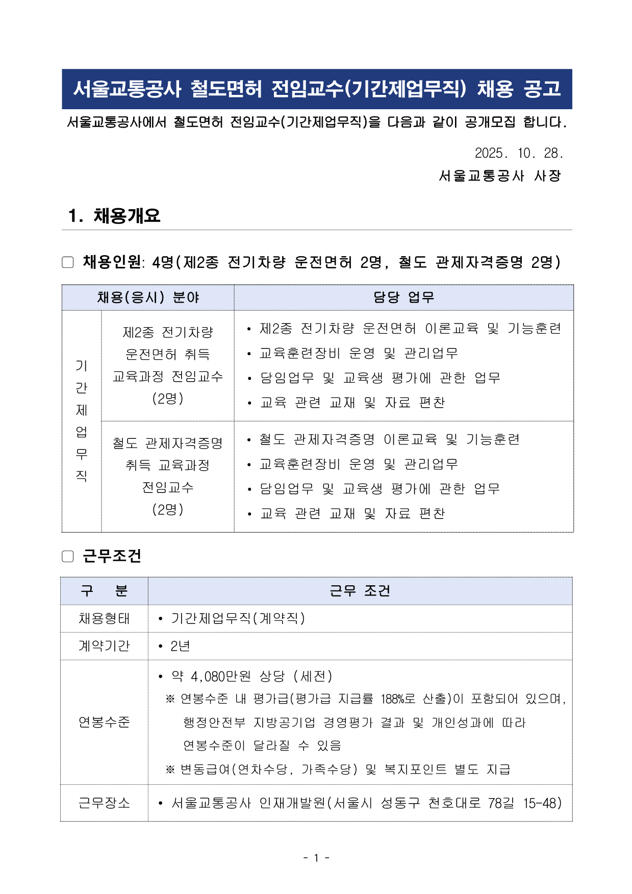 ¼¿ï±³Åë°ø»ç öµµ¸éÇã ÀüÀÓ±³¼ö(±â°£Á¦¾÷¹«Á÷) ä¿ë °ø°í¼¿ï±³Åë°ø»ç¿¡¼ öµµ¸éÇã ÀüÀÓ±³¼ö(±â°£Á¦¾÷¹«Á÷)À» ´ÙÀ½°ú °°ÀÌ °ø°³¸ðÁý ÇÕ´Ï´Ù. 2025. 10. 28. ¼¿ï±³Åë°ø»ç »çÀå 1. ä¿ë°³¿ä ▢ ä¿ëÀοø: 4¸í(Á¦2Á¾ Àü±âÂ÷·® ¿îÀü¸éÇã 2¸í, öµµ °üÁ¦ÀÚ°ÝÁõ¸í 2¸í) ä¿ë(ÀÀ½Ã) ºÐ¾ß ´ã´ç ¾÷¹« ±â °£ Á¦ ¾÷ ¹« Á÷ Á¦2Á¾ Àü±âÂ÷·® ¿îÀü¸éÇã Ãëµæ ±³À°°úÁ¤ ÀüÀÓ±³¼ö (2¸í) • Á¦2Á¾ Àü±âÂ÷·® ¿îÀü¸éÇã À̷б³À° ¹× ±â´ÉÈÆ·Ã • ±³À°ÈÆ·ÃÀåºñ ¿î¿µ ¹× °ü¸®¾÷¹« • ´ãÀÓ¾÷¹« ¹× ±³À°»ý Æò°¡¿¡ °üÇÑ ¾÷¹« • ±³À° °ü·Ã ±³Àç ¹× ÀÚ·á ÆíÂù öµµ °üÁ¦ÀÚ°ÝÁõ¸í Ãëµæ ±³À°°úÁ¤ ÀüÀÓ±³¼ö (2¸í) • öµµ °üÁ¦ÀÚ°ÝÁõ¸í À̷б³À° ¹× ±â´ÉÈÆ·Ã • ±³À°ÈÆ·ÃÀåºñ ¿î¿µ ¹× °ü¸®¾÷¹« • ´ãÀÓ¾÷¹« ¹× ±³À°»ý Æò°¡¿¡ °üÇÑ ¾÷¹« • ±³À° °ü·Ã ±³Àç ¹× ÀÚ·á ÆíÂù ▢ ±Ù¹«Á¶°Ç ±¸ ºÐ ±Ù¹« Á¶°Ç ä¿ëÇüÅ • ±â°£Á¦¾÷¹«Á÷(°è¾àÁ÷) °è¾à±â°£ • 2³â ¿¬ºÀ¼öÁØ • ¾à 4,080¸¸¿ø »ó´ç (¼¼Àü) ¡Ø ¿¬ºÀ¼öÁØ ³» Æò°¡±Þ(Æò°¡±Þ Áö±Þ·ü 188%·Î »êÃâ)ÀÌ Æ÷ÇԵǾî ÀÖÀ¸¸ç, ÇàÁ¤¾ÈÀüºÎ Áö¹æ°ø±â¾÷ °æ¿µÆò°¡ °á°ú ¹× °³Àμº°ú¿¡ µû¶ó ¿¬ºÀ¼öÁØÀÌ ´Þ¶óÁú ¼ö ÀÖÀ½ ¡Ø º¯µ¿±Þ¿©(¿¬Â÷¼ö´ç, °¡Á·¼ö´ç) ¹× º¹ÁöÆ÷ÀÎÆ® º°µµ Áö±Þ ±Ù¹«Àå¼Ò • ¼¿ï±³Åë°ø»ç ÀÎÀç°³¹ß¿ø(¼¿ï½Ã ¼ºµ¿±¸ õȣ´ë·Î 78±æ 15-48)