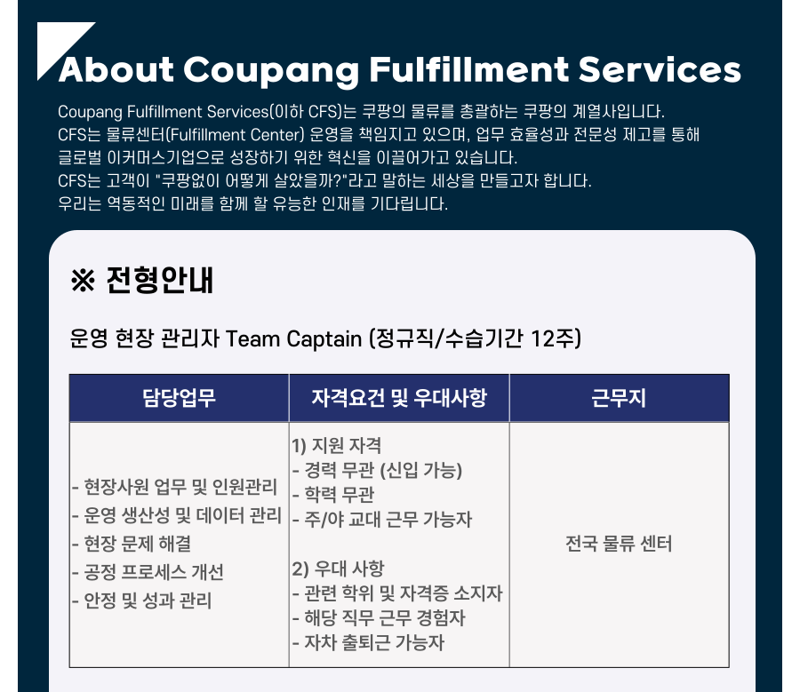 ¿î¿µ ÇöÀå °ü¸®ÀÚ Team Captain (Á¤±ÔÁ÷/¼ö½À±â°£ 12ÁÖ)