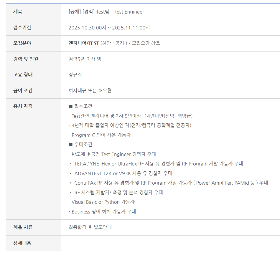Á¦¸ñ [°øÃ¤] [°æ·Â] TestÆÀ _ Test Engineer Á¢¼ö±â°£ 2025.10.30 00½Ã ~ 2025.11.11 00½Ã ¸ðÁýºÐ¾ß ¿£Áö´Ï¾î/TEST (õ¾È 1°øÀå ) / ¸ðÁý¿ä°­ ÂüÁ¶ °æ·Â ¹× Àοø °æ·Â5³â ÀÌ»ó ¸í °í¿ë ÇüÅ Á¤±ÔÁ÷ ±Þ¿© Á¶°Ç ȸ»ç³»±Ô ¶Ç´Â ó¿ìÇù ÀÀ½Ã ÀÚ°Ý ¡á ÇʼöÁ¶°Ç - Test°ü·Ã ¿£Áö´Ï¾î °æ·ÂÀÚ 5³âÀÌ»ó~14³â¹Ì¸¸(¼±ÀÓ~Ã¥ÀÓ±Þ) - 4³âÁ¦ ´ëÇÐ Á¹¾÷ÀÚ ÀÌ»óÀÎ ÀÚ(ÀüÀÚ/ÄÄÇ»ÅÍ °øÇа迭 Àü°øÀÚ) - Program C ¾ð¾î »ç¿ë °¡´ÉÀÚ ¡á ¿ì´ëÁ¶°Ç - ¹ÝµµÃ¼ ÈİøÁ¤ Test Engineer °æ·ÂÀÚ ¿ì´ë • TERADYNE iFlex or UltraFlex RF »ç¿ë À¯ °æÇèÀÚ ¹× RF Program °³¹ß °¡´ÉÀÚ ¿ì´ë • ADVANTEST T2K or V93K »ç¿ë À¯ °æÇèÀÚ ¿ì´ë • Cohu PAx RF »ç¿ë À¯ °æÇèÀÚ ¹× RF Program °³¹ß °¡´ÉÀÚ ( Power Amplifier, PAMid µî ) ¿ì´ë • RF ½Ã½ºÅÛ °³¹ßÀÚ/ ÃøÁ¤ ¹× ºÐ¼® °æÇèÀÚ ¿ì´ë - Visual Basic or Python °¡´ÉÀÚ - Business ¿µ¾î ȸȭ °¡´ÉÀÚ ¿ì´ë Á¦Ãâ ¼­·ù ÃÖÁ¾ÇÕ°Ý ÈÄ º°µµ¾È³»