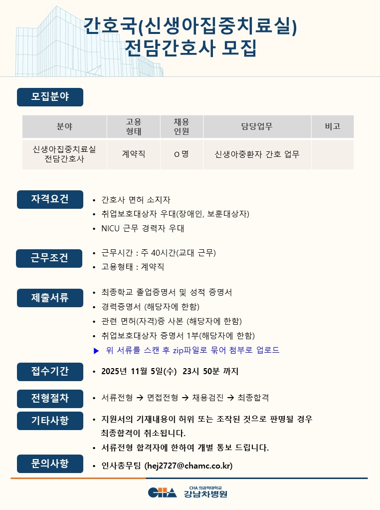 [°³²Â÷º´¿ø] °£È£±¹(½Å»ý¾ÆÁýÁßÄ¡·á½Ç) Àü´ã°£È£»ç ¸ðÁý