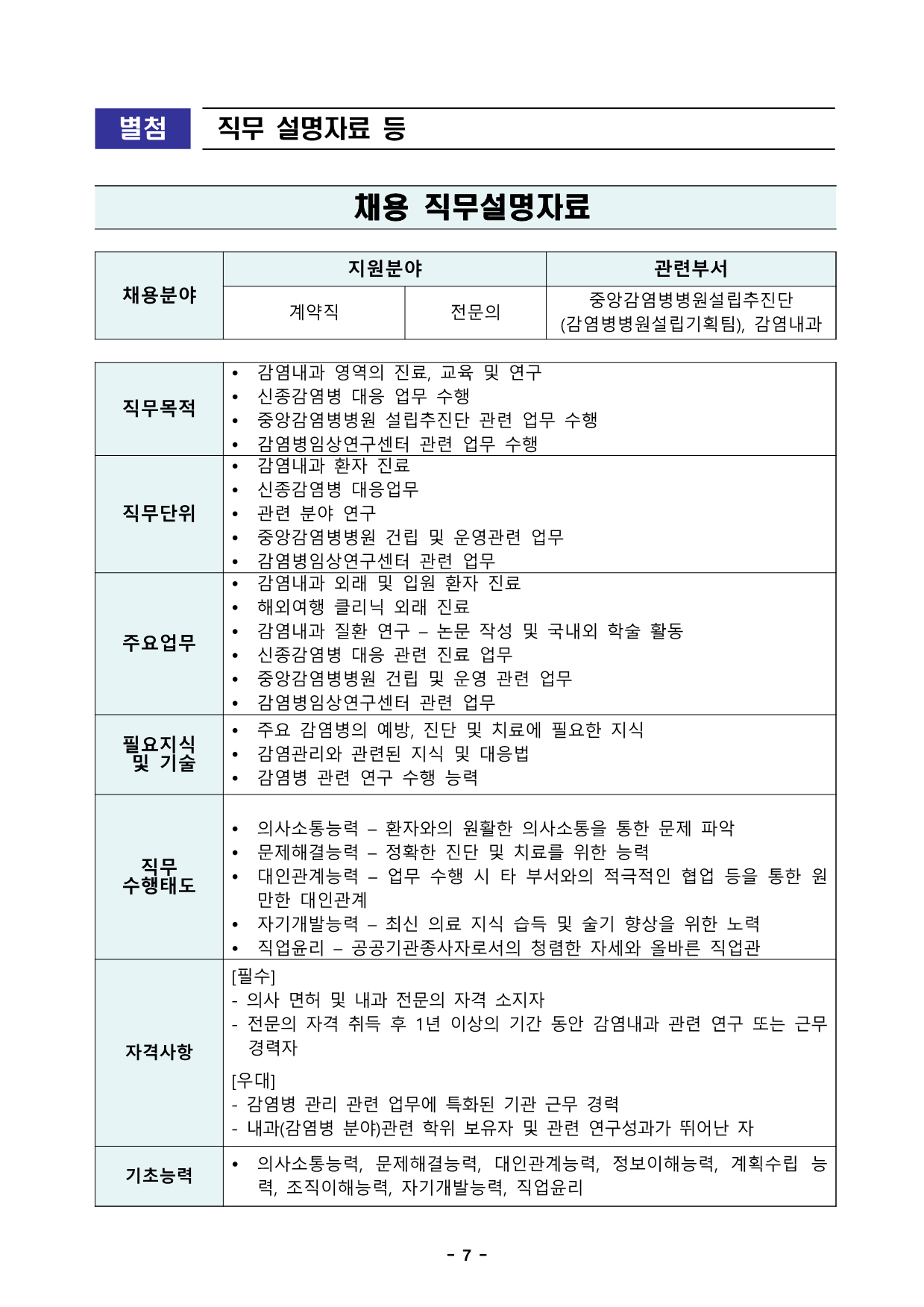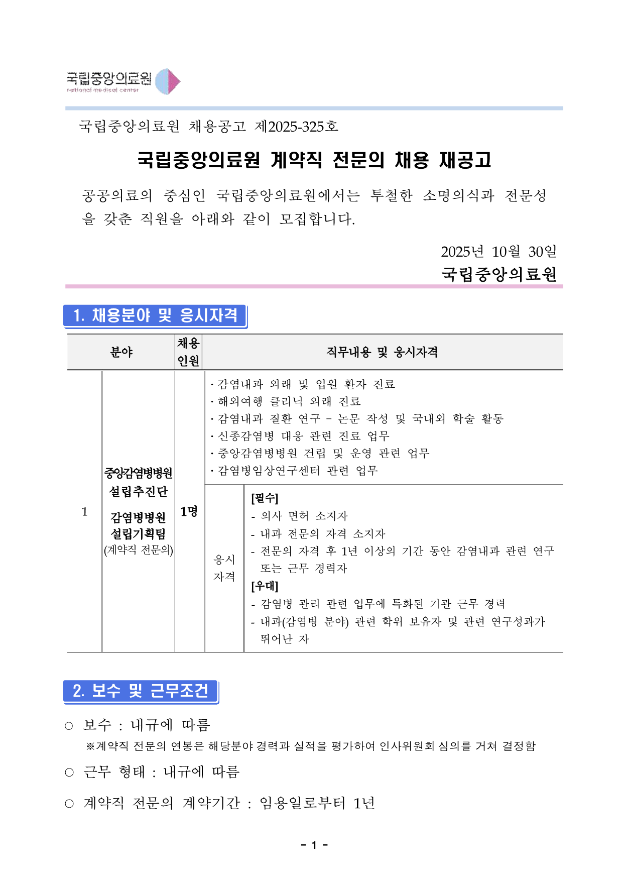 ±¹¸³Áß¾ÓÀÇ·á¿ø ä¿ë°ø°í Á¦2025-325È£ ±¹¸³Áß¾ÓÀÇ·á¿ø °è¾àÁ÷ Àü¹®ÀÇ Ã¤¿ë Àç°ø°í°ø°øÀÇ·áÀÇ Áß½ÉÀÎ ±¹¸³Áß¾ÓÀÇ·á¿ø¿¡¼´Â ÅõöÇÑ ¼Ò¸íÀǽİú Àü¹®¼ºÀ» °®Ãá Á÷¿øÀ» ¾Æ·¡¿Í °°ÀÌ ¸ðÁýÇÕ´Ï´Ù. 2025³â 10¿ù 30Àϱ¹¸³Áß¾ÓÀÇ·á¿ø1. ä¿ëºÐ¾ß ¹× ÀÀ½ÃÀÚ°Ý 2. º¸¼ö ¹× ±Ù¹«Á¶°Ç ¡Û º¸¼ö : ³»±Ô¿¡ µû¸§ ¡Ø°è¾àÁ÷ Àü¹®ÀÇ ¿¬ºÀÀº ÇØ´çºÐ¾ß °æ·Â°ú ½ÇÀûÀ» Æò°¡ÇÏ¿© ÀλçÀ§¿øÈ¸ ½ÉÀǸ¦ °ÅÃÄ °áÁ¤ÇÔ ¡Û ±Ù¹« ÇüÅ : ³»±Ô¿¡ µû¸§ ¡Û °è¾àÁ÷ Àü¹®ÀÇ °è¾à±â°£ : ÀÓ¿ëÀϷκÎÅÍ 1³â ºÐ¾ß ä¿ë Àοø Á÷¹«³»¿ë ¹× ÀÀ½ÃÀÚ°Ý 1 Áß¾Ó°¨¿°º´º´¿ø ¼³¸³ÃßÁø´Ü °¨¿°º´º´¿ø ¼³¸³±âȹÆÀ (°è¾àÁ÷ Àü¹®ÀÇ) 1¸í ¤ý°¨¿°³»°ú ¿Ü·¡ ¹× ÀÔ¿ø ȯÀÚ Áø·á ¤ýÇØ¿Ü¿©Çà Ŭ¸®´Ð ¿Ü·¡ Áø·á ¤ý°¨¿°³»°ú Áúȯ ¿¬±¸ – ³í¹® ÀÛ¼º ¹× ±¹³»¿Ü Çмú Ȱµ¿ ¤ý½ÅÁ¾°¨¿°º´ ´ëÀÀ °ü·Ã Áø·á ¾÷¹« ¤ýÁß¾Ó°¨¿°º´º´¿ø °Ç¸³ ¹× ¿î¿µ °ü·Ã ¾÷¹« ¤ý°¨¿°º´Àӻ󿬱¸¼¾ÅÍ °ü·Ã ¾÷¹« ÀÀ½Ã ÀÚ°Ý [Çʼö] - ÀÇ»ç ¸éÇã ¼ÒÁöÀÚ - ³»°ú Àü¹®ÀÇ ÀÚ°Ý ¼ÒÁöÀÚ - Àü¹®ÀÇ ÀÚ°Ý ÈÄ 1³â ÀÌ»óÀÇ ±â°£ µ¿¾È °¨¿°³»°ú °ü·Ã ¿¬±¸ ¶Ç´Â ±Ù¹« °æ·ÂÀÚ [¿ì´ë] - °¨¿°º´ °ü¸® °ü·Ã ¾÷¹«¿¡ Æ¯ÈµÈ ±â°ü ±Ù¹« °æ·Â - ³»°ú(°¨¿°º´ ºÐ¾ß) °ü·Ã ÇÐÀ§ º¸À¯ÀÚ ¹× °ü·Ã ¿¬±¸¼º°ú°¡ ¶Ù¾î³ ÀÚ