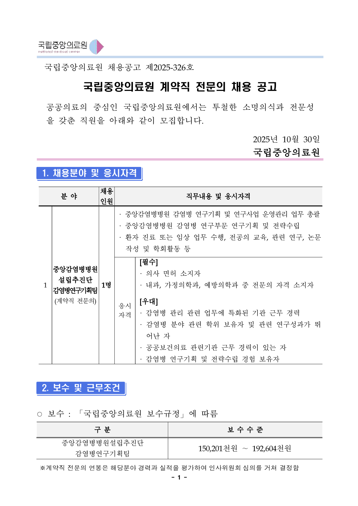 ±¹¸³Áß¾ÓÀÇ·á¿ø ä¿ë°ø°í Á¦2025-326È£ ±¹¸³Áß¾ÓÀÇ·á¿ø °è¾àÁ÷ Àü¹®ÀÇ Ã¤¿ë °ø°í °ø°øÀÇ·áÀÇ Áß½ÉÀÎ ±¹¸³Áß¾ÓÀÇ·á¿ø¿¡¼´Â ÅõöÇÑ ¼Ò¸íÀǽİú Àü¹®¼ºÀ» °®Ãá Á÷¿øÀ» ¾Æ·¡¿Í °°ÀÌ ¸ðÁýÇÕ´Ï´Ù. 2025³â 10¿ù 30Àϱ¹¸³Áß¾ÓÀÇ·á¿ø1. ä¿ëºÐ¾ß ¹× ÀÀ½ÃÀÚ°Ý 2. º¸¼ö ¹× ±Ù¹«Á¶°Ç ¡Û º¸¼ö : ¡¸±¹¸³Áß¾ÓÀÇ·á¿ø º¸¼ö±ÔÁ¤¡¹¿¡ µû¸§ ±¸ ºÐ º¸ ¼ö ¼ö ÁØ Áß¾Ó°¨¿°º´º´¿ø¼³¸³ÃßÁø´Ü °¨¿°º´¿¬±¸±âȹÆÀ 150,201õ¿ø ¡ 192,604õ¿ø ¡Ø°è¾àÁ÷ Àü¹®ÀÇ ¿¬ºÀÀº ÇØ´çºÐ¾ß °æ·Â°ú ½ÇÀûÀ» Æò°¡ÇÏ¿© ÀλçÀ§¿øÈ¸ ½ÉÀǸ¦ °ÅÃÄ °áÁ¤ÇÔ ºÐ ¾ß ä¿ë Àοø Á÷¹«³»¿ë ¹× ÀÀ½ÃÀÚ°Ý 1 Áß¾Ó°¨¿°º´º´¿ø ¼³¸³ÃßÁø´Ü °¨¿°º´¿¬±¸±âȹÆÀ (°è¾àÁ÷ Àü¹®ÀÇ) 1¸í ¡¤ Áß¾Ó°¨¿°º´º´¿ø °¨¿°º´ ¿¬±¸±âȹ ¹× ¿¬±¸»ç¾÷ ¿î¿µ°ü¸® ¾÷¹« ÃѰý¡¤ Áß¾Ó°¨¿°º´º´¿ø °¨¿°º´ ¿¬±¸ºÎ¹® ¿¬±¸±âȹ ¹× Àü·«¼ö¸³ ¡¤ ȯÀÚ Áø·á ¶Ç´Â ÀÓ»ó ¾÷¹« ¼öÇà, Àü°øÀÇ ±³À°, °ü·Ã ¿¬±¸, ³í¹®ÀÛ¼º ¹× ÇÐȸȰµ¿ µî ÀÀ½Ã ÀÚ°Ý [Çʼö] ¡¤ ÀÇ»ç ¸éÇã ¼ÒÁöÀÚ ¡¤ ³»°ú, °¡Á¤ÀÇÇаú, ¿¹¹æÀÇÇаú Áß Àü¹®ÀÇ ÀÚ°Ý ¼ÒÁöÀÚ[¿ì´ë] ¡¤ °¨¿°º´ °ü¸® °ü·Ã ¾÷¹«¿¡ Æ¯ÈµÈ ±â°ü ±Ù¹« °æ·Â ¡¤ °¨¿°º´ ºÐ¾ß °ü·Ã ÇÐÀ§ º¸À¯ÀÚ ¹× °ü·Ã ¿¬±¸¼º°ú°¡ ¶Ù¾î³ ÀÚ ¡¤ °ø°øº¸°ÇÀÇ·á °ü·Ã±â°ü ±Ù¹« °æ·ÂÀÌ ÀÖ´Â ÀÚ ¡¤ °¨¿°º´ ¿¬±¸±âȹ ¹× Àü·«¼ö¸³ °æÇè º¸À¯ÀÚ