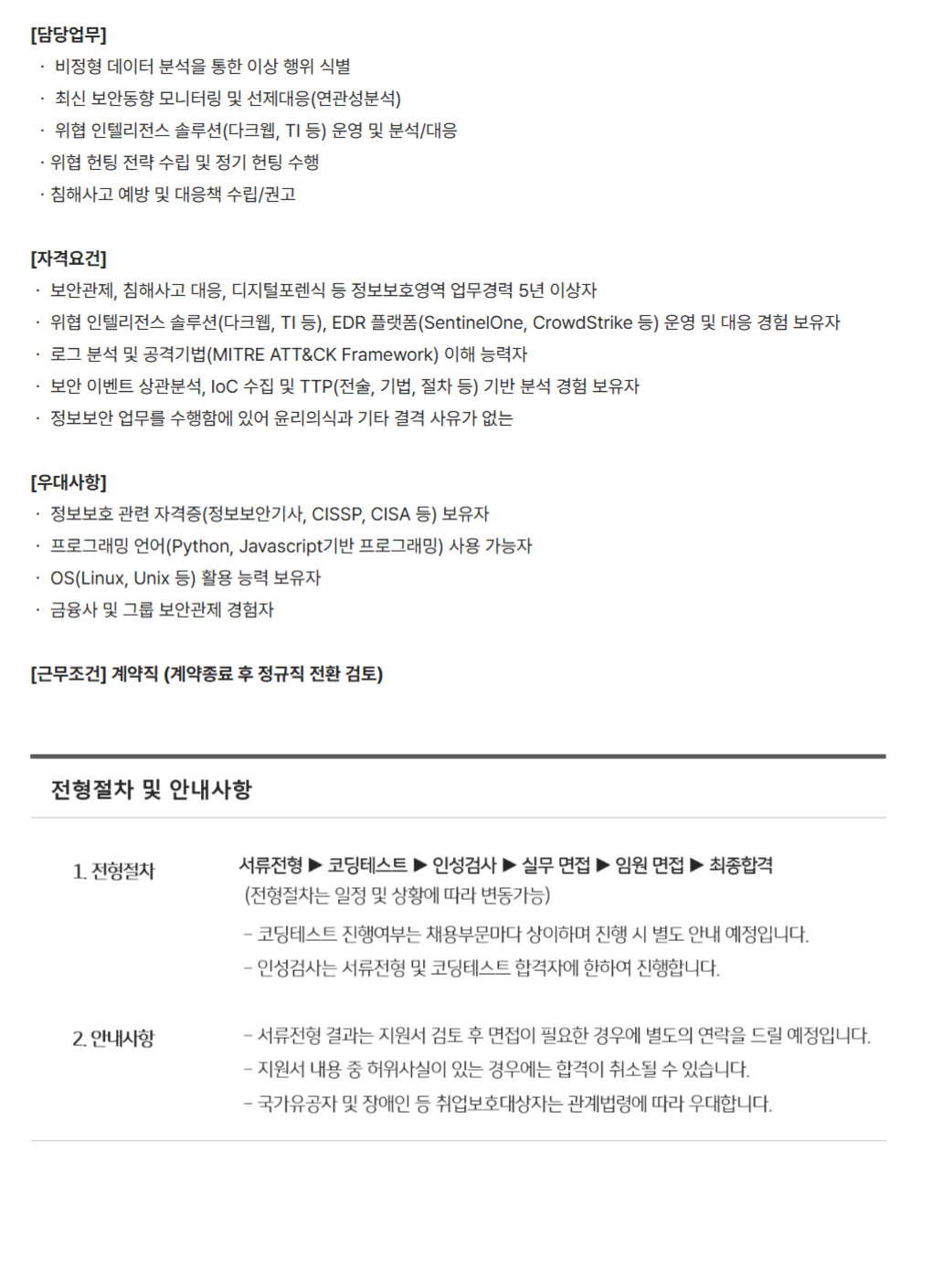 ¤ý À§Çù ÀÎÅÚ¸®Àü½º ¼Ö·ç¼Ç(´ÙÅ©À¥, TI µî), EDR Ç÷§Æû(SentinelOne, CrowdStrike µî) ¿î¿µ ¹× ´ëÀÀ °æÇè º¸À¯ÀÚ