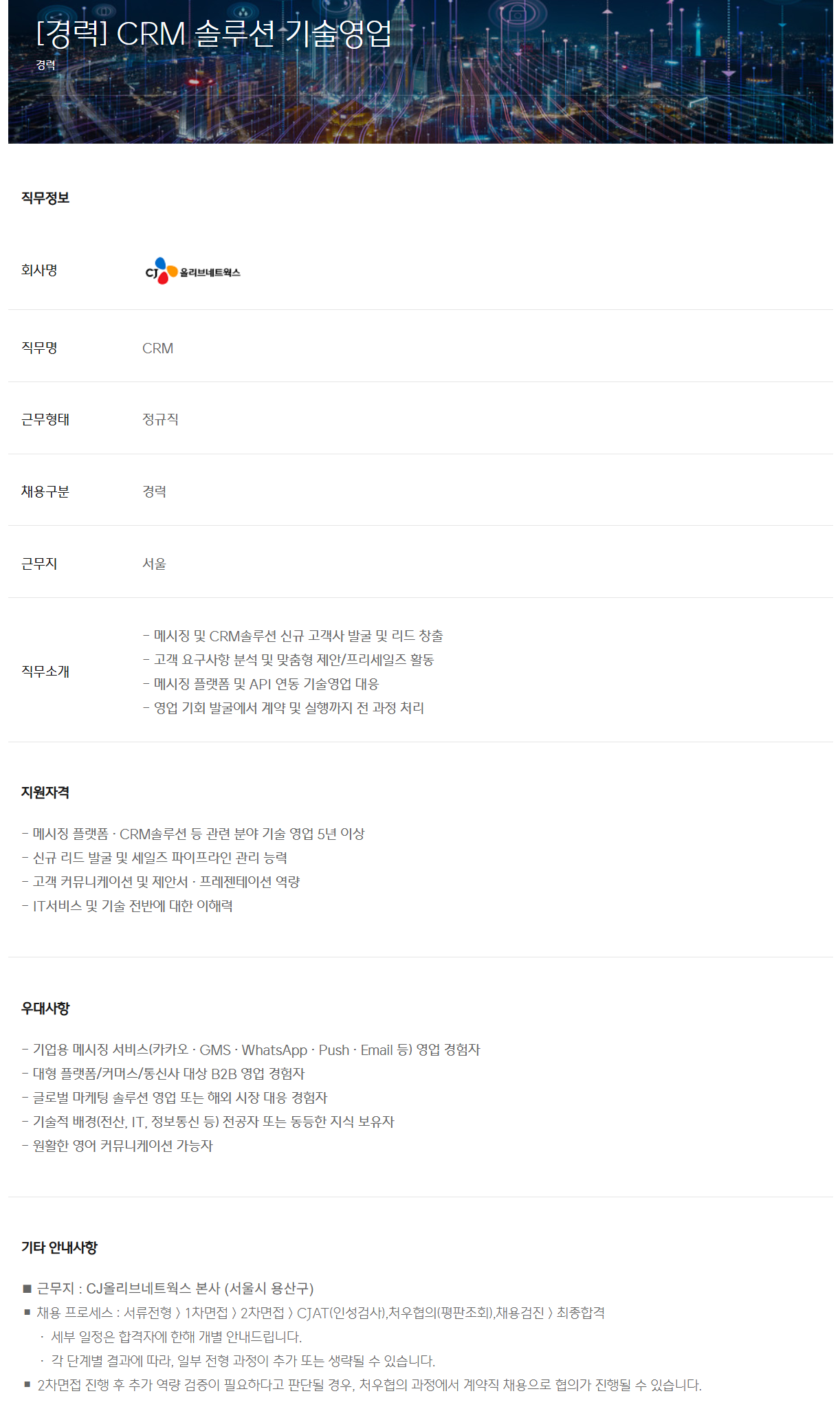 ◼ ±Ù¹«Áö : CJ¿Ã¸®ºê³×Æ®¿÷½º º»»ç (¼¿ï½Ã ¿ë»ê±¸)