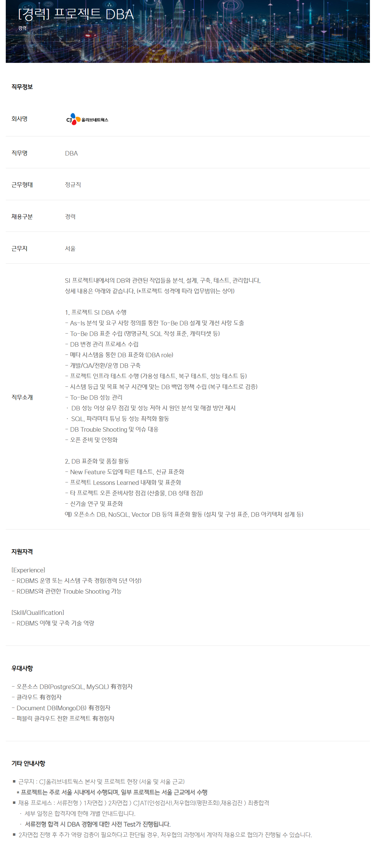 ◼ ±Ù¹«Áö : CJ¿Ã¸®ºê³×Æ®¿÷½º º»»ç ¹× ÇÁ·ÎÁ§Æ® ÇöÀå (¼¿ï ¹× ¼¿ï ±Ù±³)