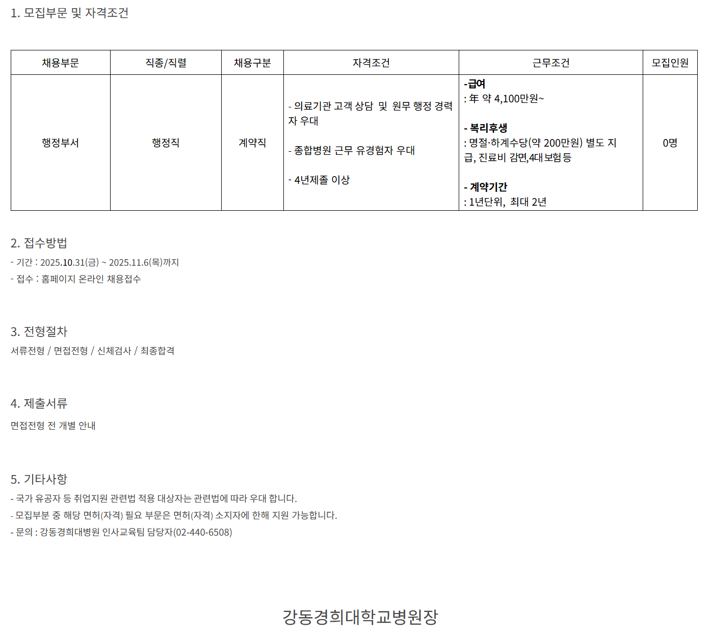 1. ¸ðÁýºÎ¹® ¹× ÀÚ°ÝÁ¶°Ç ä¿ëºÎ¹® Á÷Á¾/Á÷·Ä ä¿ë±¸ºÐ ÀÚ°ÝÁ¶°Ç ±Ù¹«Á¶°Ç ¸ðÁýÀοø ÇàÁ¤ºÎ¼­ ÇàÁ¤Á÷ °è¾àÁ÷ - ÀÇ·á±â°ü °í°´ »ó´ã ¹× ¿ø¹« ÇàÁ¤ °æ·ÂÀÚ ¿ì´ë - Á¾ÇÕº´¿ø ±Ù¹« À¯°æÇèÀÚ ¿ì´ë - 4³âÁ¦Á¹ ÀÌ»ó - ±Þ¿© : æÄ ¾à 4,100¸¸¿ø~ - º¹¸®ÈÄ»ý : ¸íÀý¡¤Çϰè¼ö´ç(¾à 200¸¸¿ø) º°µµ Áö±Þ, Áø·áºñ °¨¸é, 4´ë º¸Çè µî - °è¾à±â°£ : 1³â´ÜÀ§, ÃÖ´ë 2³â 0¸í 2. Á¢¼ö¹æ¹ý - ±â°£ : 2025.10.31(±Ý) ~ 2025.11.6(¸ñ)±îÁö - Á¢¼ö : ȨÆäÀÌÁö ¿Â¶óÀΠä¿ëÁ¢¼ö ​ ​ 3. ÀüÇüÀýÂ÷ ¼­·ùÀüÇü / ¸éÁ¢ÀüÇü / ½Åü°Ë»ç / ÃÖÁ¾ÇÕ°Ý​ ​ ​ 4. Á¦Ãâ¼­·ù ​¸éÁ¢ÀüÇü Àü °³º° ¾È³» ​ ​ 5. ±âŸ»çÇ× - ±¹°¡ À¯°øÀÚ µî Ãë¾÷Áö¿ø °ü·Ã¹ý Àû¿ë ´ë»óÀÚ´Â °ü·Ã¹ý¿¡ µû¶ó ¿ì´ë ÇÕ´Ï´Ù. ​ - ¸ðÁýºÎºÐ Áß ÇØ´ç ¸éÇã(ÀÚ°Ý) ÇÊ¿ä ºÎ¹®Àº ¸éÇã(ÀÚ°Ý) ¼ÒÁöÀÚ¿¡ ÇÑÇØ Áö¿ø °¡´ÉÇÕ´Ï´Ù.​ - ​¹®ÀÇ : °­µ¿°æÈñ´ëº´¿ø Àλ米À°ÆÀ ´ã´çÀÚ(***-****-****) ​ ​ °­µ¿°æÈñ´ëÇб³º´¿øÀå