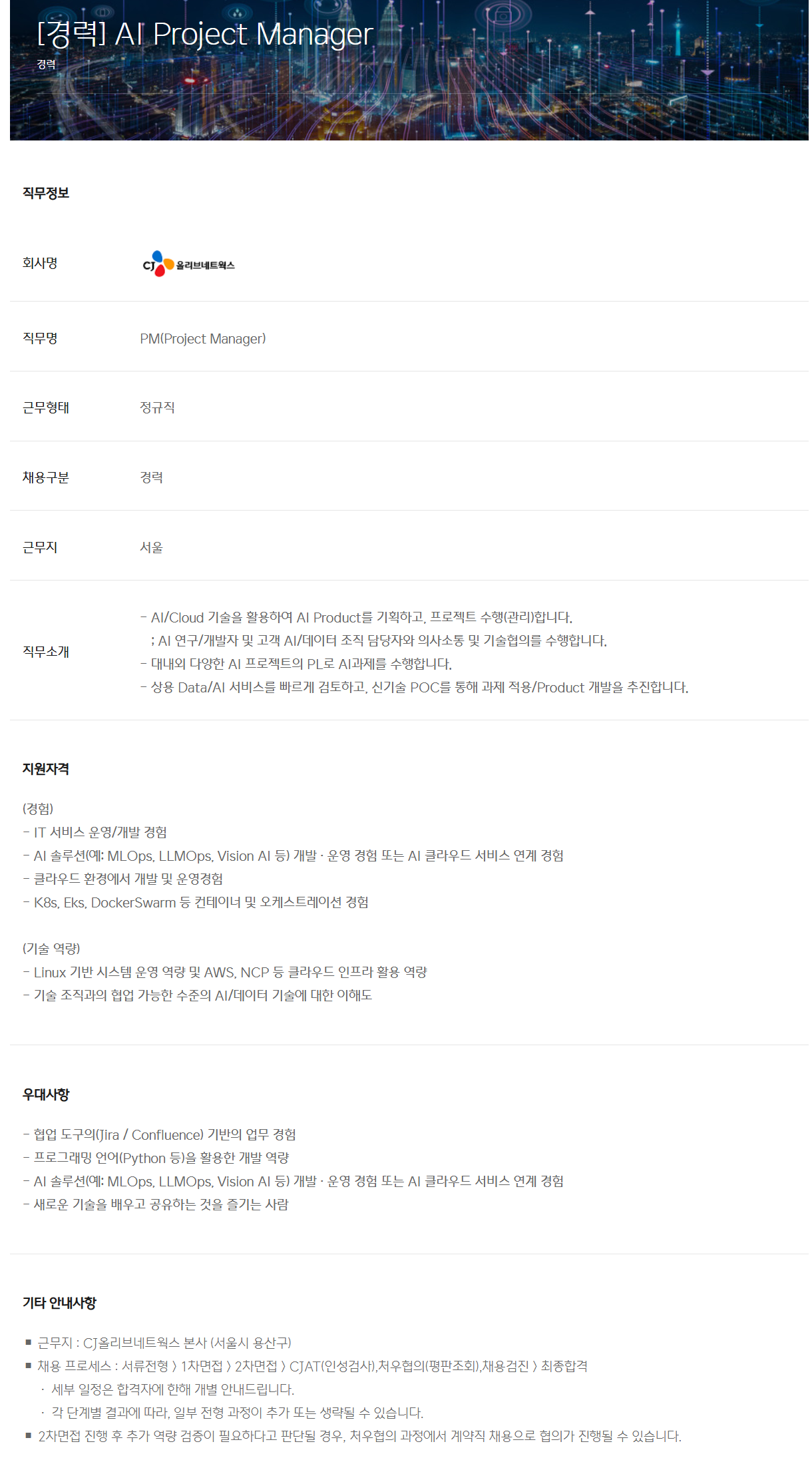 ◼ ±Ù¹«Áö : CJ¿Ã¸®ºê³×Æ®¿÷½º º»»ç (¼¿ï½Ã ¿ë»ê±¸)