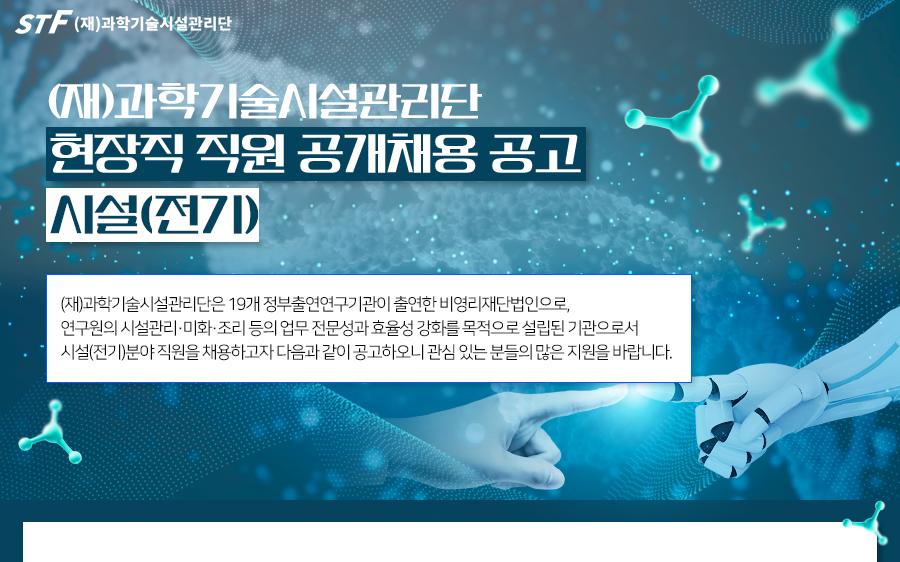 (Àç)°úÇбâ¼ú½Ã¼³°ü¸®´ÜÀº 19°³ Á¤ºÎÃ⿬¿¬±¸±â°üÀÌ Ã⿬ÇÑ ºñ¿µ¸®Àç´Ü¹ýÀÎÀ¸·Î, ¿¬±¸¿øÀÇ ½Ã¼³°ü¸®¡¤¹ÌÈ­¡¤Á¶¸® µîÀÇ ¾÷¹« Àü¹®¼º°ú È¿À²¼º °­È­¸¦ ¸ñÀûÀ¸·Î ¼³¸³µÈ ±â°üÀ¸·Î¼­ ½Ã¼³(Àü±â) ºÐ¾ß Á÷¿øÀ» ä¿ëÇϰíÀÚ ´ÙÀ½°ú °°ÀÌ °ø°íÇÏ¿À´Ï °ü½É ÀÖ´Â ºÐµéÀÇ ¸¹Àº Áö¿øÀ» ¹Ù¶ø´Ï´Ù.