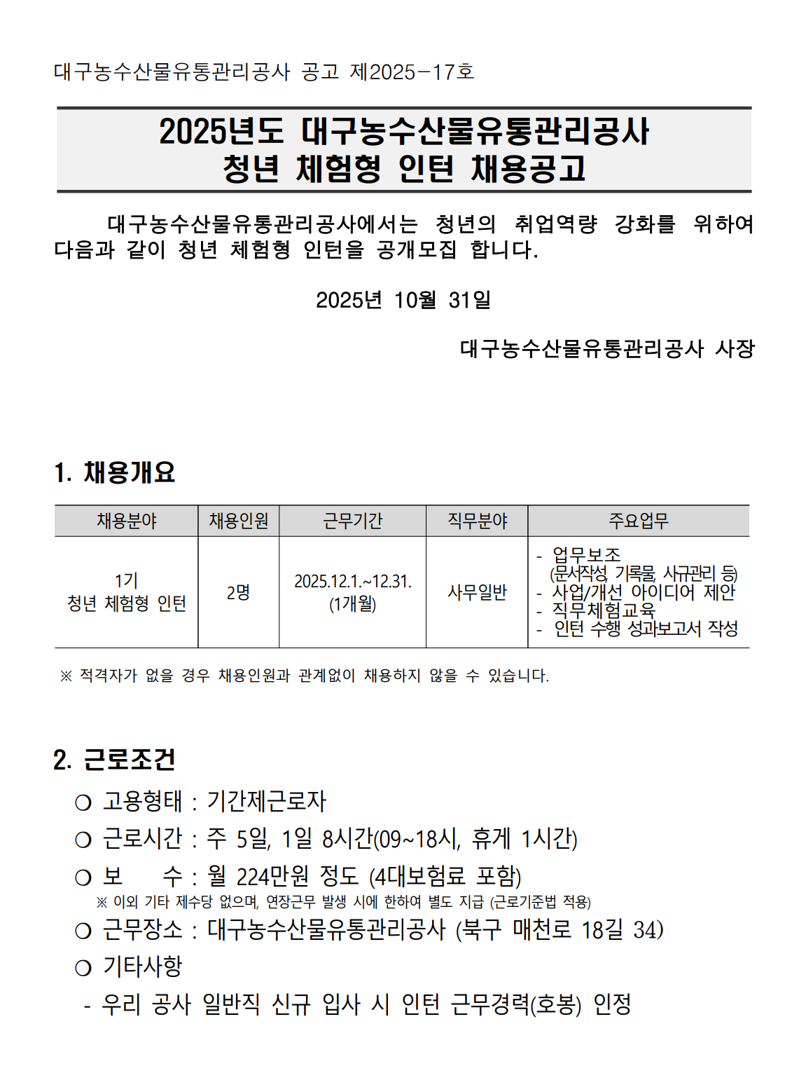 2025³âµµ ´ë±¸³ó¼ö»ê¹°À¯Åë°ü¸®°ø»ç û³â üÇèÇü ÀÎÅÏ Ã¤¿ë°ø°í(~2025.11.10.)