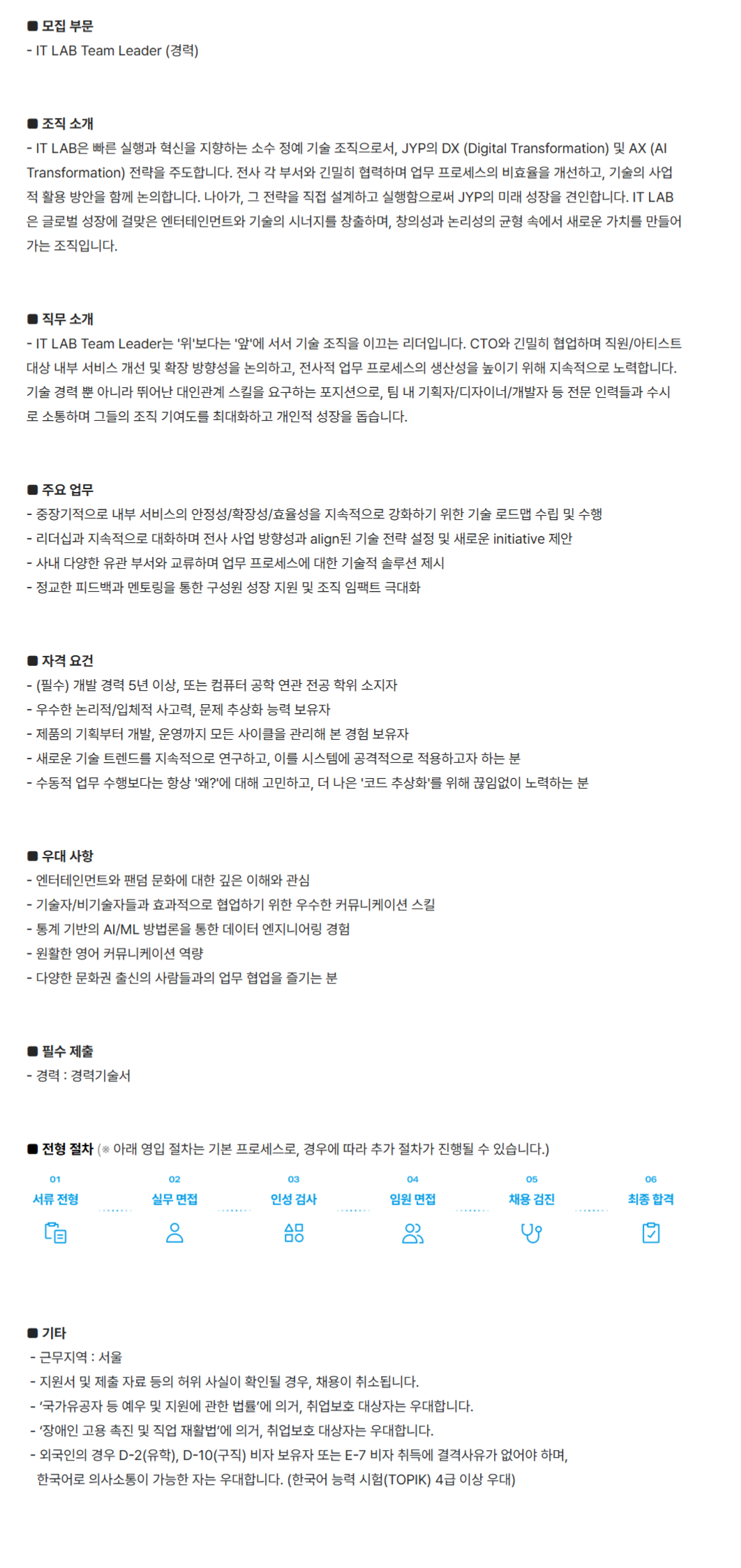 [JYP ENTERTAINMENT] IT LAB Team Leader (°æ·Â)