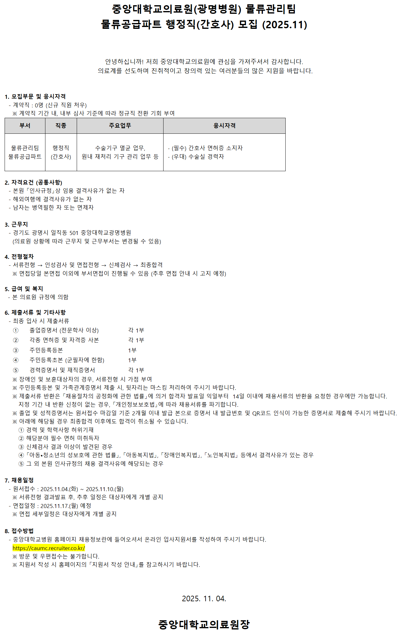 ¹°·ù°ø±ÞÆÄÆ® ÇàÁ¤Á÷(°£È£»ç) ¸ðÁý (2025.11)