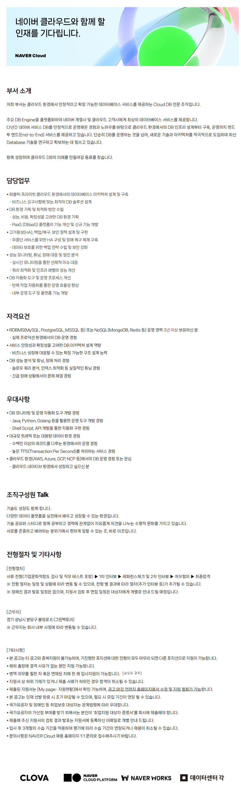 [NAVER Cloud] Cloud DB Platform Engineer (DBA) (°æ·Â)