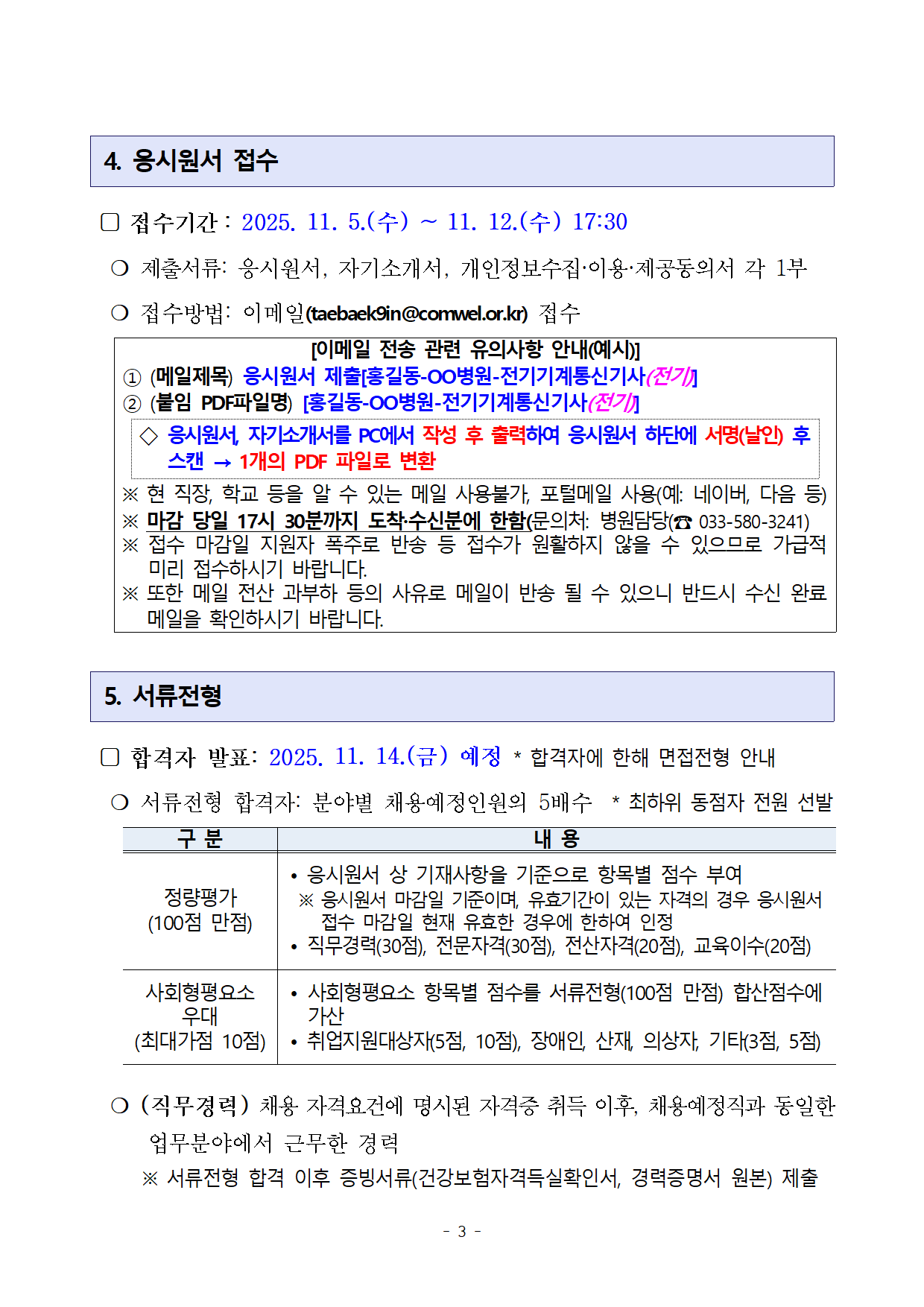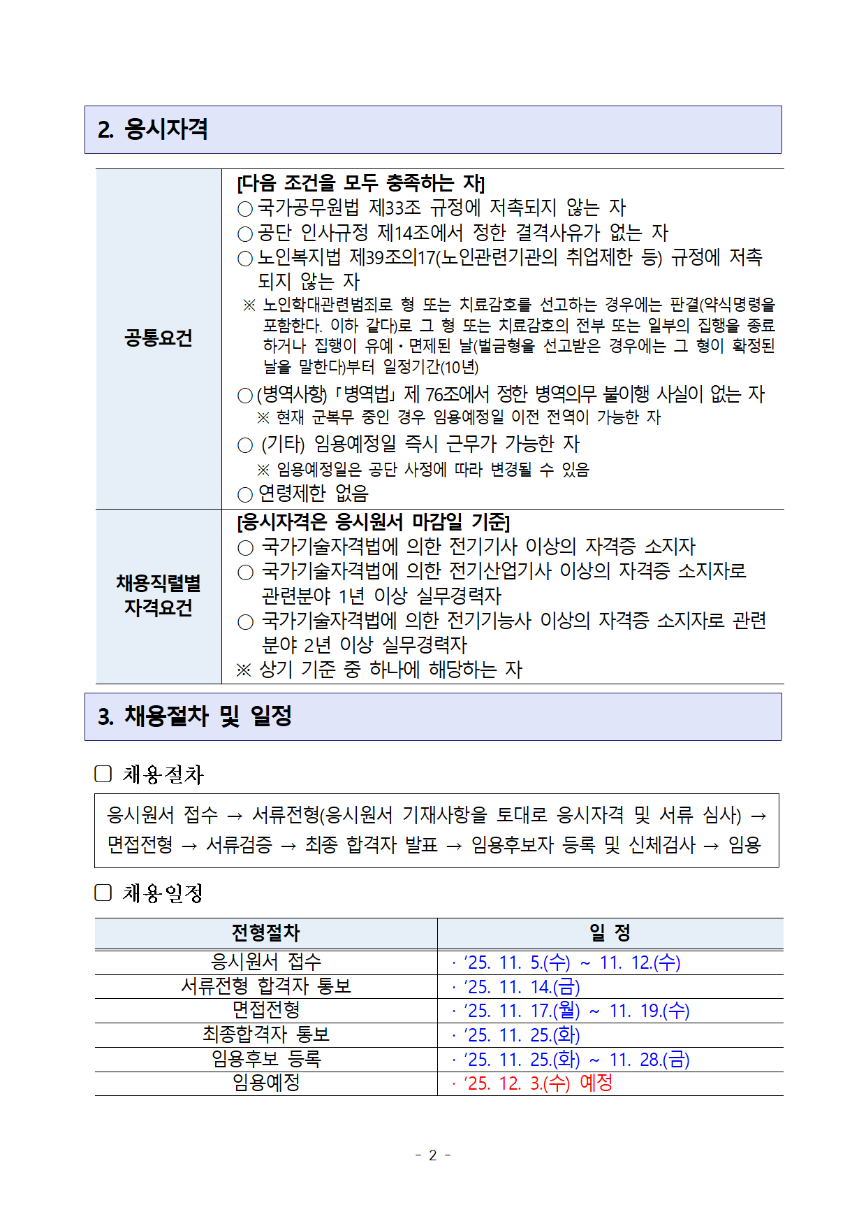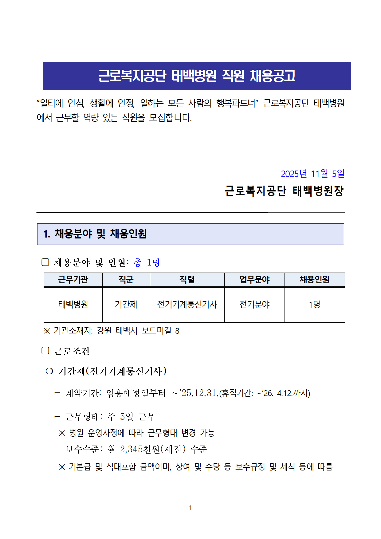 ±Ù·Îº¹Áö°ø´Ü Ź麴¿ø Á÷¿ø ä¿ë°ø°í ¡°ÀÏÅÍ¿¡ ¾È½É, »ýȰ¿¡ ¾ÈÁ¤, ÀÏÇÏ´Â ¸ðµç »ç¶÷ÀÇ ÇູÆÄÆ®³Ê¡± ±Ù·Îº¹Áö°ø´Ü Ź麴¿ø ¿¡¼ ±Ù¹«ÇÒ ¿ª·® ÀÖ´Â Á÷¿øÀ» ¸ðÁýÇÕ´Ï´Ù. 2025³â 11¿ù 5ÀÏ ±Ù·Îº¹Áö°ø´Ü Ź麴¿øÀå 1. ä¿ëºÐ¾ß ¹× ä¿ëÀοø ▢ ä¿ëºÐ¾ß ¹× Àοø: ÃÑ 1¸í ±Ù¹«±â°ü Á÷±º Á÷·Ä ¾÷¹«ºÐ¾ß ä¿ëÀοø Å¹麴¿ø ±â°£Á¦ Àü±â±â°èÅë½Å±â»ç Àü±âºÐ¾ß 1¸í ¡Ø ±â°ü¼ÒÀçÁö: °¿ø Źé½Ã º¸µå¹Ì±æ 8 ▢ ±Ù·ÎÁ¶°Ç ❍ ±â°£Á¦(Àü±â±â°èÅë½Å±â»ç) - °è¾à±â°£: Àӿ뿹Á¤ÀϺÎÅÍ ¡¡¯25.12.31.(ÈÞÁ÷±â°£: ¡¡¯26. 4.12.±îÁö) - ±Ù¹«ÇüÅÂ: ÁÖ 5ÀÏ ±Ù¹« ¡Ø º´¿ø ¿î¿µ»çÁ¤¿¡ µû¶ó ±Ù¹«ÇüÅ º¯°æ °¡´É - º¸¼ö¼öÁØ: ¿ù 2,345õ¿ø(¼¼Àü) ¼öÁØ ¡Ø ±âº»±Þ ¹× ½Ä´ëÆ÷ÇÔ ±Ý¾×À̸ç, »ó¿© ¹× ¼ö´ç µî º¸¼ö±ÔÁ¤ ¹× ¼¼Ä¢ µî¿¡ µû¸§