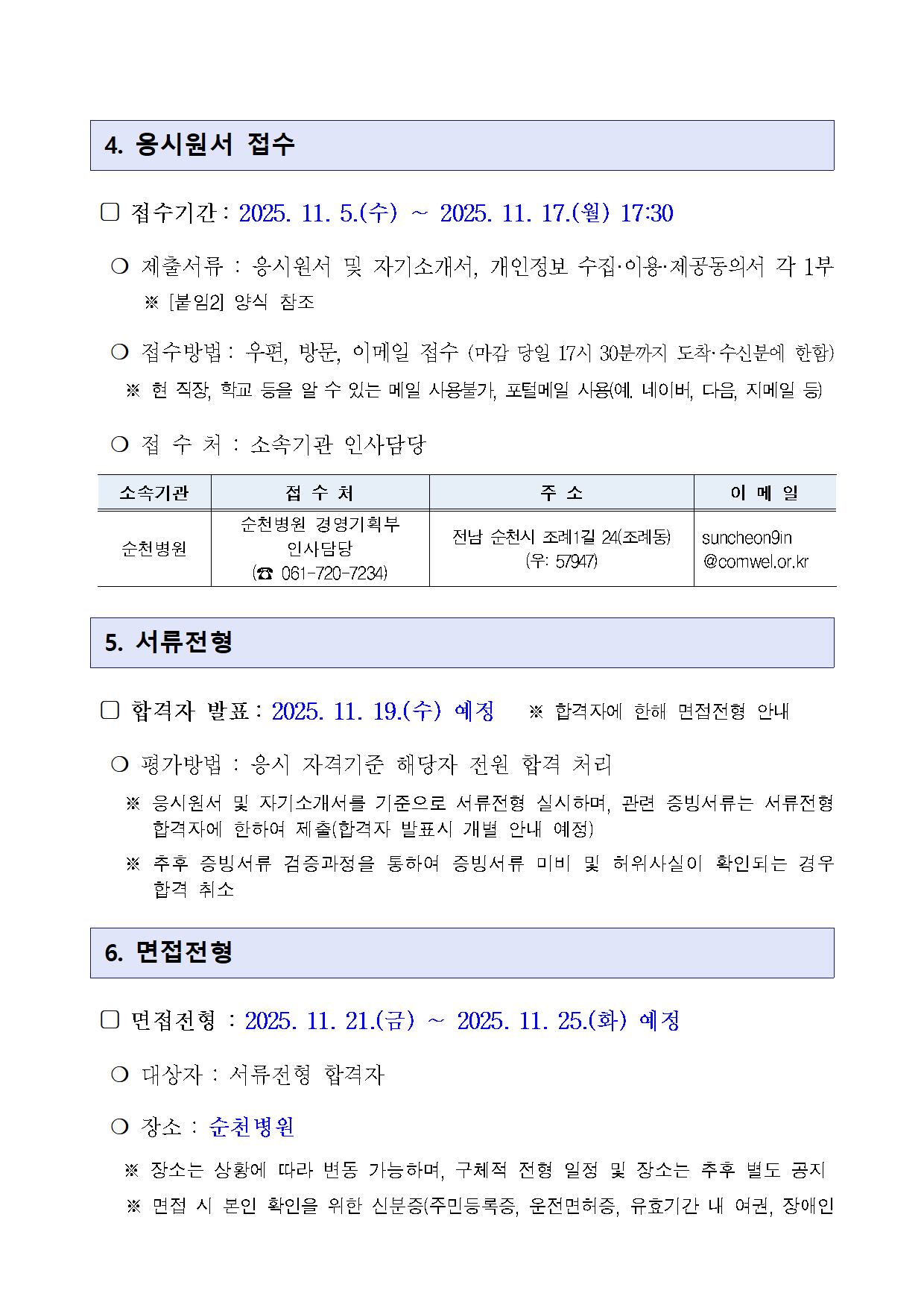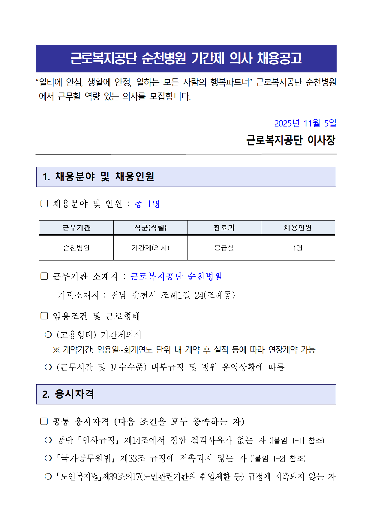 ±Ù·Îº¹Áö°ø´Ü ¼øÃµº´¿ø ±â°£Á¦ ÀÇ»ç ä¿ë°ø°í ¡°ÀÏÅÍ¿¡ ¾È½É, »ýȰ¿¡ ¾ÈÁ¤, ÀÏÇÏ´Â ¸ðµç »ç¶÷ÀÇ ÇູÆÄÆ®³Ê¡± ±Ù·Îº¹Áö°ø´Ü ¼øÃµº´¿ø ¿¡¼ ±Ù¹«ÇÒ ¿ª·® ÀÖ´Â Àǻ縦 ¸ðÁýÇÕ´Ï´Ù. 2025³â 11¿ù 5ÀÏ ±Ù·Îº¹Áö°ø´Ü ÀÌ»çÀå 1. ä¿ëºÐ¾ß ¹× ä¿ëÀοø ▢ ä¿ëºÐ¾ß ¹× Àοø : ÃÑ 1¸í ±Ù¹«±â°ü Á÷±º(Á÷·Ä) Áø·á°ú ä¿ëÀοø ¼øÃµº´¿ø ±â°£Á¦(ÀÇ»ç) ÀÀ±Þ½Ç 1¸í ▢ ±Ù¹«±â°ü ¼ÒÀçÁö : ±Ù·Îº¹Áö°ø´Ü ¼øÃµº´¿ø - ±â°ü¼ÒÀçÁö : Àü³² ¼øÃµ½Ã Á¶·Ê1±æ 24(Á¶·Êµ¿) ▢ ÀÓ¿ëÁ¶°Ç ¹× ±Ù·ÎÇüÅ ❍ (°í¿ëÇüÅÂ) ±â°£Á¦ÀÇ»ç ¡Ø °è¾à±â°£: ÀÓ¿ëÀϡȸ°è¿¬µµ ´ÜÀ§ ³» °è¾à ÈÄ ½ÇÀû µî¿¡ µû¶ó ¿¬Àå°è¾à °¡´É ❍ (±Ù¹«½Ã°£ ¹× º¸¼ö¼öÁØ) ³»ºÎ±ÔÁ¤ ¹× º´¿ø ¿î¿µ»óȲ¿¡ µû¸§