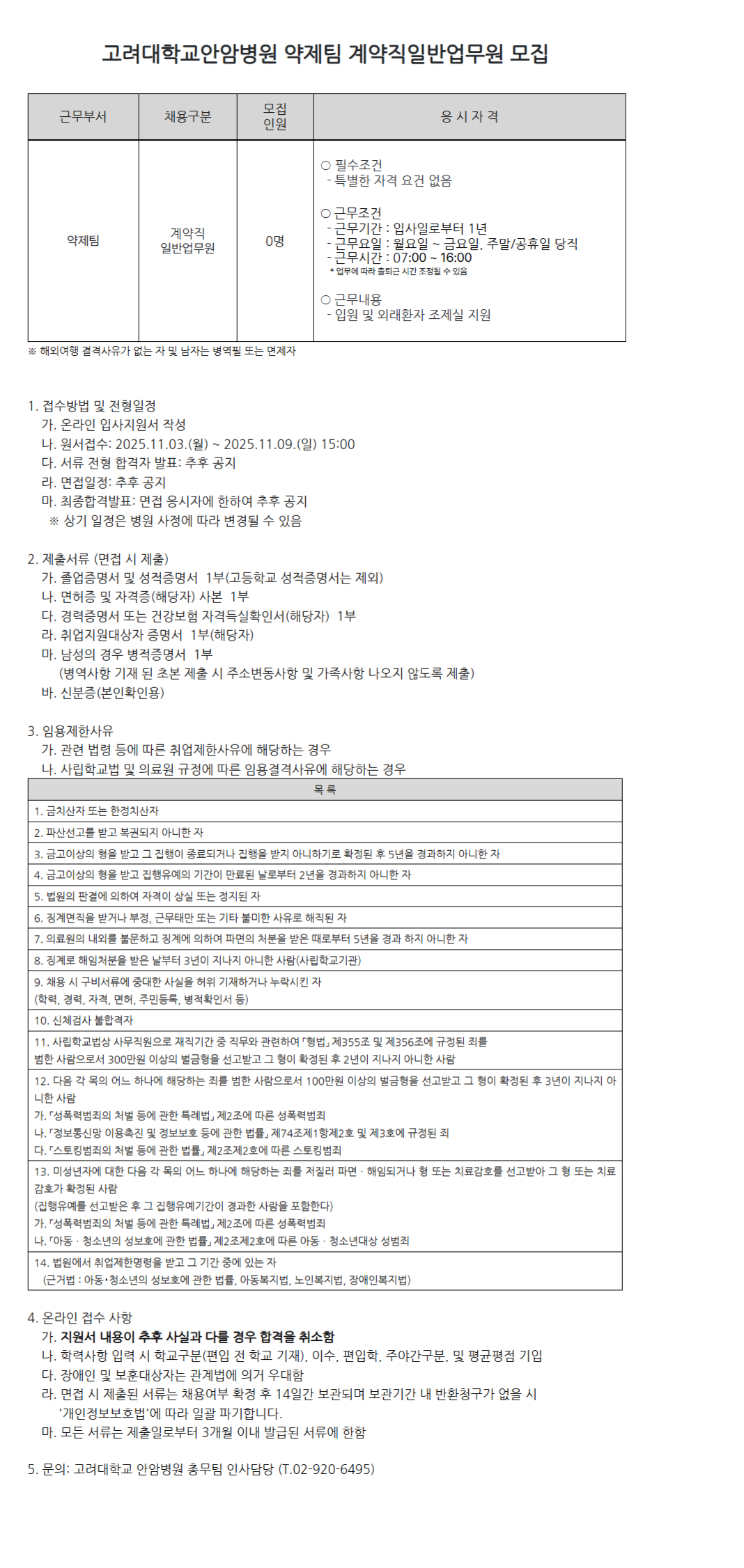 °í·Á´ëÇб³¾È¾Ïº´¿ø ¾àÁ¦ÆÀ °è¾àÁ÷ÀϹݾ÷¹«¿ø ¸ðÁý