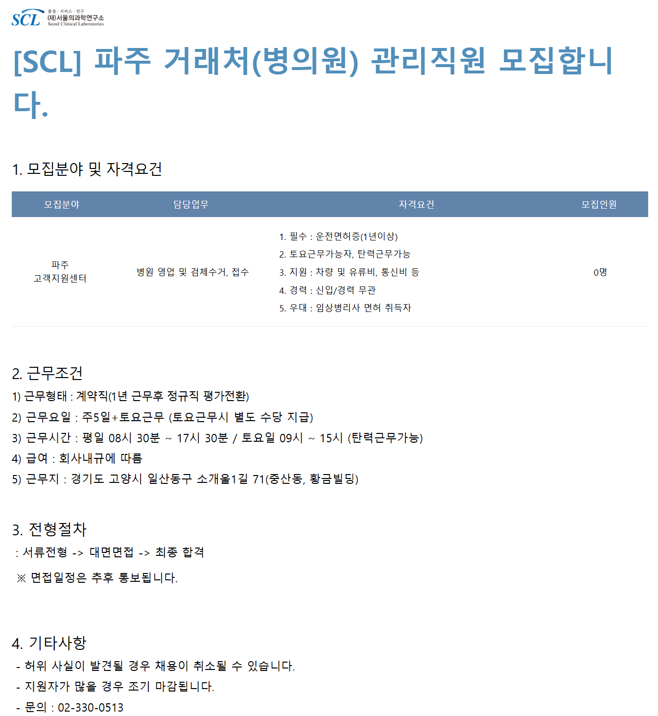 [SCL] ÆÄÁÖ °Å·¡Ã³(º´ÀÇ¿ø) °ü¸®Á÷¿ø ¸ðÁýÇÕ´Ï´Ù.