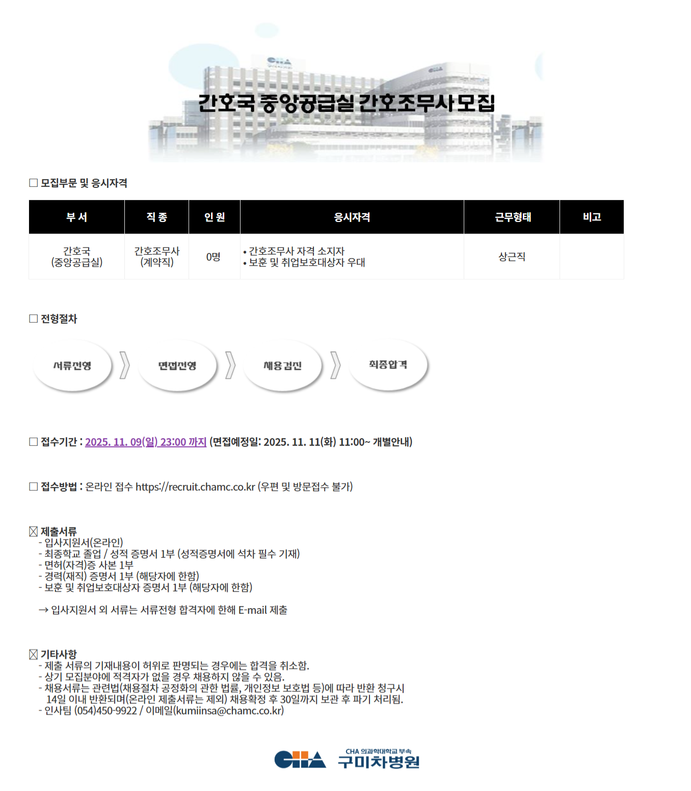 [±¸¹ÌÂ÷º´¿ø] °£È£±¹ Áß¾Ó°ø±Þ½Ç °£È£Á¶¹«»ç ¸ðÁý(°è¾àÁ÷)