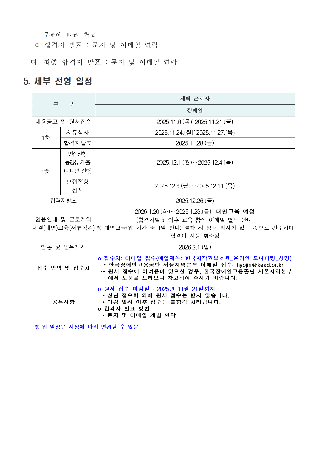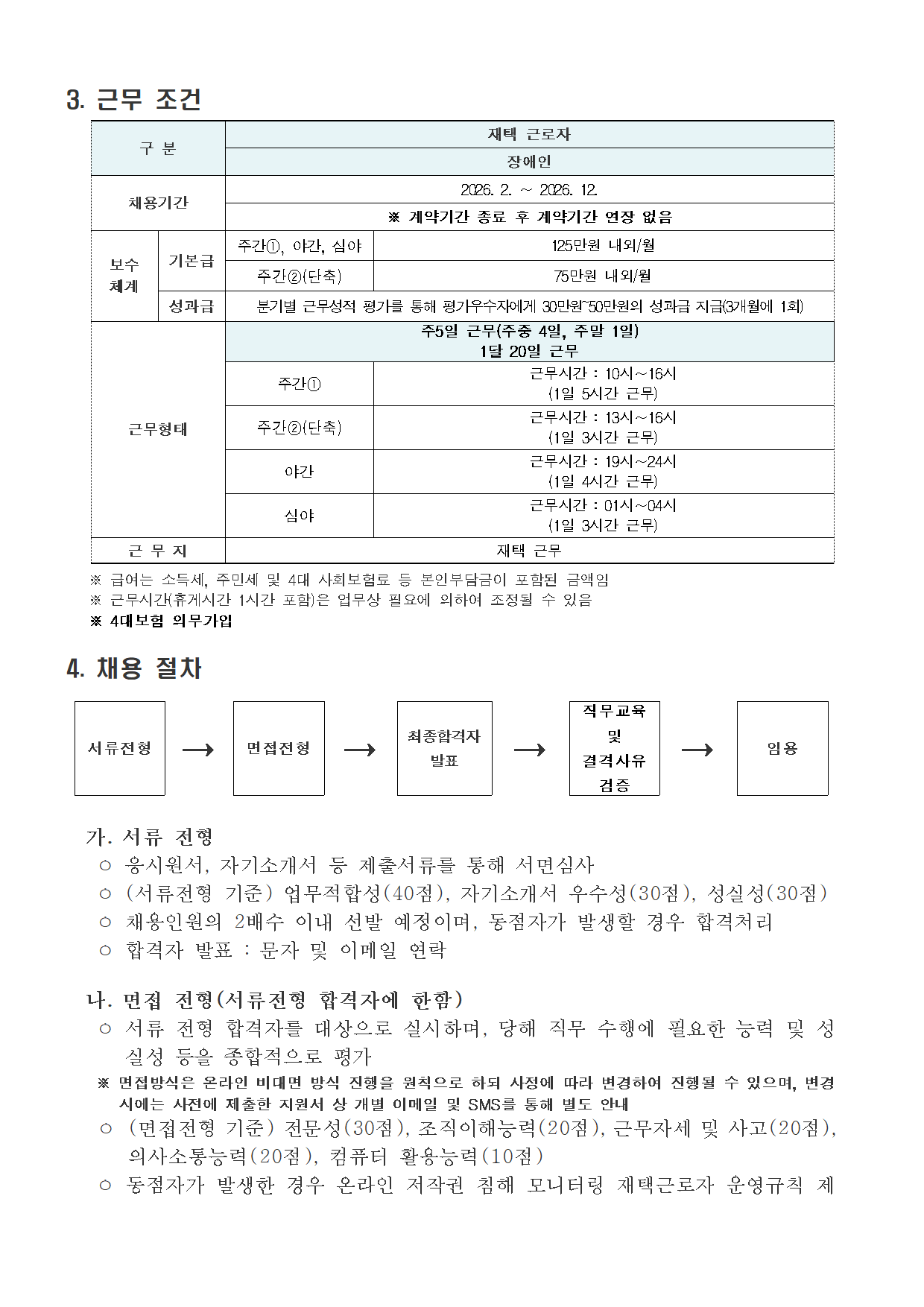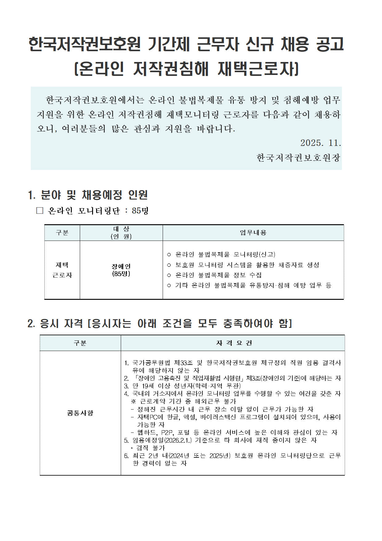 Çѱ¹ÀúÀ۱Ǻ¸È£¿ø ±â°£Á¦ ±Ù¹«ÀÚ ½Å±Ô ä¿ë °ø°í (¿Â¶óÀÎ ÀúÀÛ±ÇÄ§ÇØ ÀçÅñٷÎÀÚ) Çѱ¹ÀúÀ۱Ǻ¸È£¿ø¿¡¼´Â ¿Â¶óÀÎ ºÒ¹ýº¹Á¦¹° À¯Åë ¹æÁö ¹× Ä§ÇØ¿¹¹æ ¾÷¹« Áö¿øÀ» À§ÇÑ ¿Â¶óÀÎ ÀúÀÛ±ÇÄ§ÇØ ÀçÅøð´ÏÅ͸µ ±Ù·ÎÀÚ¸¦ ´ÙÀ½°ú °°ÀÌ Ã¤¿ëÇÏ ¿À´Ï, ¿©·¯ºÐµéÀÇ ¸¹Àº °ü½É°ú Áö¿øÀ» ¹Ù¶ø´Ï´Ù. 2025. 11. Çѱ¹ÀúÀ۱Ǻ¸È£¿øÀå 1. ºÐ¾ß ¹× ä¿ë¿¹Á¤ Àοø ¡à ¿Â¶óÀÎ ¸ð´ÏÅ͸µ´Ü : 85¸í ±¸ºÐ ´ë »ó (ÀÎ ¿ø) ¾÷¹«³»¿ë ÀçÅà ±Ù·ÎÀÚ Àå¾ÖÀÎ (85¸í) ¤· ¿Â¶óÀÎ ºÒ¹ýº¹Á¦¹° ¸ð´ÏÅ͸µ(½Å°í) ¤· º¸È£¿ø ¸ð´ÏÅ͸µ ½Ã½ºÅÛÀ» Ȱ¿ëÇÑ Ã¤ÁõÀÚ·á »ý¼º ¤· ¿Â¶óÀÎ ºÒ¹ýº¹Á¦¹° Á¤º¸ ¼öÁý ¤· ±âŸ ¿Â¶óÀÎ ºÒ¹ýº¹Á¦¹° À¯Åë¹æÁö¡¤Ä§ÇØ ¿¹¹æ ¾÷¹« µî 2. ÀÀ½Ã ÀÚ°Ý [ÀÀ½ÃÀÚ´Â ¾Æ·¡ Á¶°ÇÀ» ¸ðµÎ ÃæÁ·ÇÏ¿©¾ß ÇÔ] ±¸ºÐ ÀÚ °Ý ¿ä °Ç °øÅë»çÇ× 1. ±¹°¡°ø¹«¿ø¹ý Á¦33Á¶ ¹× Çѱ¹ÀúÀ۱Ǻ¸È£¿ø Á¦±ÔÁ¤ÀÇ Á÷¿ø ÀÓ¿ë °á°Ý»ç À¯¿¡ ÇØ´çÇÏÁö ¾Ê´Â ÀÚ 2. ¡¸Àå¾ÖÀÎ °í¿ëÃËÁø ¹× Á÷¾÷ÀçȰ¹ý ½ÃÇà·É¡¹Á¦3Á¶(Àå¾ÖÀÎÀÇ ±âÁØ)¿¡ ÇØ´çÇÏ´Â ÀÚ 3. ¸¸ 19¼¼ ÀÌ»ó ¼º³âÀÚ(Çз¡¤Áö¿ª ¹«°ü) 4. ±¹³»ÀÇ °Å¼ÒÁö¿¡¼ ¿Â¶óÀÎ ¸ð´ÏÅ͸µ ¾÷¹«¸¦ ¼öÇàÇÒ ¼ö ÀÖ´Â ¿©°ÇÀ» °®Ãá ÀÚ ¡Ø ±Ù·Î°è¾à ±â°£ Áß ÇØ¿Ü±Ù¹« ºÒ°¡ - Á¤ÇØÁø ±Ù¹«½Ã°£ ³» ±Ù¹« Àå¼Ò ÀÌÅ» ¾øÀÌ ±Ù¹«°¡ °¡´ÉÇÑ ÀÚ - ÀÚÅÃPC¿¡ ÇѱÛ, ¿¢¼¿, ¹ÙÀÌ·¯½º¹é½Å ÇÁ·Î±×·¥ÀÌ ¼³Ä¡µÇ¾î ÀÖÀ¸¸ç, »ç¿ëÀÌ °¡´ÉÇÑ ÀÚ - À¥Çϵå, P2P, Æ÷ÅÐ µî ¿Â¶óÀÎ ¼ºñ½º¿¡ ³ôÀº ÀÌÇØ¿Í °ü½ÉÀÌ ÀÖ´Â ÀÚ 5. Àӿ뿹Á¤ÀÏ(2026.2.1.) ±âÁØÀ¸·Î Ÿ ȸ»ç¿¡ ÀçÁ÷ ÁßÀÌÁö ¾ÊÀº ÀÚ * °âÁ÷ ºÒ°¡ 6. ÃÖ±Ù 2³â ³»(2024³â ¶Ç´Â 2025³â) º¸È£¿ø ¿Â¶óÀÎ ¸ð´ÏÅ͸µ´ÜÀ¸·Î ±Ù¹« ÇÑ °æ·ÂÀÌ ¾ø´Â ÀÚ