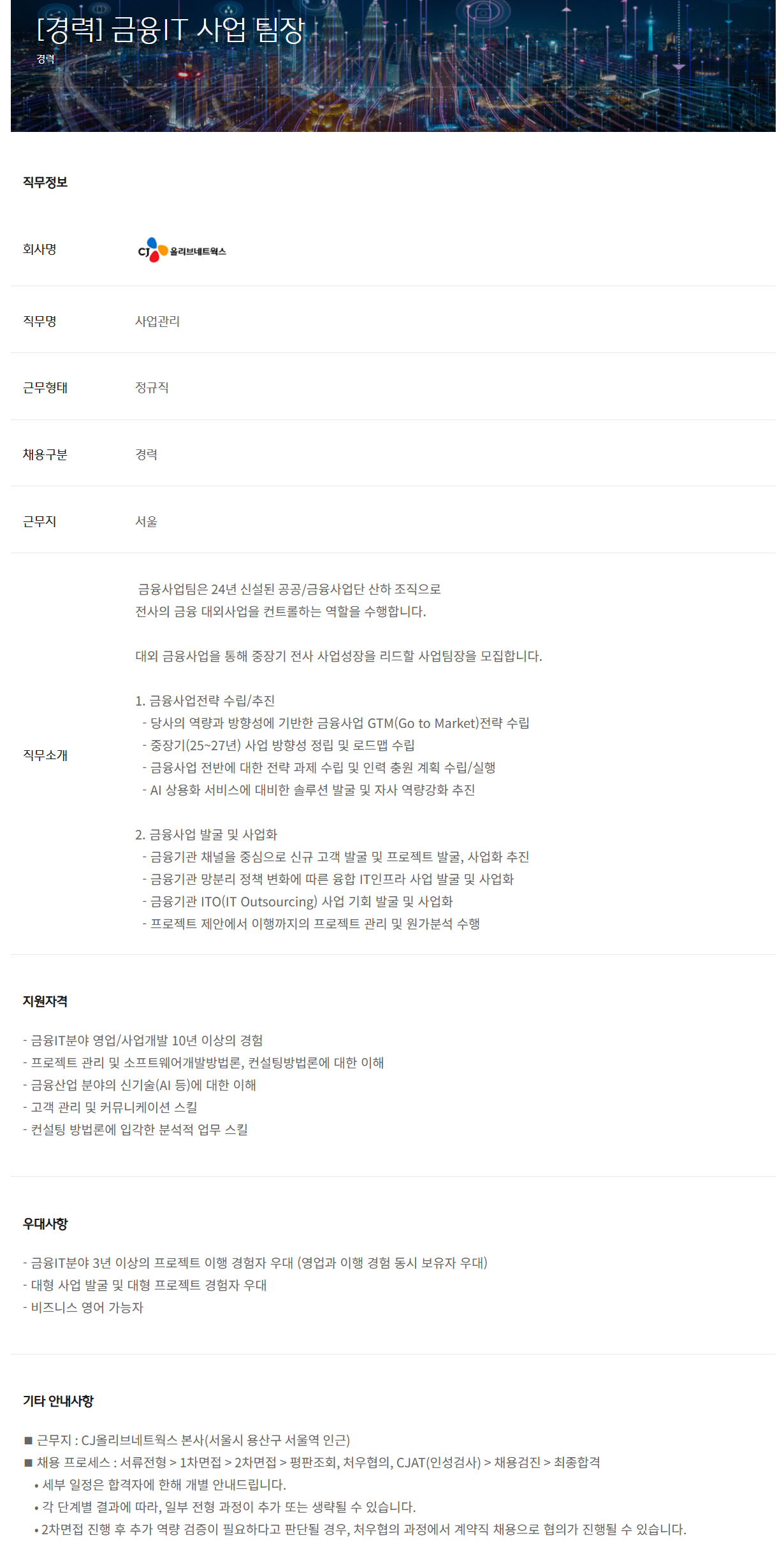 ◼ ±Ù¹«Áö : CJ¿Ã¸®ºê³×Æ®¿÷½º º»»ç(¼¿ï½Ã ¿ë»ê±¸ ¼¿ï¿ª ÀαÙ)