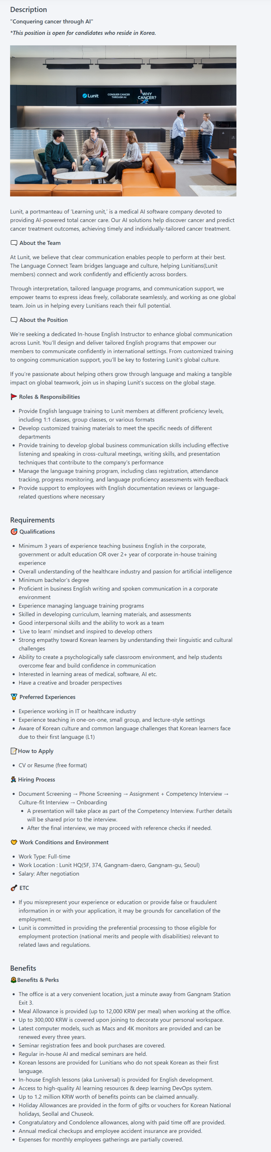 If you¡¯re passionate about helping others grow through language and making a tangible impact on global teamwork, join us in shaping Lunit¡¯s success on the global stage.