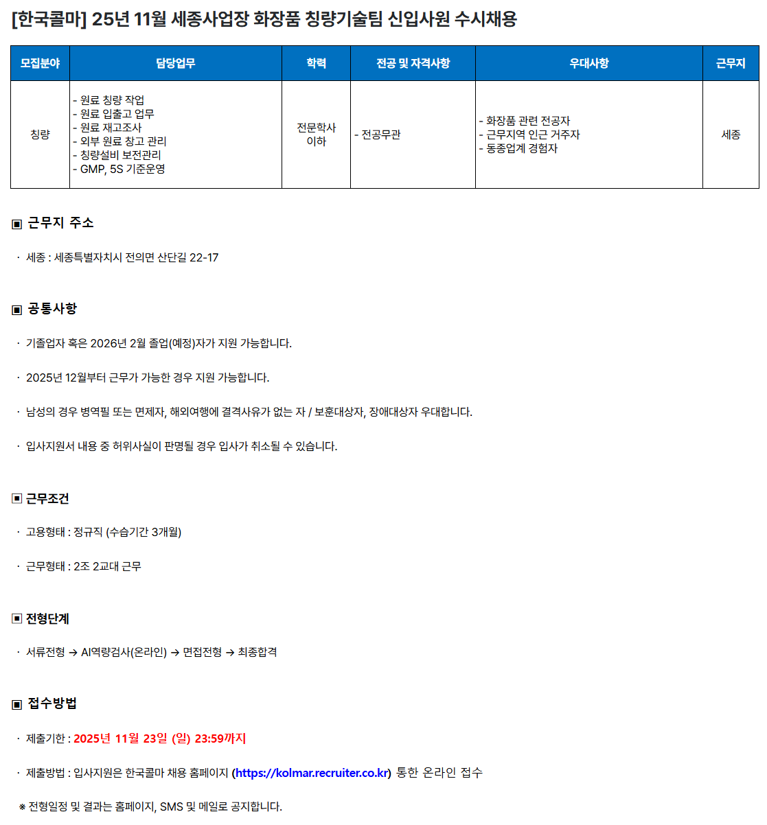 ¤ý Á¦Ãâ¹æ¹ý : ÀÔ»çÁö¿øÀº Çѱ¹Äݸ¶ ä¿ë ȨÆäÀÌÁö (https://kolmar.recruiter.co.kr) ÅëÇÑ ¿Â¶óÀÎ Á¢¼ö