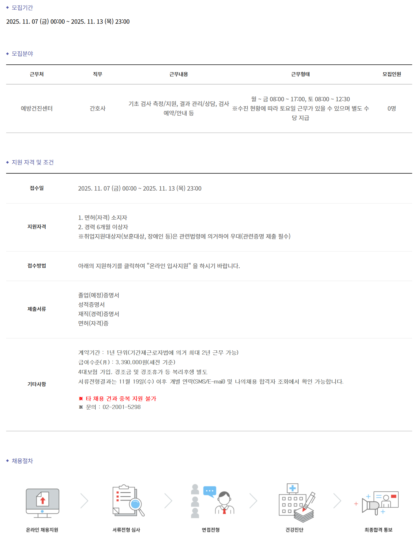 ±Ù¹«Ã³ Á÷¹« ±Ù¹«³»¿ë ±Ù¹«ÇüÅ ¸ðÁýÀοø ¿¹¹æ°ÇÁø¼¾ÅÍ °£È£»ç ±âÃÊ °Ë»ç ÃøÁ¤/Áö¿ø, °á°ú °ü¸®/»ó´ã, °Ë»ç ¿¹¾à/¾È³» µî ¿ù ~ ±Ý 08:00 ~ 17:00, Åä 08:00 ~ 12:30 ¡Ø¼öÁø ÇöȲ¿¡ µû¶ó Åä¿äÀÏ ±Ù¹«°¡ ÀÖÀ» ¼ö ÀÖÀ¸¸ç º°µµ ¼ö´ç Áö±Þ 0¸í