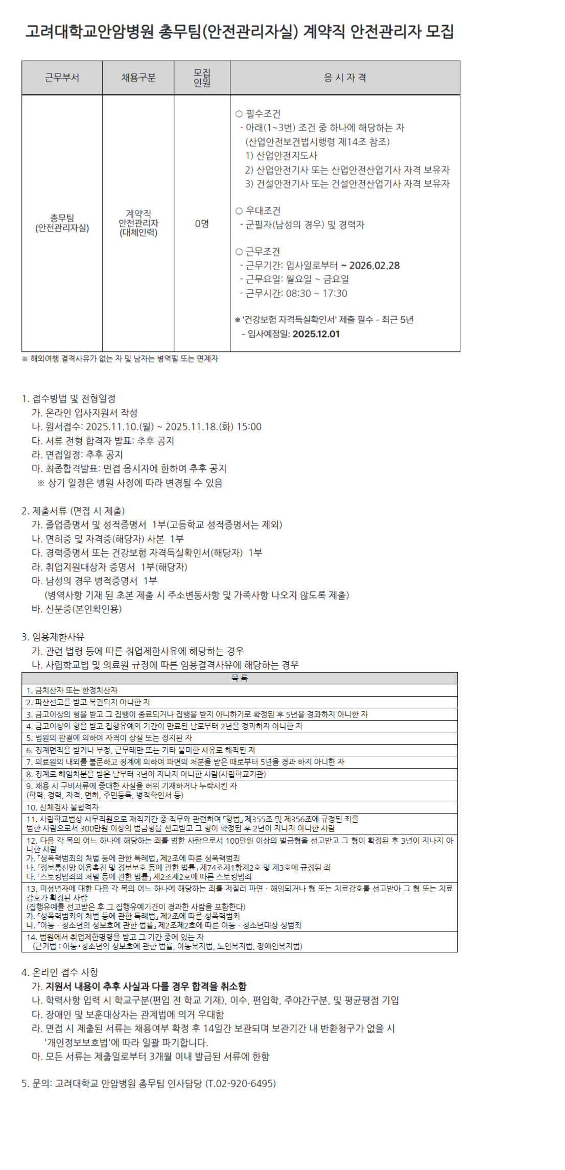 [¾È¾Ïº´¿ø 25-202]Ãѹ«ÆÀ(¾ÈÀü°ü¸®ÀÚ½Ç) °è¾àÁ÷ ¾ÈÀü°ü¸®ÀÚ ¸ðÁý(´ëüÀηÂ)