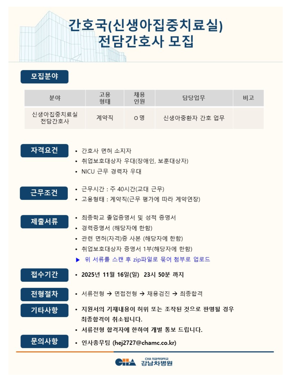 [°³²Â÷º´¿ø] °£È£±¹(½Å»ý¾ÆÁýÁßÄ¡·á½Ç) Àü´ã°£È£»ç ¸ðÁý