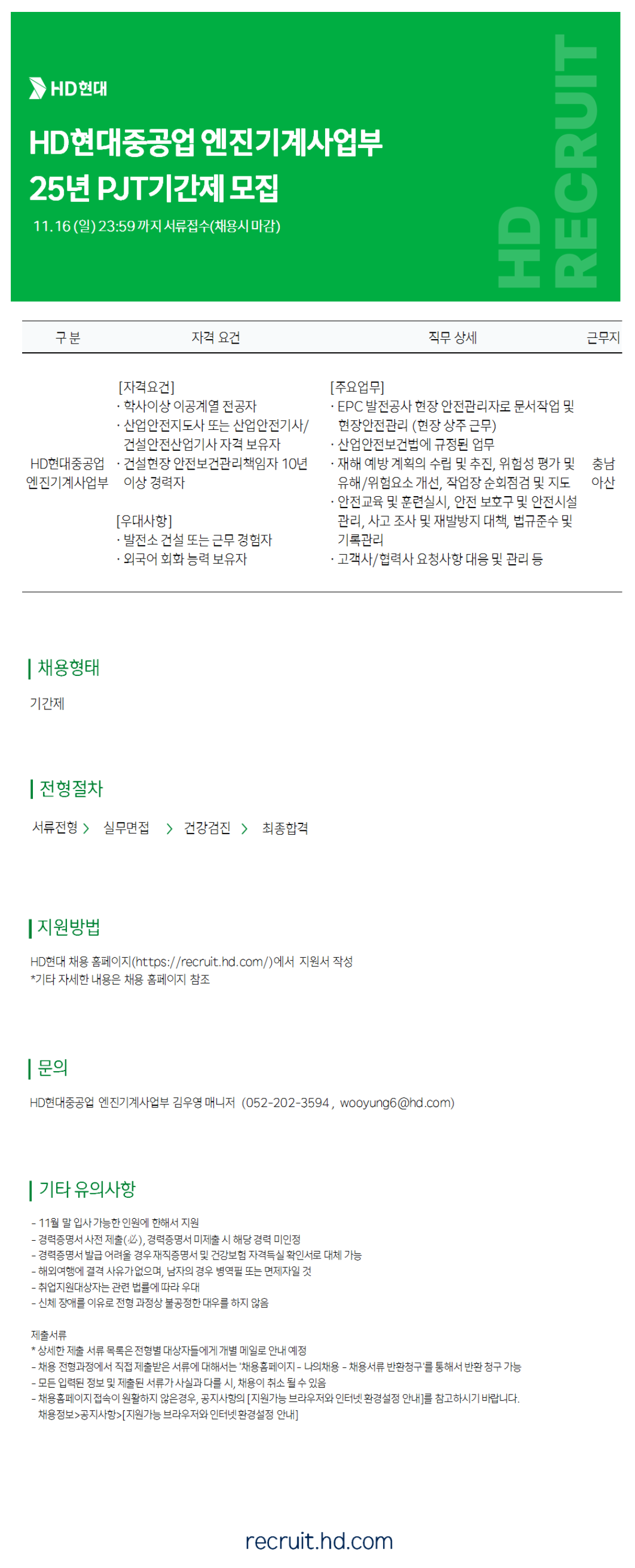[HDÇö´ëÁß°ø¾÷] ¿£Áø±â°è»ç¾÷ºÎ ¾ÈÀü°ü¸®ÀÚ ¸ðÁý °ø°í