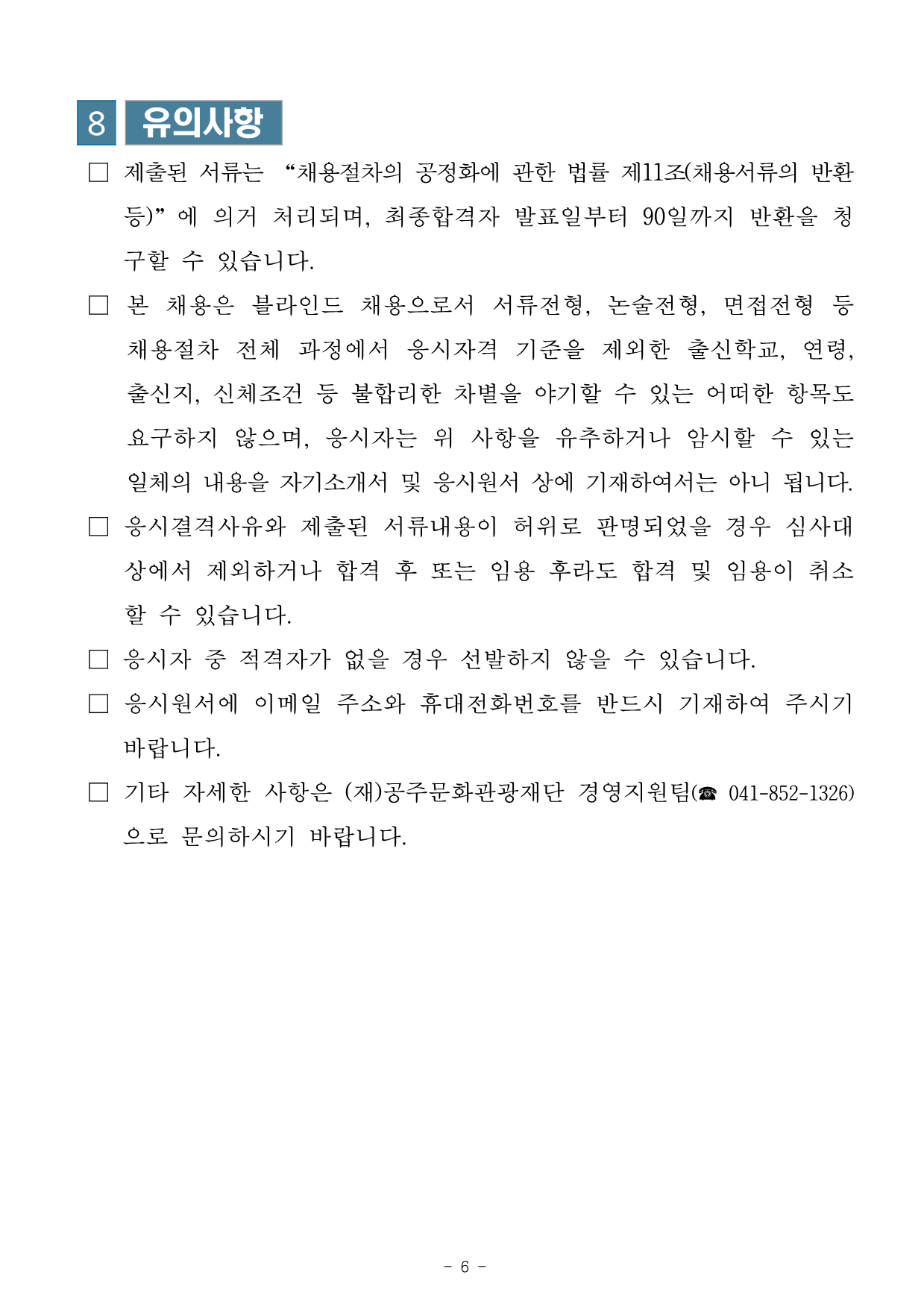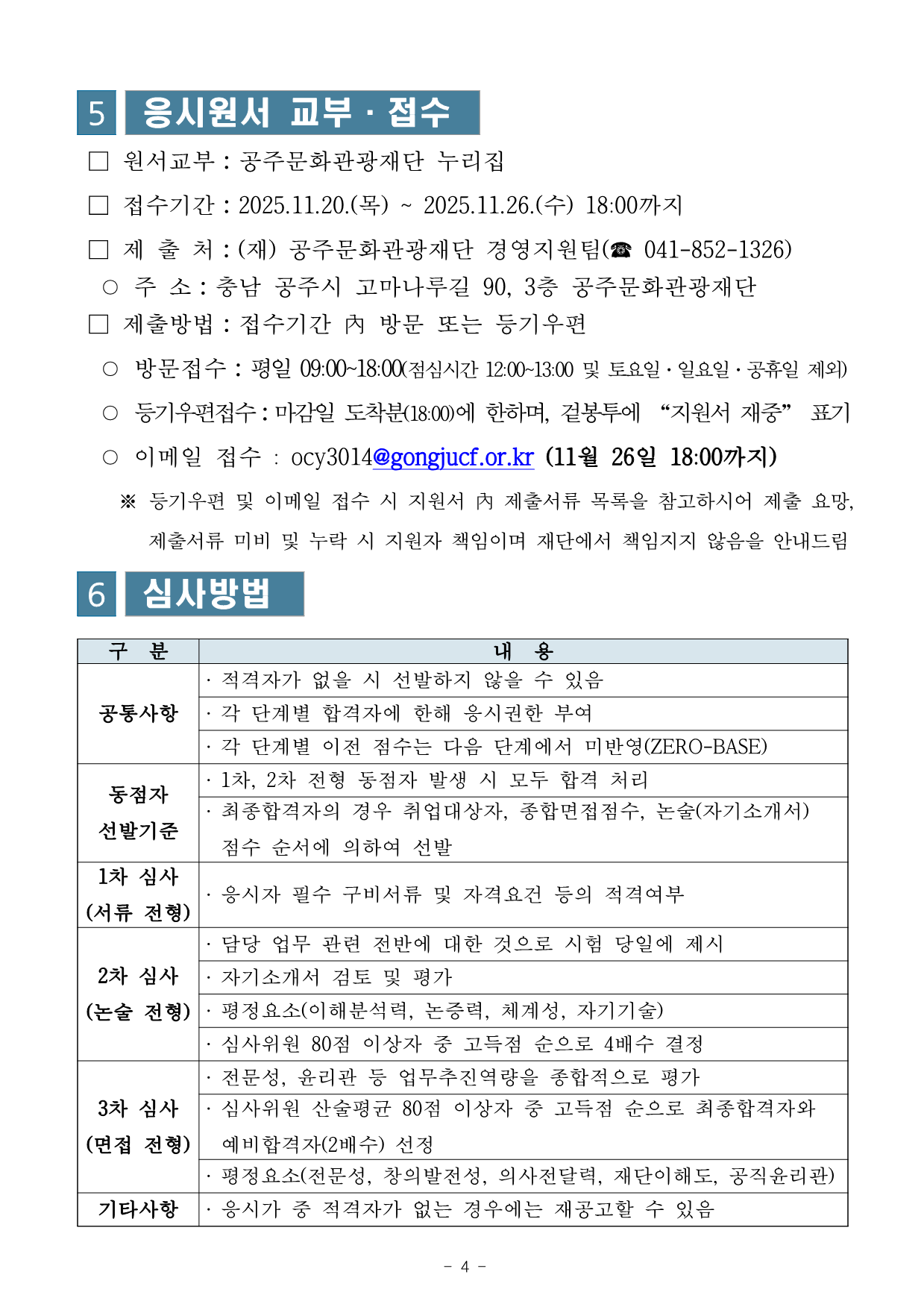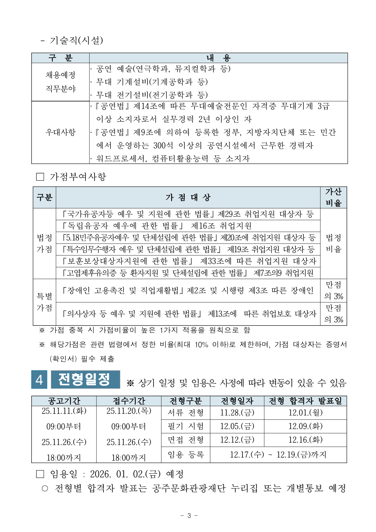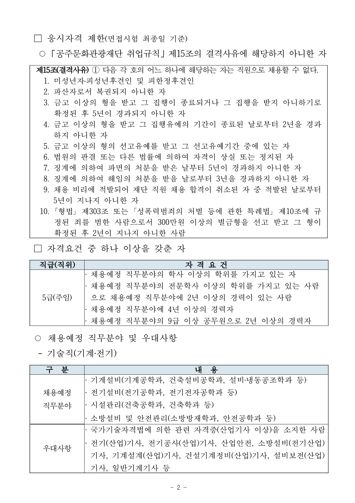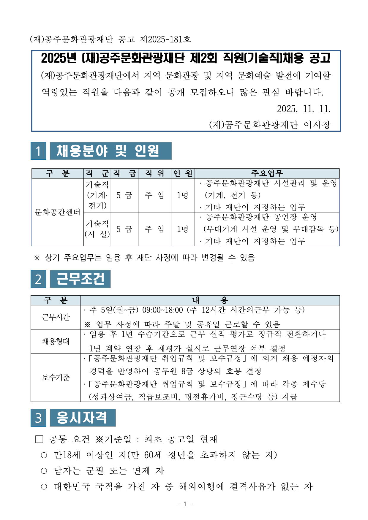 (Àç)°øÁÖ¹®È­°ü±¤Àç´Ü °ø°í Á¦2025-181È£ 2025³â (Àç)°øÁÖ¹®È­°ü±¤Àç´Ü Á¦2ȸ Á÷¿ø(±â¼úÁ÷)ä¿ë °ø°í(Àç)°øÁÖ¹®È­°ü±¤Àç´Ü¿¡¼­ Áö¿ª ¹®È­°ü±¤ ¹× Áö¿ª ¹®È­¿¹¼ú ¹ßÀü¿¡ ±â¿©ÇÒ¿ª·®ÀÖ´Â Á÷¿øÀ» ´ÙÀ½°ú °°ÀÌ °ø°³ ¸ðÁýÇÏ¿À´Ï ¸¹Àº °ü½É ¹Ù¶ø´Ï´Ù. 2025. 11. 11. (Àç)°øÁÖ¹®È­°ü±¤Àç´Ü ÀÌ»çÀå1 ä¿ëºÐ¾ß ¹× Àοø ±¸ ºÐ Á÷ ±º Á÷ ±Þ Á÷ À§ ÀÎ ¿ø ÁÖ¿ä¾÷¹« ¹®È­°ø°£¼¾ÅÍ ±â¼úÁ÷ (±â°è‧ Àü±â) 5 ±Þ ÁÖ ÀÓ 1¸í ‧ °øÁÖ¹®È­°ü±¤Àç´Ü ½Ã¼³°ü¸® ¹× ¿î¿µ (±â°è, Àü±â µî) ‧ ±âŸ Àç´ÜÀÌ ÁöÁ¤ÇÏ´Â ¾÷¹« ±â¼úÁ÷ (½Ã ¼³) 5 ±Þ ÁÖ ÀÓ 1¸í ‧ °øÁÖ¹®È­°ü±¤Àç´Ü °ø¿¬Àå ¿î¿µ (¹«´ë±â°è ½Ã¼³ ¿î¿µ ¹× ¹«´ë°¨µ¶ µî) ‧ ±âŸ Àç´ÜÀÌ ÁöÁ¤ÇÏ´Â ¾÷¹« ¡Ø »ó±â ÁÖ¿ä¾÷¹«´Â ÀÓ¿ë ÈÄ Àç´Ü »çÁ¤¿¡ µû¶ó º¯°æµÉ ¼ö ÀÖÀ½ 2 ±Ù¹«Á¶°Ç 3 ÀÀ½ÃÀÚ°Ý ¡à °øÅë ¿ä°Ç ¡Ø±âÁØÀÏ : ÃÖÃÊ °ø°íÀÏ ÇöÀç ¡Û ¸¸18¼¼ ÀÌ»óÀÎ ÀÚ(¸¸ 60¼¼ Á¤³âÀ» ÃʰúÇÏÁö ¾Ê´Â ÀÚ) ¡Û ³²ÀÚ´Â ±ºÇÊ ¶Ç´Â ¸éÁ¦ ÀÚ ¡Û ´ëÇѹα¹ ±¹ÀûÀ» °¡Áø ÀÚ Áß ÇØ¿Ü¿©Çà¿¡ °á°Ý»çÀ¯°¡ ¾ø´Â ÀÚ±¸ ºÐ ³» ¿ë ±Ù¹«½Ã°£ ‧ ÁÖ 5ÀÏ(¿ù~±Ý) 09:00~18:00 (ÁÖ 12½Ã°£ ½Ã°£¿Ü±Ù¹« °¡´É µî) ¡Ø ¾÷¹« »çÁ¤¿¡ µû¶ó ÁÖ¸» ¹× °øÈÞÀÏ ±Ù·ÎÇÒ ¼ö ÀÖÀ½ ä¿ëÇüÅ ‧ ÀÓ¿ë ÈÄ 1³â ¼ö½À±â°£À¸·Î ±Ù¹« ½ÇÀû Æò°¡·Î Á¤±ÔÁ÷ ÀüȯÇϰųª 1³â °è¾à ¿¬Àå ÈÄ ÀçÆò°¡ ½Ç½Ã·Î ±Ù¹«¿¬Àå ¿©ºÎ °áÁ¤ º¸¼ö±âÁØ ‧¡¸°øÁÖ¹®È­°ü±¤Àç´Ü Ãë¾÷±ÔÄ¢ ¹× º¸¼ö±ÔÁ¤¡¹¿¡ ÀǰŠä¿ë ¿¹Á¤ÀÚÀÇ °æ·ÂÀ» ¹Ý¿µÇÏ¿© °ø¹«¿ø 8±Þ »ó´çÀÇ È£ºÀ °áÁ¤ ‧¡¸°øÁÖ¹®È­°ü±¤Àç´Ü Ãë¾÷±ÔÄ¢ ¹× º¸¼ö±ÔÁ¤¡¹¿¡ µû¶ó °¢Á¾ Á¦¼ö´ç (¼º°ú»ó¿©±Ý, Á÷±Þº¸Á¶ºñ, ¸íÀýÈÞ°¡ºñ, Á¤±Ù¼ö´ç µî) Áö±Þ