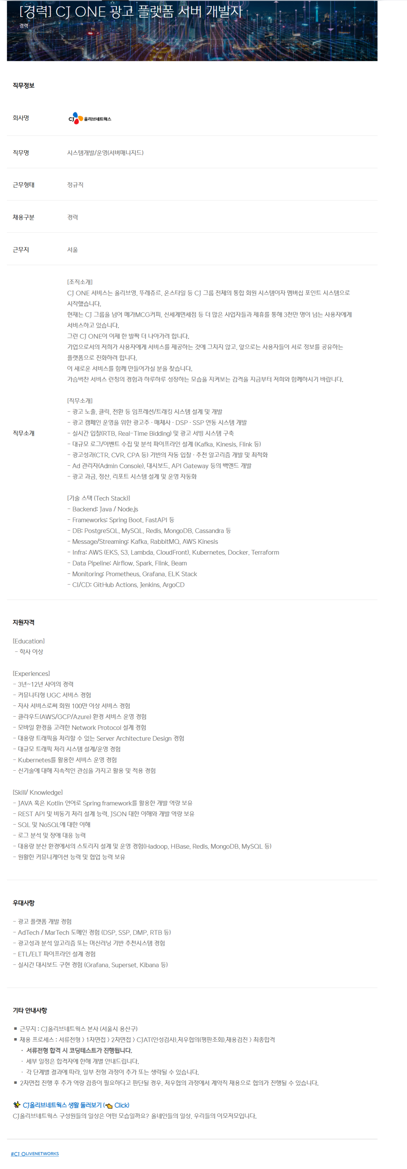 [°æ·Â] CJ ONE ±¤°í Ç÷§Æû ¼¹ö °³¹ßÀÚ