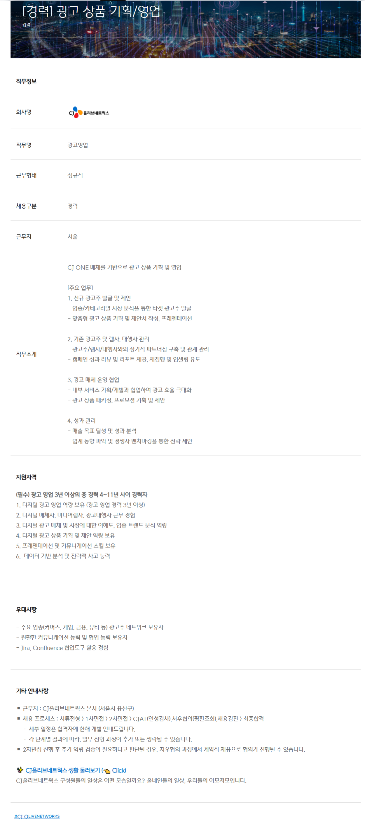 Á÷¹«¼Ò°³ CJ ONE ¸Åü¸¦ ±â¹ÝÀ¸·Î ±¤°í »óǰ ±âȹ ¹× ¿µ¾÷