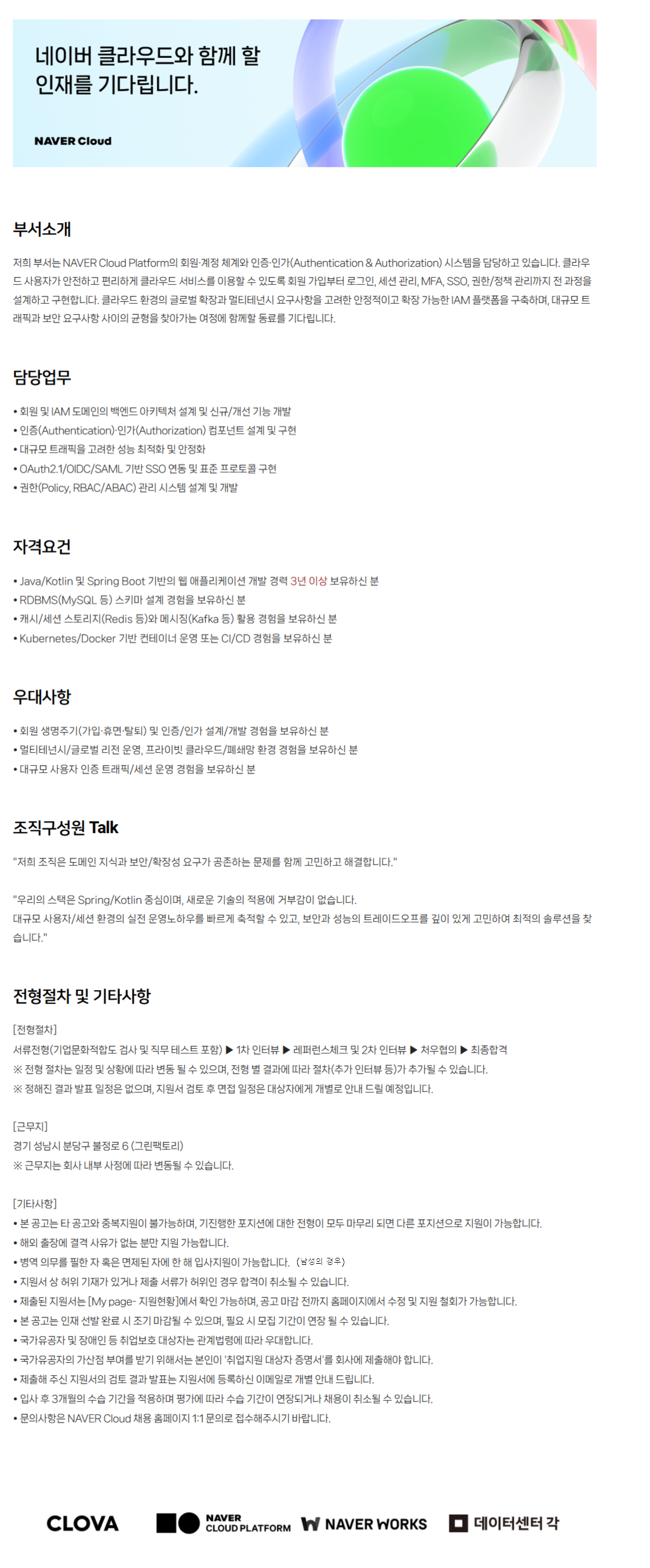 ÀúÈñ ºÎ¼´Â NAVER Cloud PlatformÀÇ È¸¿ø¡¤°èÁ¤ ü°è¿Í ÀÎÁõ¡¤Àΰ¡(Authentication & Authorization) ½Ã½ºÅÛÀ» ´ã´çÇϰí ÀÖ½À´Ï´Ù. Ŭ¶ó¿ìµå »ç¿ëÀÚ°¡ ¾ÈÀüÇÏ°í Æí¸®ÇÏ°Ô Å¬¶ó¿ìµå ¼ºñ½º¸¦ ÀÌ¿ëÇÒ ¼ö ÀÖµµ·Ï ȸ¿ø °¡ÀÔºÎÅÍ ·Î±×ÀÎ, ¼¼¼Ç °ü¸®, MFA, SSO, ±ÇÇÑ/Á¤Ã¥ °ü¸®±îÁö Àü °úÁ¤À» ¼³°èÇÏ°í ±¸ÇöÇÕ´Ï´Ù. Ŭ¶ó¿ìµå ȯ°æÀÇ ±Û·Î¹ú È®Àå°ú ¸ÖƼÅ׳ͽà ¿ä±¸»çÇ×À» °í·ÁÇÑ ¾ÈÁ¤ÀûÀ̰í È®Àå °¡´ÉÇÑ IAM Ç÷§ÆûÀ» ±¸ÃàÇϸç, ´ë±Ô¸ð Æ®·¡ÇȰú º¸¾È ¿ä±¸»çÇ× »çÀÌÀÇ ±ÕÇüÀ» ã¾Æ°¡´Â ¿©Á¤¿¡ ÇÔ²²ÇÒ µ¿·á¸¦ ±â´Ù¸³´Ï´Ù.