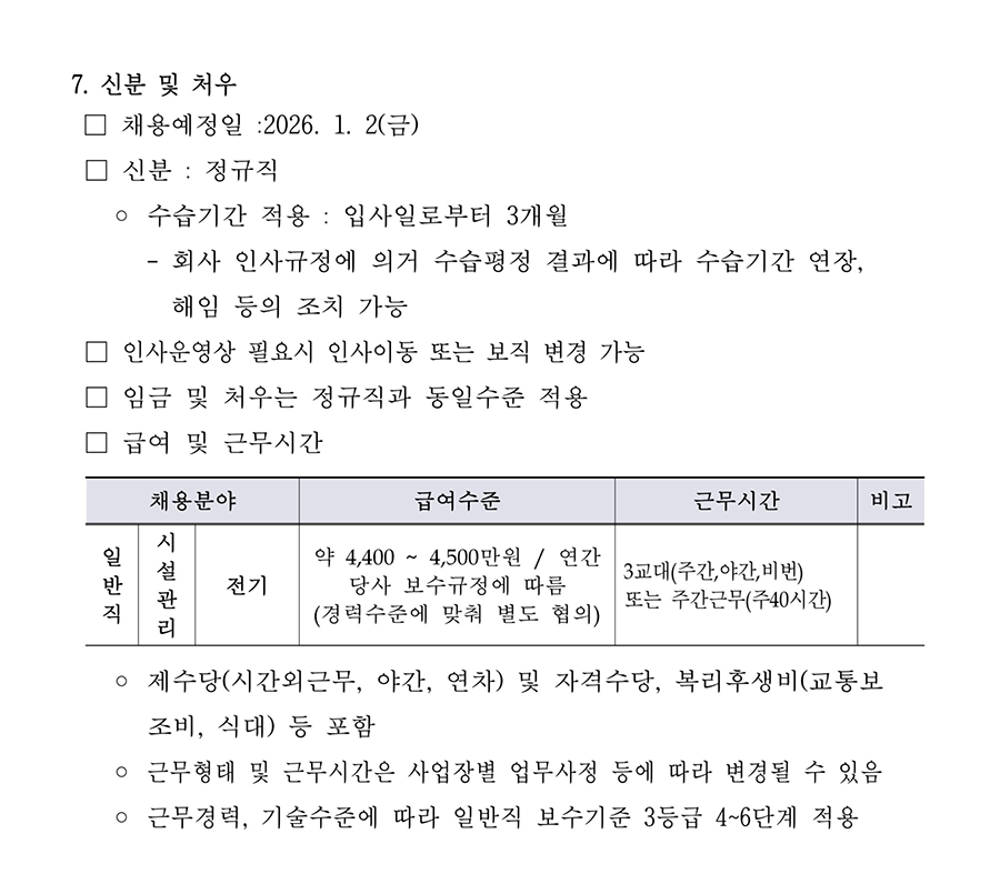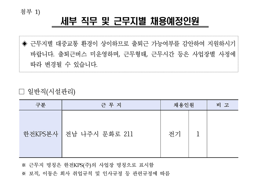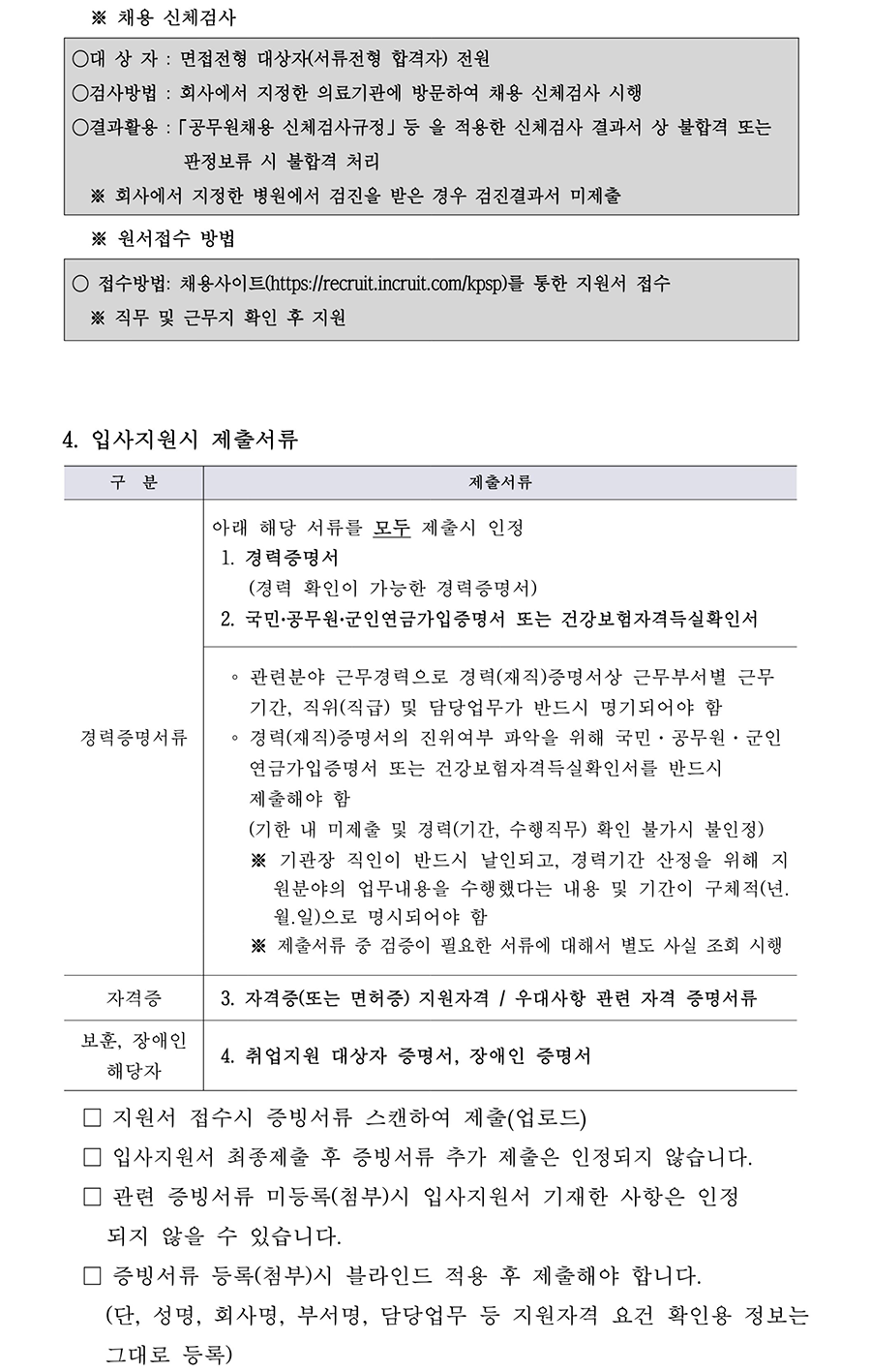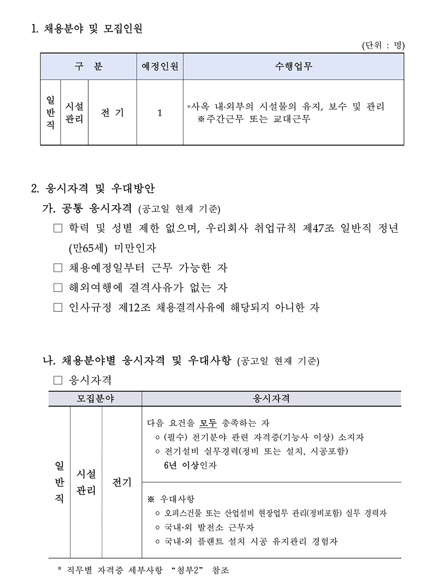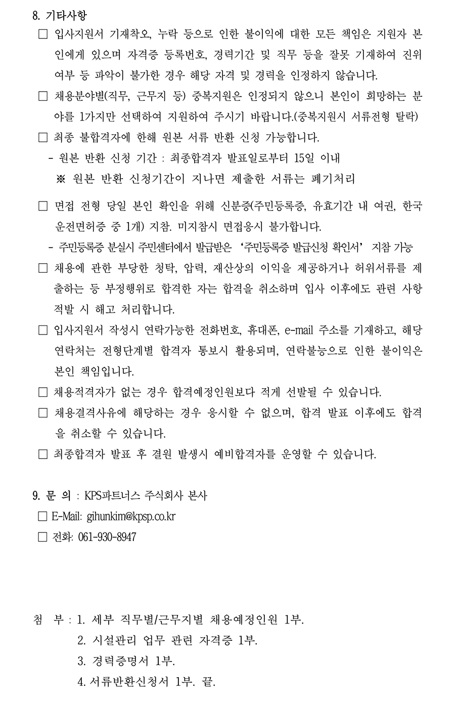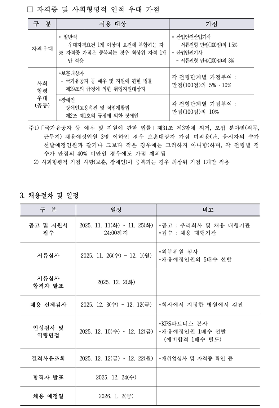 KPSP KPSÆÄÆ®³Ê½º(ÁÖ) KPSÆÄÆ®³Ê½º(ÁÖ) 2025³âµµ Á¦1Â÷ ½Ã¼³°ü¸®(°æ·ÂÁ÷) ä¿ë °ø°í KPSÆÄÆ®³Ê½º(ÁÖ)´Â ½Ã¼³¡¤¹ÌÈ­¡¤°æºñ¾÷¹« Àü¹®È¸»ç·Î¼­ ¾Æ·¡¿Í °°ÀÌ ÇÔ²²ÇÒ °æ·Â»ç¿øÀ» ¸ðÁýÇÕ´Ï´Ù. 1. ä¿ëºÐ¾ß ¹× ¸ðÁýÀοø (´ÜÀ§ : ¸í) ±¸ ºÐ ¿¹Á¤Àοø ¼öÇà¾÷¹« ÀÏ ½Ã¼³ ¡¤»ç¿Á ³»¡¤¿ÜºÎÀÇ ½Ã¼³¹°ÀÇ À¯Áö, º¸¼ö ¹× °ü¸® ¹ÝÁ÷ °ü¸® ¡Ø ÁÖ°£±Ù¹« ¶Ç´Â ±³´ë±Ù¹« Àü ±â 1 2. ÀÀ½ÃÀÚ°Ý ¹× ¿ì´ë¹æ¾È °¡. °øÅë ÀÀ½ÃÀÚ°Ý (°ø°íÀÏ ÇöÀç ±âÁØ) ¡à Çз ¹× ¼ºº° Á¦ÇÑ ¾øÀ¸¸ç, ¿ì¸®È¸»ç Ãë¾÷±ÔÄ¢ Á¦47Á¶ ÀϹÝÁ÷ Á¤³â (¸¸65¼¼) ¹Ì¸¸ÀÎÀÚ ¡à ä¿ë¿¹Á¤ÀϺÎÅÍ ±Ù¹« °¡´ÉÇÑ ÀÚ ¡à ÇØ¿Ü¿©Çà¿¡ °á°Ý»çÀ¯°¡ ¾ø´Â ÀÚ ¡à Àλç±ÔÁ¤ Á¦12Á¶ ä¿ë°á°Ý»çÀ¯¿¡ ÇØ´çµÇÁö ¾Æ´ÏÇÑ ÀÚ ³ª. ä¿ëºÐ¾ßº° ÀÀ½ÃÀÚ°Ý ¹× ¿ì´ë»çÇ× (°ø°íÀÏ ÇöÀç ±âÁØ) ¡à ÀÀ½ÃÀÚ°Ý ¸ðÁýºÐ¾ß ÀÀ½ÃÀÚ°Ý ´ÙÀ½ ¿ä°ÇÀ» ¸ðµÎ ÃæÁ·ÇÏ´Â ÀÚ ¡£ (Çʼö) Àü±âºÐ¾ß °ü·Ã ÀÚ°ÝÁõ(±â´É»ç ÀÌ»ó) ¼ÒÁöÀÚ ¡£ Àü±â¼³ºñ ½Ç¹«°æ·Â(Á¤ºñ ¶Ç´Â ¼³Ä¡, ½Ã°øÆ÷ÇÔ) ÀÏ 6³â ÀÌ»óÀÎÀÚ ½Ã¼³ ¹Ý Àü±â °ü¸® Á÷ ¡Ø ¿ì´ë»çÇ× ¡£ ¿ÀÇǽº°Ç¹° ¶Ç´Â »ê¾÷¼³ºñ ÇöÀå¾÷¹« °ü¸®(Á¤ºñÆ÷ÇÔ) ½Ç¹« °æ·ÂÀÚ ¡£ ±¹³»¡¤¿Ü ¹ßÀü¼Ò ±Ù¹«ÀÚ ¡£ ±¹³»¡¤¿Ü Ç÷£Æ® ¼³Ä¡ ½Ã°ø À¯Áö°ü¸® °æÇèÀÚ * Á÷¹«º° ÀÚ°ÝÁõ ¼¼ºÎ»çÇ× "÷ºÎ2" ÂüÁ¶ ¡à ÀÚ°ÝÁõ ¹× »çȸÇüÆòÀû ÀÎÀû ¿ì´ë °¡Á¡ ±¸ ºÐ Àû¿ë ´ë»ó °¡Á¡ ¡£ ÀϹÝÁ÷ ¡£ »ê¾÷¾ÈÀü»ê¾÷±â»ç - ¿ì´ëÀÚ°Ý¿ä°Ç 1°³ ÀÌ»óÀÇ ¿ä°Ç¿¡ ºÎÇÕÇÏ´Â ÀÚ - ¼­·ùÀüÇü ¸¸Á¡(100Á¡)ÀÇ 1.5% ÀÚ°Ý¿ì´ë ¡Ø ÀÚ°ÝÁõ °¡Á¡Àº Áߺ¹µÇ´Â °æ¿ì ÃÖ»óÀ§ ÀÚ°Ý 1°³ 0 »ê¾÷¾ÈÀü±â»ç ¸¸ Àû¿ë - ¼­·ùÀüÇü ¸¸Á¡(100Á¡)ÀÇ 3% ¡£ º¸ÈÆ´ë»óÀÚ °¢ ÀüÇü´Ü°èº° °¡Á¡ºÎ¿© : »çȸ - ±¹°¡À¯°øÀÚ µî ¿¹¿ì ¹× Áö¿ø¿¡ °üÇÑ ¹ý·ü ¸¸Á¡(100Á¡)ÀÇ 5% ~ 10% Á¦29Á¶ÀÇ ±ÔÁ¤¿¡ ÀÇÇÑ Ãë¾÷Áö¿ø´ë»óÀÚ ÇüÆò ¿ì´ë ¡¤Àå¾ÖÀÎ °¢ ÀüÇü´Ü°èº° °¡Á¡ºÎ¿© : (°øÅë) - Àå¾ÖÀΰí¿ëÃËÁø ¹× Á÷¾÷ÀçȰ¹ý ¸¸Á¡(100Á¡)ÀÇ 10% Á¦2Á¶ Á¦1È£ÀÇ ±ÔÁ¤¿¡ ÀÇÇÑ Àå¾ÖÀÎ ÁÖ1) ¡¸±¹°¡À¯°øÀÚ µî ¿¹¿ì ¹× Áö¿ø¿¡ °üÇÑ ¹ý·ü¡¹ Á¦31Á¶ Á¦3Ç׿¡ ÀǰÅ, ¸ðÁý ºÐ¾ßº°(Á÷¹«, ±Ù¹«Áö) ä¿ë¿¹Á¤Àοø 3¸í ÀÌÇÏÀÎ °æ¿ì º¸ÈÆ´ë»óÀÚ °¡Á¡ ¹ÌÀû¿ë(´Ü, ÀÀ½ÃÀÚÀÇ ¼ö°¡ ¼±¹ß¿¹Á¤Àοø°ú °°°Å³ª ±×º¸´Ù ÀûÀº °æ¿ì¿¡´Â ±×·¯ÇÏÁö ¾Æ´ÏÇÔ)Çϸç, °¢ ÀüÇüº° Á¡ ¼ö°¡ ¸¸Á¡ÀÇ 40% ¹Ì¸¸ÀÎ °æ¿ì¿¡µµ °¡Á¡ Á¦¿ÜµÊ 2) »çȸÇüÆòÀû °¡Á¡ »çÇ×(º¸ÈÆ, Àå¾ÖÀÎ)ÀÌ Áߺ¹µÇ´Â °æ¿ì ÃÖ»óÀ§ °¡Á¡ 1°³¸¸ Àû¿ë 3. ä¿ëÀýÂ÷ ¹× ÀÏÁ¤ ±¸ ºÐ ÀÏÁ¤ ºñ°í °ø°í ¹× Áö¿ø¼­ 2025. 11. 11(È­) ~ 11. 25(È­) ¡¤ °ø°í : ¿ì¸®È¸»ç ¹× ä¿ë ´ëÇà±â°ü Á¢¼ö 24:00±îÁö ¡£ Á¢¼ö : ä¿ë ´ëÇà±â°ü ¡¤¿ÜºÎÀ§¿ø ½É»ç ¼­·ù½É»ç 2025. 11. 26(¼ö) ~ 12. 1(¿ù) ¡¤Ã¤¿ë¿¹Á¤ÀοøÀÇ 5¹è¼ö ¼±¹ß ¼­·ù½É»ç 2025. 12. 2(È­) ÇÕ°ÝÀÚ ¹ßÇ¥ ä¿ë ½Åü°Ë»ç 2025. 12. 3(¼ö) ~ 12. 12(±Ý) ¡£ ȸ»ç¿¡¼­ ÁöÁ¤ÇÑ º´¿ø¿¡¼­ °ËÁø ¡¤KPSÆÄÆ®³Ê½º º»»ç Àμº°Ë»ç ¹× 2025. 12. 10(¼ö) ~ 12. 12(±Ý) ¡¤Ã¤¿ë¿¹Á¤Àοø 1¹è¼ö ¼±¹ß ¿ª·®¸éÁ¢ (¿¹ºñÇÕ°Ý 1¹è¼ö º°µµ) °á°Ý»çÀ¯Á¶È¸ 2025. 12. 12(±Ý) ~ 12. 22(¿ù) ¡£ ÀçÃë¾÷½É»ç ¹× ÀÚ°ÝÁõ È®ÀÎ µî ÇÕ°ÝÀÚ ¹ßÇ¥ 2025. 12. 24(¼ö) ä¿ë ¿¹Á¤ÀÏ 2026. 1. 2(±Ý) ¡Ø ä¿ë ½Åü°Ë»ç ¡Û´ë »ó ÀÚ : ¸éÁ¢ÀüÇü ´ë»óÀÚ(¼­·ùÀüÇü ÇÕ°ÝÀÚ) Àü¿ø ¡Û°Ë»ç¹æ¹ý : ȸ»ç¿¡¼­ ÁöÁ¤ÇÑ ÀÇ·á±â°ü¿¡ ¹æ¹®ÇÏ¿© ä¿ë ½Åü°Ë»ç ½ÃÇà ¡Û°á°úȰ¿ë : ¡¸°ø¹«¿øÃ¤¿ë ½Åü°Ë»ç±ÔÁ¤¡¹ µî À» Àû¿ëÇÑ ½Åü°Ë»ç °á°ú¼­ »ó ºÒÇÕ°Ý ¶Ç´Â ÆÇÁ¤º¸·ù ½Ã ºÒÇÕ°Ý Ã³¸® ¡Ø ȸ»ç¿¡¼­ ÁöÁ¤ÇÑ º´¿ø¿¡¼­ °ËÁøÀ» ¹ÞÀº °æ¿ì °ËÁø°á°ú¼­ ¹ÌÁ¦Ãâ ¡Ø ¿ø¼­Á¢¼ö ¹æ¹ý ¡Û Á¢¼ö¹æ¹ý: ä¿ë»çÀÌÆ®(https:/heomilimonuit.com/krapsq)¸¦ ÅëÇÑ Áö¿ø¼­ Á¢¼ö ¡Ø Á÷¹« ¹× ±Ù¹«Áö È®ÀÎ ÈÄ Áö¿ø 4. ÀÔ»çÁö¿ø½Ã Á¦Ãâ¼­·ù ±¸ ºÐ Á¦Ãâ¼­·ù ¾Æ·¡ ÇØ´ç ¼­·ù¸¦ ¸ðµÎ Á¦Ãâ½Ã ÀÎÁ¤ 1. °æ·ÂÁõ¸í¼­ (°æ·Â È®ÀÎÀÌ °¡´ÉÇÑ °æ·ÂÁõ¸í¼­) 2. ±¹¹Î¡¤°ø¹«¿ø¡¤±ºÀο¬±Ý°¡ÀÔÁõ¸í¼­ ¶Ç´Â °Ç°­º¸ÇèÀڰݵæ½ÇÈ®Àμ­ ¡£ °ü·ÃºÐ¾ß ±Ù¹«°æ·ÂÀ¸·Î °æ·Â(ÀçÁ÷)Áõ¸í¼­»ó ±Ù¹«ºÎ¼­º° ±Ù¹« ±â°£, Á÷À§(Á÷±Þ) ¹× ´ã´ç¾÷¹«°¡ ¹Ýµå½Ã ¸í±âµÇ¾î¾ß ÇÔ °æ·ÂÁõ¸í¼­·ù ¡£ °æ·Â(ÀçÁ÷)Áõ¸í¼­ÀÇ ÁøÀ§¿©ºÎ ÆÄ¾ÇÀ» À§ÇØ ±¹¹Î ¡¤ °ø¹«¿ø ¡¤ ±ºÀÎ ¿¬±Ý°¡ÀÔÁõ¸í¼­ ¶Ç´Â °Ç°­º¸ÇèÀڰݵæ½ÇÈ®Àμ­¸¦ ¹Ýµå½Ã Á¦ÃâÇØ¾ß ÇÔ (±âÇÑ ³» ¹ÌÁ¦Ãâ ¹× °æ·Â(±â°£, ¼öÇàÁ÷¹«) È®ÀÎ ºÒ°¡½Ã ºÒÀÎÁ¤) ¡Ø ±â°üÀå Á÷ÀÎÀ