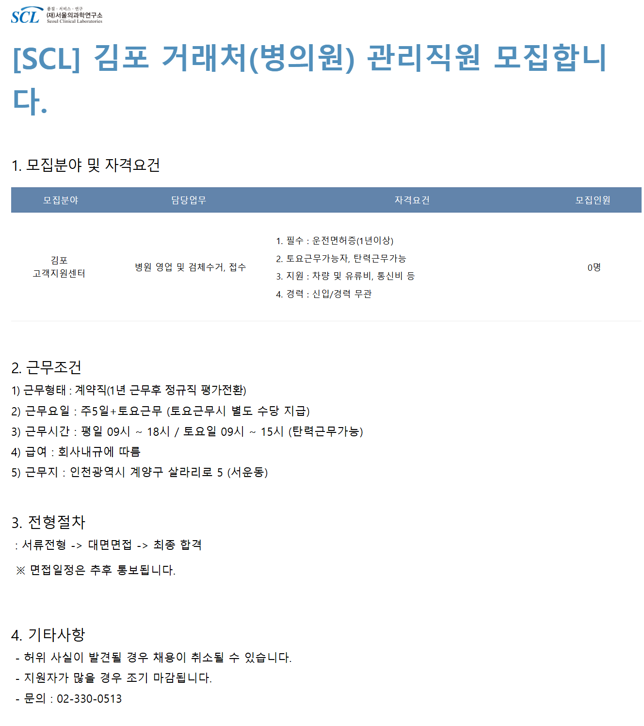 [SCL] ±èÆ÷ °Å·¡Ã³(º´ÀÇ¿ø) °ü¸®Á÷¿ø ¸ðÁýÇÕ´Ï´Ù.