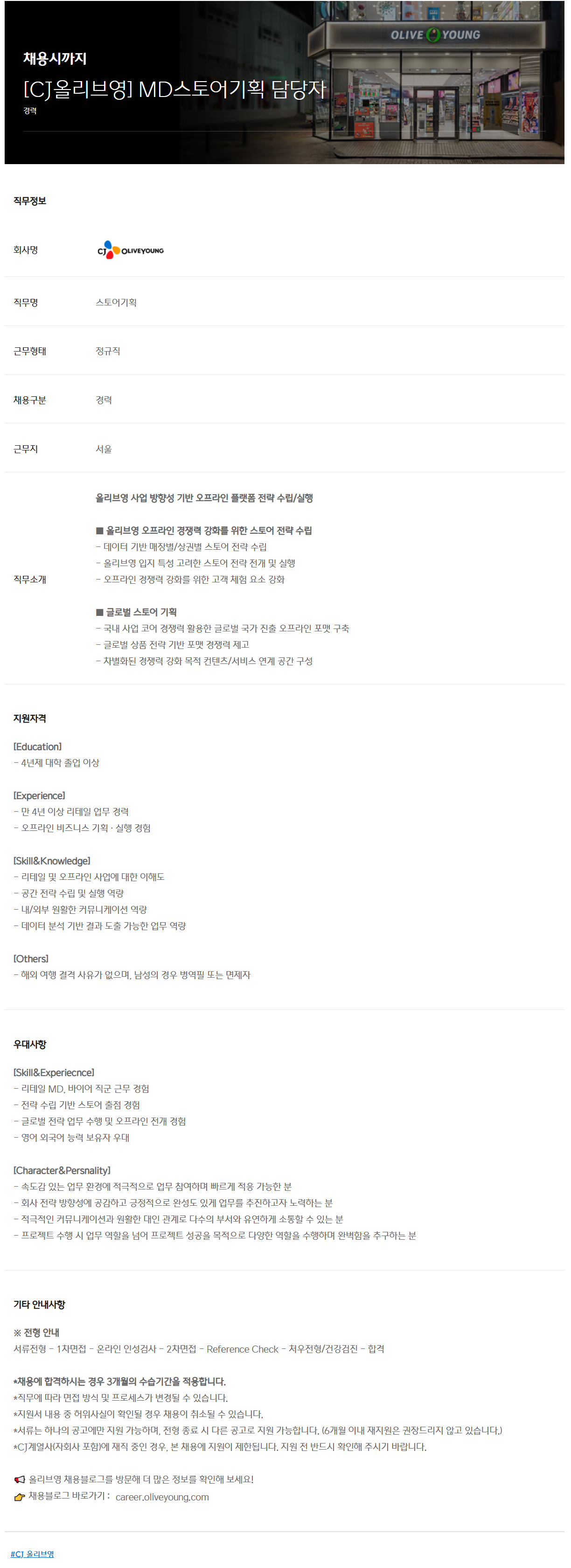 Á÷¹«¸í ½ºÅä¾î±âȹ ±Ù¹«ÇüÅ Á¤±ÔÁ÷ ä¿ë±¸ºÐ °æ·Â ±Ù¹«Áö ¼­¿ï Á÷¹«¼Ò°³ ¿Ã¸®ºê¿µ »ç¾÷ ¹æÇ⼺ ±â¹Ý ¿ÀÇÁ¶óÀÎ Ç÷§Æû Àü·« ¼ö¸³/½ÇÇà ¡á ¿Ã¸®ºê¿µ ¿ÀÇÁ¶óÀÎ °æÀï·Â °­È­¸¦ À§ÇÑ ½ºÅä¾î Àü·« ¼ö¸³ - µ¥ÀÌÅÍ ±â¹Ý ¸ÅÀ庰/»ó±Çº° ½ºÅä¾î Àü·« ¼ö¸³ - ¿Ã¸®ºê¿µ ÀÔÁö Ư¼º °í·ÁÇÑ ½ºÅä¾î Àü·« Àü°³ ¹× ½ÇÇà - ¿ÀÇÁ¶óÀÎ °æÀï·Â °­È­¸¦ À§ÇÑ °í°´ üÇè ¿ä¼Ò °­È­ ¡á ±Û·Î¹ú ½ºÅä¾î ±âȹ - ±¹³» »ç¾÷ ÄÚ¾î °æÀï·Â Ȱ¿ëÇÑ ±Û·Î¹ú ±¹°¡ ÁøÃâ ¿ÀÇÁ¶óÀÎ Æ÷¸Ë ±¸Ãà - ±Û·Î¹ú »óǰ Àü·« ±â¹Ý Æ÷¸Ë °æÀï·Â Á¦°í - Â÷º°È­µÈ °æÀï·Â °­È­ ¸ñÀû ÄÁÅÙÃ÷/¼­ºñ½º ¿¬°è °ø°£ ±¸¼º Áö¿øÀÚ°Ý [Education] - 4³âÁ¦ ´ëÇÐ Á¹¾÷ ÀÌ»ó [Experience] - ¸¸ 4³â ÀÌ»ó ¸®Å×ÀÏ ¾÷¹« °æ·Â - ¿ÀÇÁ¶óÀÎ ºñÁî´Ï½º ±âȹ¡¤½ÇÇà °æÇè [Skill&Knowledge] - ¸®Å×ÀÏ ¹× ¿ÀÇÁ¶óÀÎ »ç¾÷¿¡ ´ëÇÑ ÀÌÇØµµ - °ø°£ Àü·« ¼ö¸³ ¹× ½ÇÇà ¿ª·® - ³»/¿ÜºÎ ¿øÈ°ÇÑ Ä¿¹Â´ÏÄÉÀÌ¼Ç ¿ª·® - µ¥ÀÌÅÍ ºÐ¼® ±â¹Ý °á°ú µµÃâ °¡´ÉÇÑ ¾÷¹« ¿ª·® [Others] - ÇØ¿Ü ¿©Çà °á°Ý »çÀ¯°¡ ¾øÀ¸¸ç, ³²¼ºÀÇ °æ¿ì º´¿ªÇÊ ¶Ç´Â ¸éÁ¦ÀÚ ¿ì´ë»çÇ× [Skill&Experiecnce] - ¸®Å×ÀÏ MD, ¹ÙÀ̾î Á÷±º ±Ù¹« °æÇè - Àü·« ¼ö¸³ ±â¹Ý ½ºÅä¾î ÃâÁ¡ °æÇè - ±Û·Î¹ú Àü·« ¾÷¹« ¼öÇà ¹× ¿ÀÇÁ¶óÀÎ Àü°³ °æÇè - ¿µ¾î ¿Ü±¹¾î ´É·Â º¸À¯ÀÚ ¿ì´ë [Character&Persnality] - ¼Óµµ°¨ ÀÖ´Â ¾÷¹« ȯ°æ¿¡ Àû±ØÀûÀ¸·Î ¾÷¹« Âü¿©ÇÏ¸ç ºü¸£°Ô ÀûÀÀ °¡´ÉÇÑ ºÐ - ȸ»ç Àü·« ¹æÇ⼺¿¡ °ø°¨ÇÏ°í ±àÁ¤ÀûÀ¸·Î ¿Ï¼ºµµ ÀÖ°Ô ¾÷¹«¸¦ ÃßÁøÇϰíÀÚ ³ë·ÂÇÏ´Â ºÐ - Àû±ØÀûÀÎ Ä¿¹Â´ÏÄÉÀ̼ǰú ¿øÈ°ÇÑ ´ëÀÎ °ü°è·Î ´Ù¼öÀÇ ºÎ¼­¿Í À¯¿¬ÇÏ°Ô ¼ÒÅëÇÒ ¼ö ÀÖ´Â ºÐ - ÇÁ·ÎÁ§Æ® ¼öÇà ½Ã ¾÷¹« ¿ªÇÒÀ» ³Ñ¾î ÇÁ·ÎÁ§Æ® ¼º°øÀ» ¸ñÀûÀ¸·Î ´Ù¾çÇÑ ¿ªÇÒÀ» ¼öÇàÇÏ¸ç ¿Ïº®ÇÔÀ» Ãß±¸ÇÏ´Â ºÐ ±âŸ ¾È³»»çÇ× ¡Ø ÀüÇü ¾È³» ¼­·ùÀüÇü - 1Â÷¸éÁ¢ - ¿Â¶óÀÎ Àμº°Ë»ç - 2Â÷¸éÁ¢ - Reference Check - ó¿ìÀüÇü/°Ç°­°ËÁø - ÇÕ°Ý *ä¿ë¿¡ ÇÕ°ÝÇϽô °æ¿ì 3°³¿ùÀÇ ¼ö½À±â°£À» Àû¿ëÇÕ´Ï´Ù. *Á÷¹«¿¡ µû¶ó ¸éÁ¢ ¹æ½Ä ¹× ÇÁ·Î¼¼½º°¡ º¯°æµÉ ¼ö ÀÖ½À´Ï´Ù. *Áö¿ø¼­ ³»¿ë Áß ÇãÀ§»ç½ÇÀÌ È®À뵃 °æ¿ì ä¿ëÀÌ Ãë¼ÒµÉ ¼ö ÀÖ½À´Ï´Ù. *¼­·ù´Â ÇϳªÀÇ °ø°í¿¡¸¸ Áö¿ø °¡´ÉÇϸç, ÀüÇü Á¾·á ½Ã ´Ù¸¥ °ø°í·Î Áö¿ø °¡´ÉÇÕ´Ï´Ù. (6°³¿ù À̳» ÀçÁö¿øÀº ±ÇÀåµå¸®Áö ¾Ê°í ÀÖ½À´Ï´Ù.) *CJ°è¿­»ç(ÀÚȸ»ç Æ÷ÇÔ)¿¡ ÀçÁ÷ ÁßÀÎ °æ¿ì, º» ä¿ë¿¡ Áö¿øÀÌ Á¦Çѵ˴ϴÙ. Áö¿ø Àü ¹Ýµå½Ã È®ÀÎÇØ Áֽñ⠹ٶø´Ï´Ù. 📢 ¿Ã¸®ºê¿µ ä¿ëºí·Î±×¸¦ ¹æ¹®ÇØ ´õ ¸¹Àº Á¤º¸¸¦ È®ÀÎÇØ º¸¼¼¿ä! 👉 ä¿ëºí·Î±× ¹Ù·Î°¡±â : career.oliveyoung.com #CJ ¿Ã¸®ºê¿µ