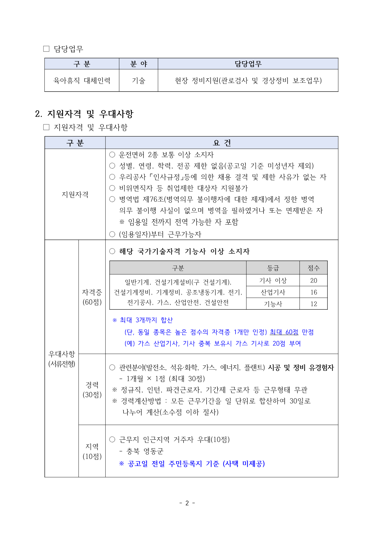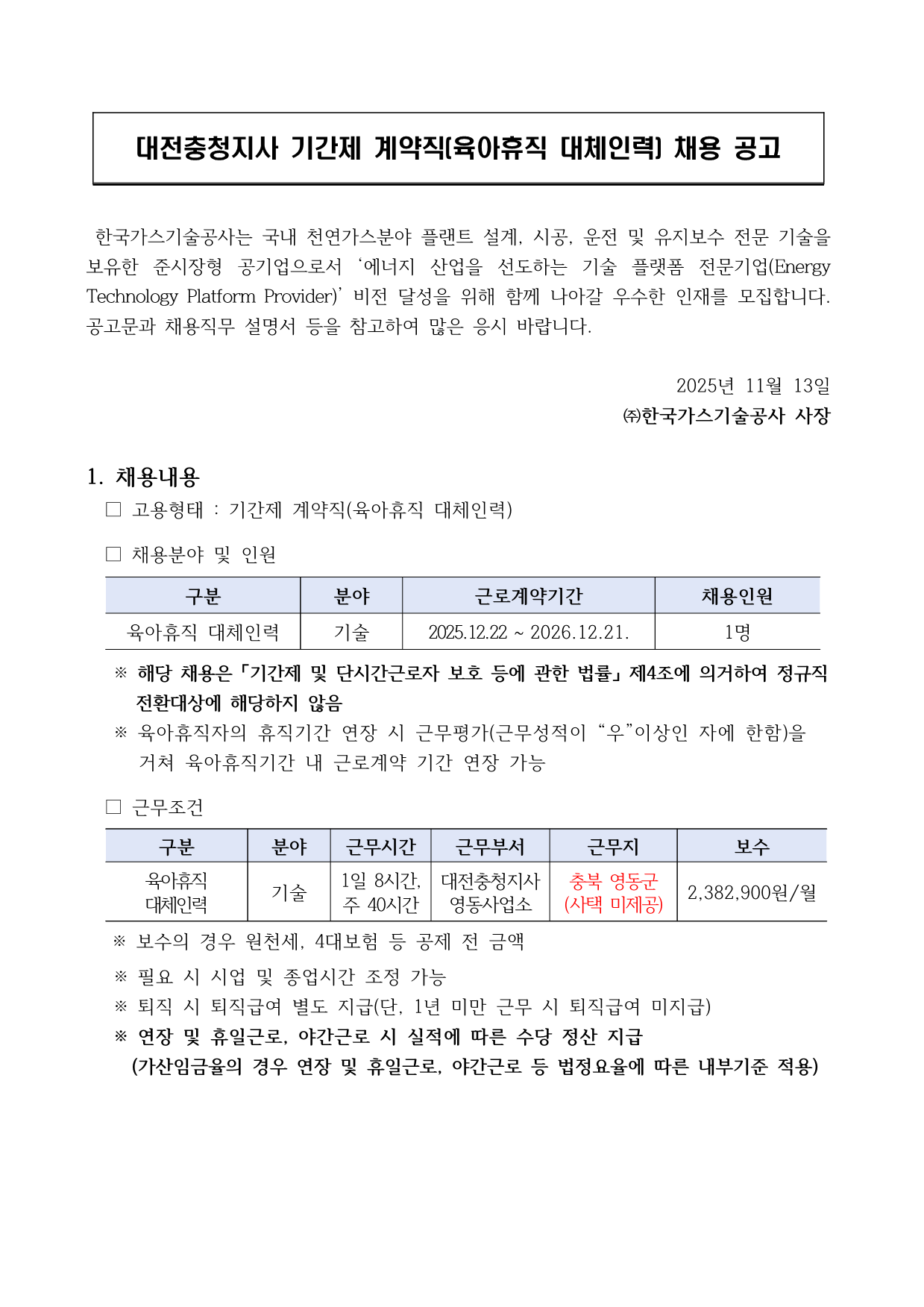 ´ëÀüÃæÃ»Áö»ç ±â°£Á¦ °è¾àÁ÷(À°¾ÆÈÞÁ÷ ´ëüÀηÂ) ä¿ë °ø°íÇѱ¹°¡½º±â¼ú°ø»ç´Â ±¹³» õ¿¬°¡½ººÐ¾ß Ç÷£Æ® ¼³°è, ½Ã°ø, ¿îÀü ¹× À¯Áöº¸¼ö Àü¹® ±â¼úÀ» º¸À¯ÇÑ ÁؽÃÀåÇü °ø±â¾÷À¸·Î¼ ¡®¿¡³ÊÁö »ê¾÷À» ¼±µµÇÏ´Â ±â¼ú Ç÷§Æû Àü¹®±â¾÷(Energy Technology Platform Provider)¡¯ ºñÀü ´Þ¼ºÀ» À§ÇØ ÇÔ²² ³ª¾Æ°¥ ¿ì¼öÇÑ ÀÎÀ縦 ¸ðÁýÇÕ´Ï´Ù. °ø°í¹®°ú ä¿ëÁ÷¹« ¼³¸í¼ µîÀ» Âü°íÇÏ¿© ¸¹Àº ÀÀ½Ã ¹Ù¶ø´Ï´Ù. 2025³â 11¿ù 13ÀÏ¢ßÇѱ¹°¡½º±â¼ú°ø»ç »çÀå1. ä¿ë³»¿ë ¡à °í¿ëÇüÅ : ±â°£Á¦ °è¾àÁ÷(À°¾ÆÈÞÁ÷ ´ëüÀηÂ) ¡à ä¿ëºÐ¾ß ¹× Àοø ±¸ºÐ ºÐ¾ß ±Ù·Î°è¾à±â°£ ä¿ëÀοø À°¾ÆÈÞÁ÷ ´ëüÀη ±â¼ú 2025.12.22 ~ 2026.12.21. 1¸í ¡Ø ÇØ´ç ä¿ëÀº ¡¸±â°£Á¦ ¹× ´Ü½Ã°£±Ù·ÎÀÚ º¸È£ µî¿¡ °üÇÑ ¹ý·ü¡¹ Á¦4Á¶¿¡ ÀǰÅÇÏ¿© Á¤±ÔÁ÷ Àüȯ´ë»ó¿¡ ÇØ´çÇÏÁö ¾ÊÀ½ ¡Ø À°¾ÆÈÞÁ÷ÀÚÀÇ ÈÞÁ÷±â°£ ¿¬Àå ½Ã ±Ù¹«Æò°¡(±Ù¹«¼ºÀûÀÌ ¡°¿ì¡±ÀÌ»óÀÎ ÀÚ¿¡ ÇÑÇÔ)À» °ÅÃÄ À°¾ÆÈÞÁ÷±â°£ ³» ±Ù·Î°è¾à ±â°£ ¿¬Àå °¡´É ¡à ±Ù¹«Á¶°Ç ±¸ºÐ ºÐ¾ß ±Ù¹«½Ã°£ ±Ù¹«ºÎ¼ ±Ù¹«Áö º¸¼ö À°¾ÆÈÞÁ÷ ´ëüÀη ±â¼ú 1ÀÏ 8½Ã°£, ÁÖ 40½Ã°£ ´ëÀüÃæÃ»Áö»ç ¿µµ¿»ç¾÷¼Ò ÃæºÏ ¿µµ¿±º (»çÅà ¹ÌÁ¦°ø) 2,382,900¿ø/¿ù ¡Ø º¸¼öÀÇ °æ¿ì ¿øÃµ¼¼, 4´ëº¸Çè µî °øÁ¦ Àü ±Ý¾× ¡Ø ÇÊ¿ä ½Ã ½Ã¾÷ ¹× Á¾¾÷½Ã°£ Á¶Á¤ °¡´É ¡Ø ÅðÁ÷ ½Ã ÅðÁ÷±Þ¿© º°µµ Áö±Þ(´Ü, 1³â ¹Ì¸¸ ±Ù¹« ½Ã ÅðÁ÷±Þ¿© ¹ÌÁö±Þ) ¡Ø ¿¬Àå ¹× ÈÞÀϱٷÎ, ¾ß°£±Ù·Î ½Ã ½ÇÀû¿¡ µû¸¥ ¼ö´ç Á¤»ê Áö±Þ (°¡»êÀÓ±ÝÀ²ÀÇ °æ¿ì ¿¬Àå ¹× ÈÞÀϱٷÎ, ¾ß°£±Ù·Î µî ¹ýÁ¤¿äÀ²¿¡ µû¸¥ ³»ºÎ±âÁØ Àû¿ë)