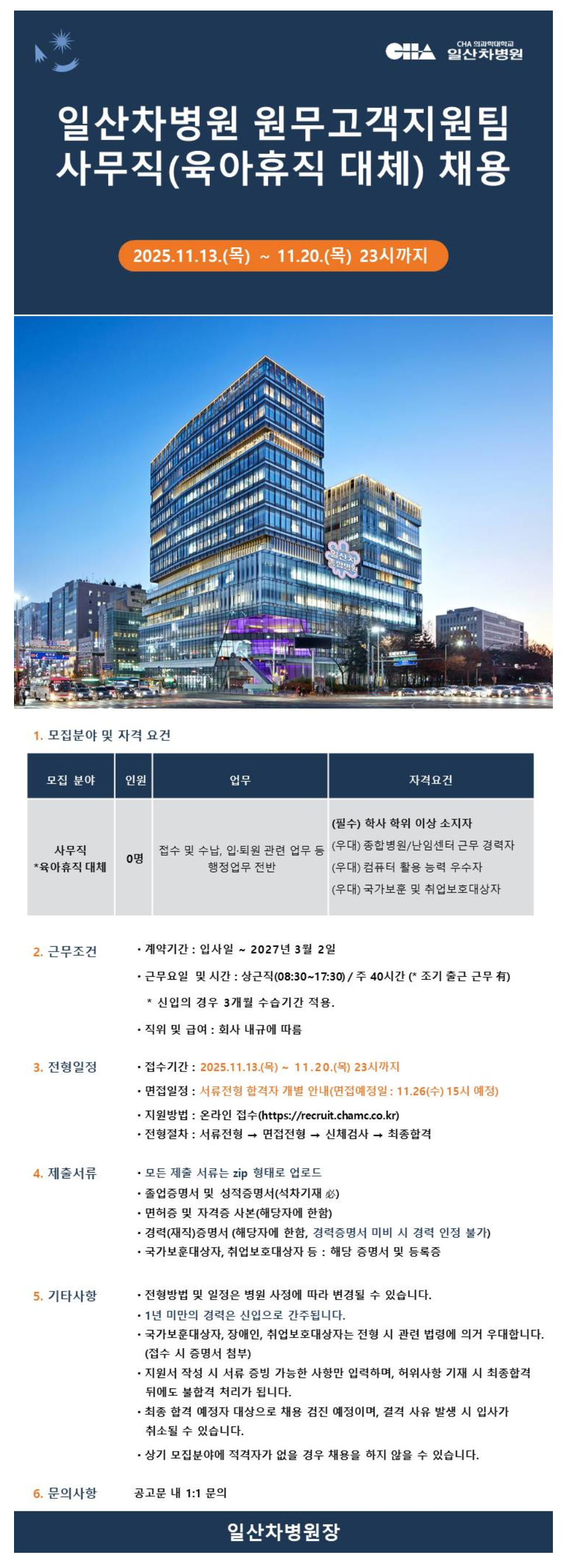 [ÀÏ»êÂ÷º´¿ø] ÀÏ»êÂ÷º´¿ø ¿ø¹«°í°´Áö¿øÆÀ(»ç¹«Á÷, À°¾ÆÈÞÁ÷ ´ëü) ä¿ë