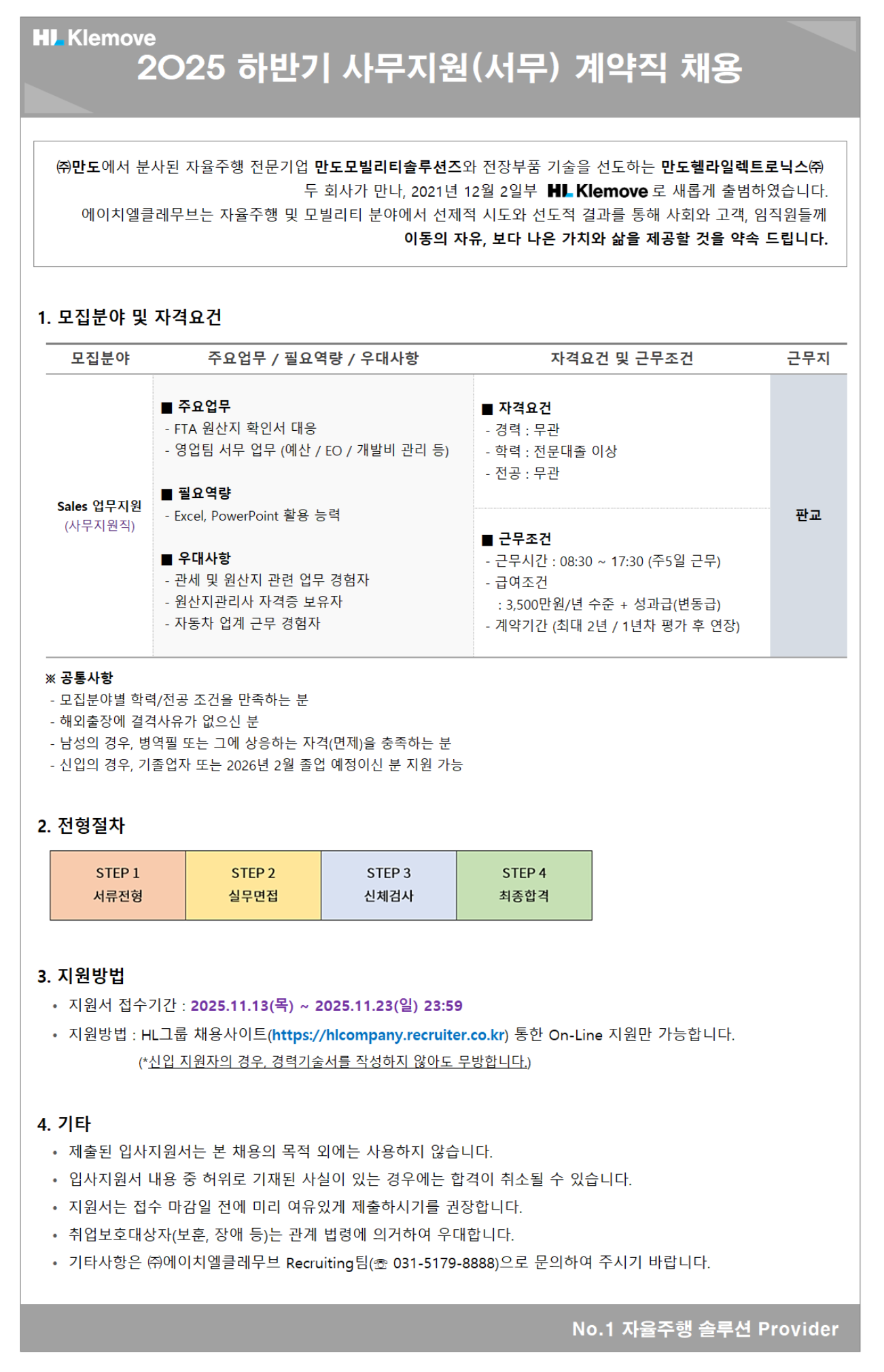 [HL Klemove] 2025 ÇϹݱ⠻繫Áö¿ø(¼¹«) °è¾àÁ÷ ä¿ë