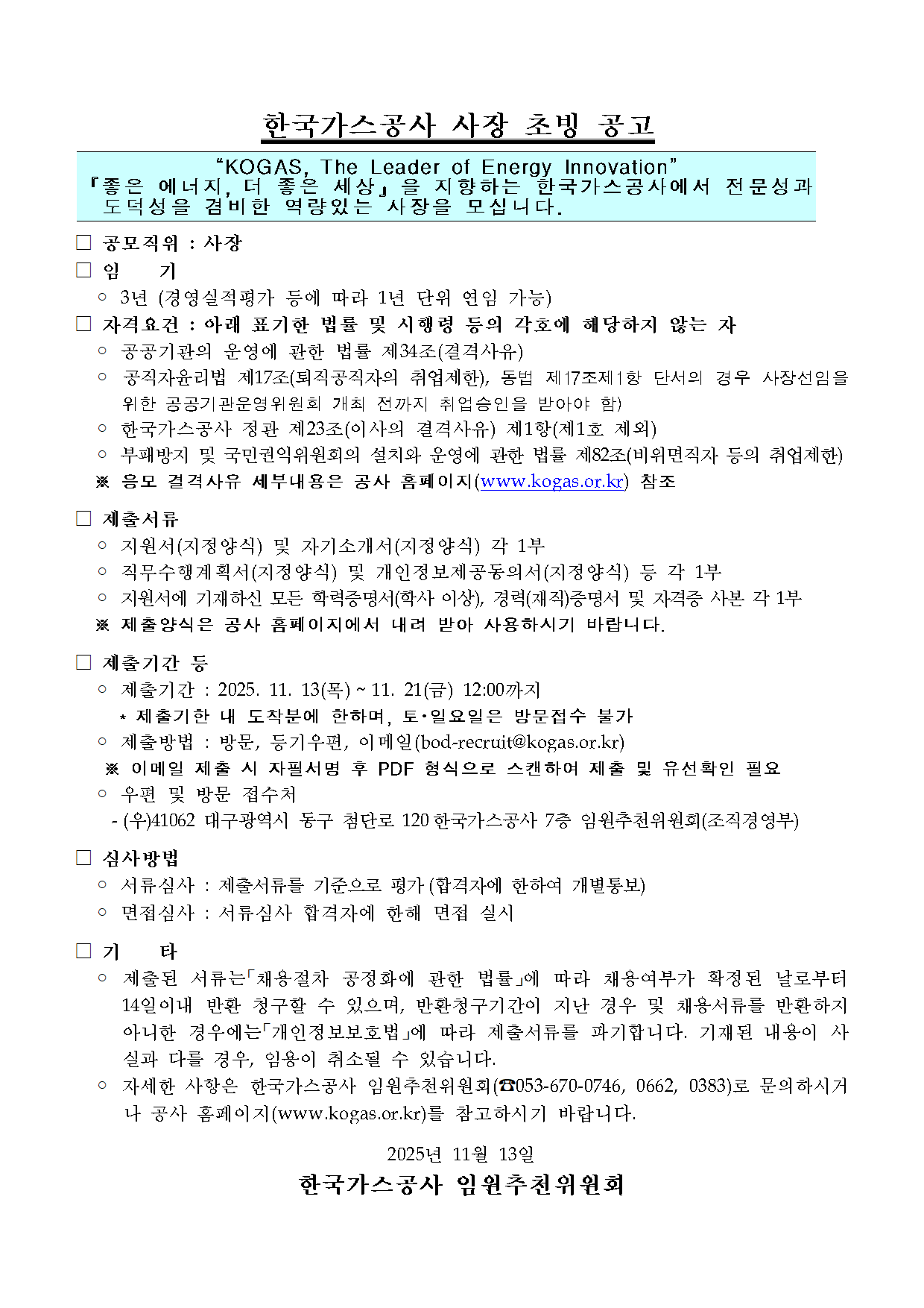 ¡°KOGAS, The Leader of Energy Innovation¡± ¡ºÁÁÀº ¿¡³ÊÁö, ´õ ÁÁÀº ¼¼»ó¡»À» ÁöÇâÇÏ´Â Çѱ¹°¡½º°ø»ç¿¡¼­ Àü¹®¼º°ú µµ´ö¼ºÀ» °âºñÇÑ ¿ª·®ÀÖ´Â »çÀåÀ» ¸ð½Ê´Ï´Ù. ¡à °ø¸ðÁ÷À§ : »çÀå ¡à ÀÓ±â ¡Û 3³â (°æ¿µ½ÇÀûÆò°¡ µî¿¡ µû¶ó 1³â ´ÜÀ§ ¿¬ÀÓ °¡´É) ¡à ÀÚ°Ý¿ä°Ç : ¾Æ·¡ Ç¥±âÇÑ ¹ý·ü ¹× ½ÃÇà·É µîÀÇ °¢È£¿¡ ÇØ´çÇÏÁö ¾Ê´Â ÀÚ ¡Û °ø°ø±â°üÀÇ ¿î¿µ¿¡ °üÇÑ ¹ý·ü Á¦34Á¶(°á°Ý»çÀ¯) ¡Û °øÁ÷ÀÚÀ±¸®¹ý Á¦17Á¶(ÅðÁ÷°øÁ÷ÀÚÀÇ Ãë¾÷Á¦ÇÑ), µ¿¹ý Á¦17Á¶Á¦1Ç× ´Ü¼­ÀÇ °æ¿ì »çÀå¼±ÀÓÀ» À§ÇÑ °ø°ø±â°ü¿î¿µÀ§¿øÈ¸ °³ÃÖ Àü±îÁö Ãë¾÷½ÂÀÎÀ» ¹Þ¾Æ¾ß ÇÔ) ¡Û Çѱ¹°¡½º°ø»ç Á¤°ü Á¦23Á¶(ÀÌ»çÀÇ °á°Ý»çÀ¯) Á¦1Ç×(Á¦1È£ Á¦¿Ü) ¡Û ºÎÆÐ¹æÁö ¹× ±¹¹Î±ÇÀÍÀ§¿øÈ¸ÀÇ ¼³Ä¡¿Í ¿î¿µ¿¡ °üÇÑ ¹ý·ü Á¦82Á¶(ºñÀ§¸éÁ÷ÀÚ µîÀÇ Ãë¾÷Á¦ÇÑ) ¡Ø ÀÀ¸ð °á°Ý»çÀ¯ ¼¼ºÎ³»¿ëÀº °ø»ç ȨÆäÀÌÁö(www.kogas.or.kr) ÂüÁ¶ ¡à Á¦Ãâ¼­·ù ¡Û Áö¿ø¼­(ÁöÁ¤¾ç½Ä) ¹× ÀÚ±â¼Ò°³¼­(ÁöÁ¤¾ç½Ä) °¢ 1ºÎ ¡Û Á÷¹«¼öÇà°èȹ¼­(ÁöÁ¤¾ç½Ä) ¹× °³ÀÎÁ¤º¸Á¦°øµ¿ÀǼ­(ÁöÁ¤¾ç½Ä) µî °¢ 1ºÎ ¡Û Áö¿ø¼­¿¡ ±âÀçÇϽЏðµç ÇзÂÁõ¸í¼­(Çлç ÀÌ»ó), °æ·Â(ÀçÁ÷)Áõ¸í¼­ ¹× ÀÚ°ÝÁõ »çº» °¢ 1ºÎ ¡Ø Á¦Ãâ¾ç½ÄÀº °ø»ç ȨÆäÀÌÁö¿¡¼­ ³»·Á ¹Þ¾Æ »ç¿ëÇϽñ⠹ٶø´Ï´Ù. ¡à Á¦Ãâ±â°£ µî ¡Û Á¦Ãâ±â°£ : 2025. 11. 13(¸ñ)~11. 21(±Ý) 12:00±îÁö * Á¦Ãâ±âÇÑ ³» µµÂøºÐ¿¡ ÇÑÇϸç, Å䡤ÀÏ¿äÀÏÀº ¹æ¹®Á¢¼ö ºÒ°¡ ¡Û Á¦Ãâ¹æ¹ý : ¹æ¹®, µî±â¿ìÆí, À̸ÞÀÏ(******@*******.***) ¡Ø À̸ÞÀÏ Á¦Ã⠽à ÀÚÇʼ­¸í ÈÄ PDF Çü½ÄÀ¸·Î ½ºÄµÇÏ¿© Á¦Ãâ ¹× À¯¼±È®ÀÎ ÇÊ¿ä ¡Û ¿ìÆí ¹× ¹æ¹® Á¢¼öó -(¿ì)41062 ´ë±¸±¤¿ª½Ã µ¿±¸ ÷´Ü·Î 120Çѱ¹°¡½º°ø»ç 7Ãþ ÀÓ¿øÃßõÀ§¿øÈ¸(Á¶Á÷°æ¿µºÎ) ¡à ½É»ç¹æ¹ý ¡Û ¼­·ù½É»ç : Á¦Ãâ¼­·ù¸¦ ±âÁØÀ¸·Î Æò°¡(ÇÕ°ÝÀÚ¿¡ ÇÑÇÏ¿© °³º°Å뺸) ¡Û ¸éÁ¢½É»ç : ¼­·ù½É»ç ÇÕ°ÝÀÚ¿¡ ÇÑÇØ ¸éÁ¢ ½Ç½Ã ¡à ±âŸ ¡Û Á¦ÃâµÈ ¼­·ù´Â¡¸Ã¤¿ëÀýÂ÷ °øÁ¤È­¿¡ °üÇÑ ¹ý·ü¡¹¿¡ µû¶ó ä¿ë¿©ºÎ°¡ È®Á¤µÈ ³¯·ÎºÎÅÍ 14ÀÏÀ̳» ¹Ýȯ û±¸ÇÒ ¼ö ÀÖÀ¸¸ç, ¹Ýȯû±¸±â°£ÀÌ Áö³­ °æ¿ì ¹× ä¿ë¼­·ù¸¦ ¹ÝȯÇÏÁö ¾Æ´ÏÇÑ °æ¿ì¿¡´Â¡¸°³ÀÎÁ¤º¸º¸È£¹ý¡¹¿¡ µû¶ó Á¦Ãâ¼­·ù¸¦ ÆÄ±âÇÕ´Ï´Ù. ±âÀçµÈ ³»¿ëÀÌ »ç½Ç°ú ´Ù¸¦ °æ¿ì, ÀÓ¿ëÀÌ Ãë¼ÒµÉ ¼ö ÀÖ½À´Ï´Ù. ¡Û ÀÚ¼¼ÇÑ »çÇ×Àº Çѱ¹°¡½º°ø»ç ÀÓ¿øÃßõÀ§¿øÈ¸(¢Ï***-****-****, 0662, 0383)·Î ¹®ÀÇÇϽðųª °ø»ç ȨÆäÀÌÁö(www.kogas.or.kr)¸¦ Âü°íÇϽñ⠹ٶø´Ï´Ù. 2025³â 11¿ù 13ÀÏ Çѱ¹°¡½º°ø»ç ÀÓ¿øÃßõÀ§¿øÈ¸